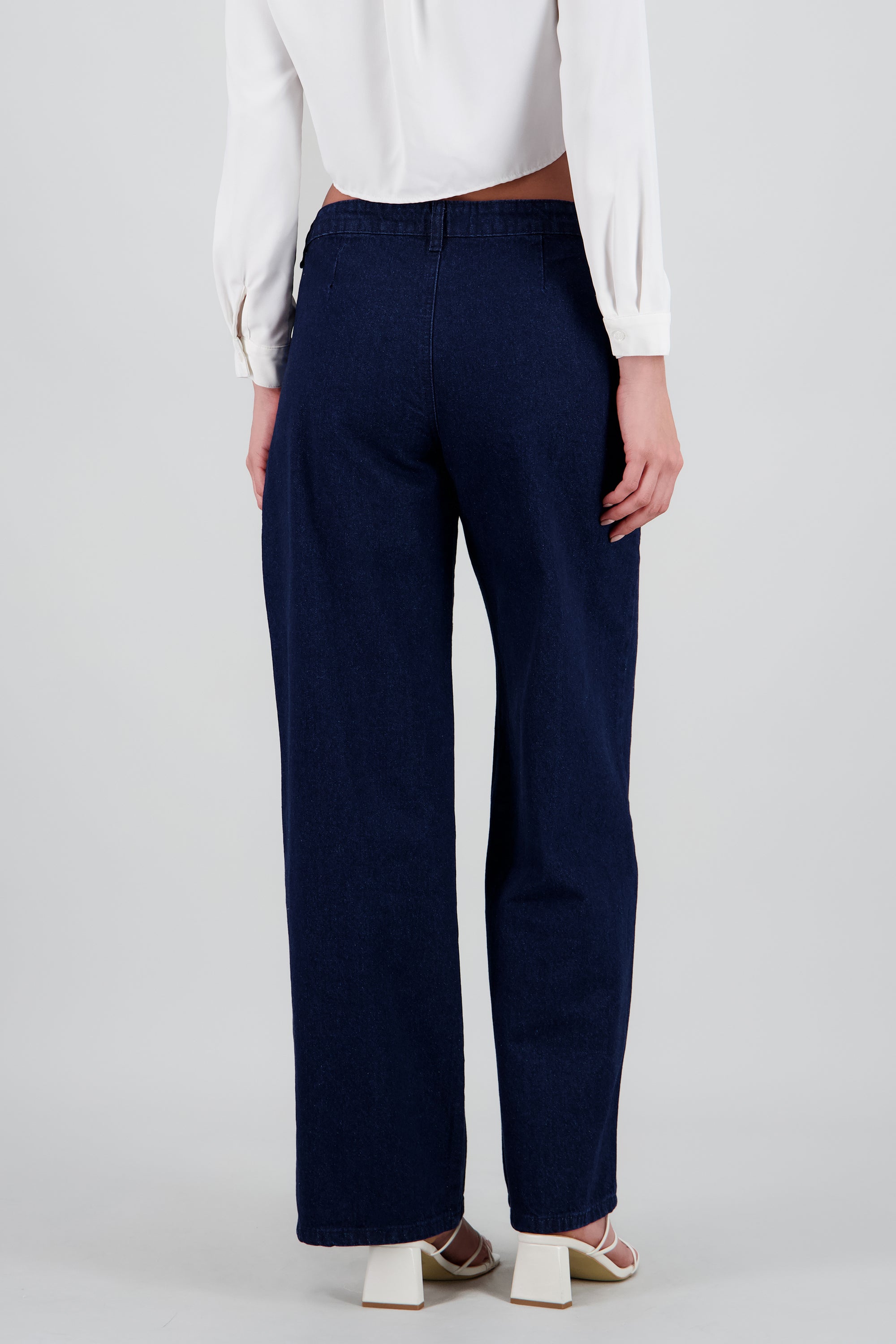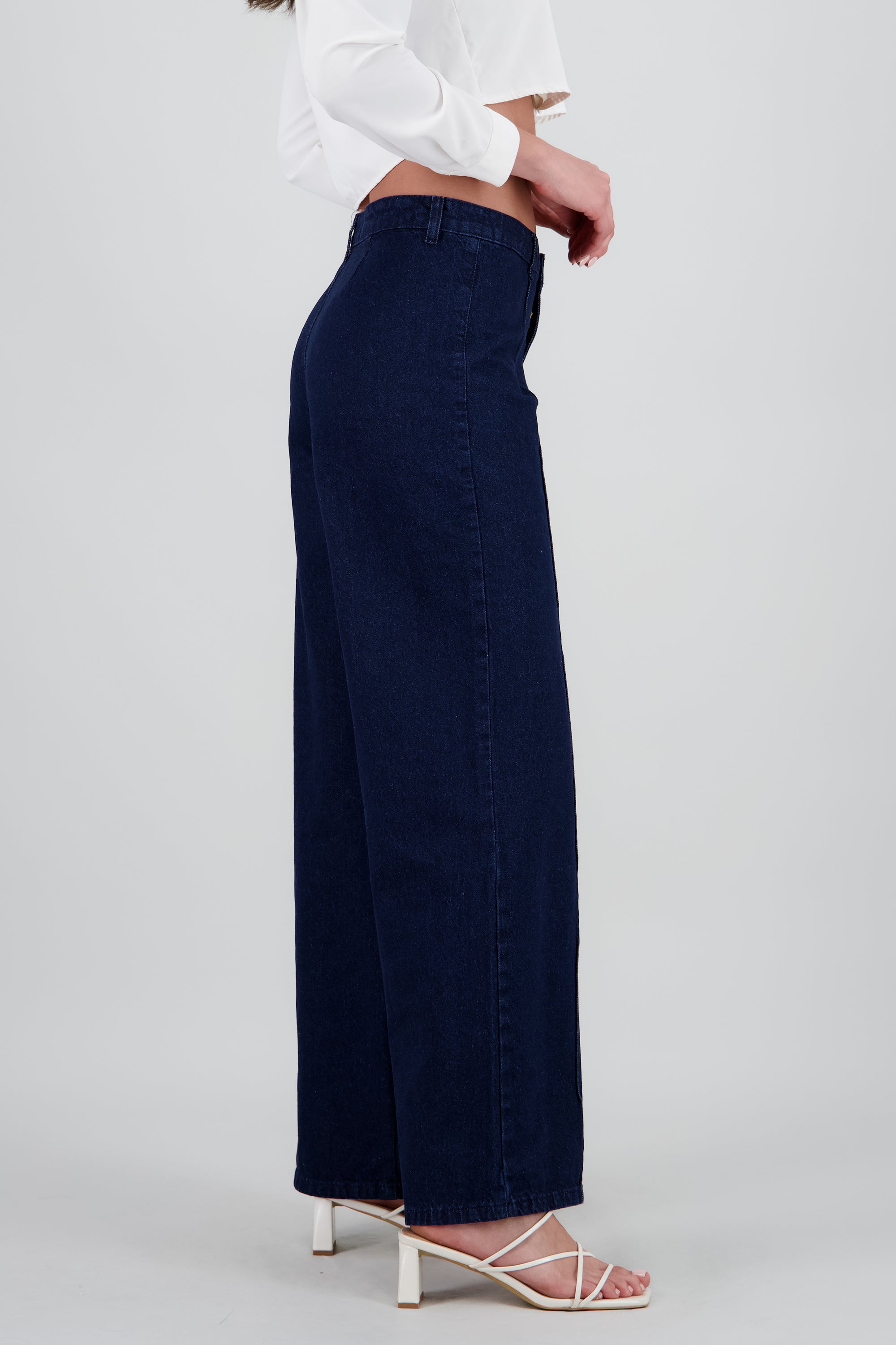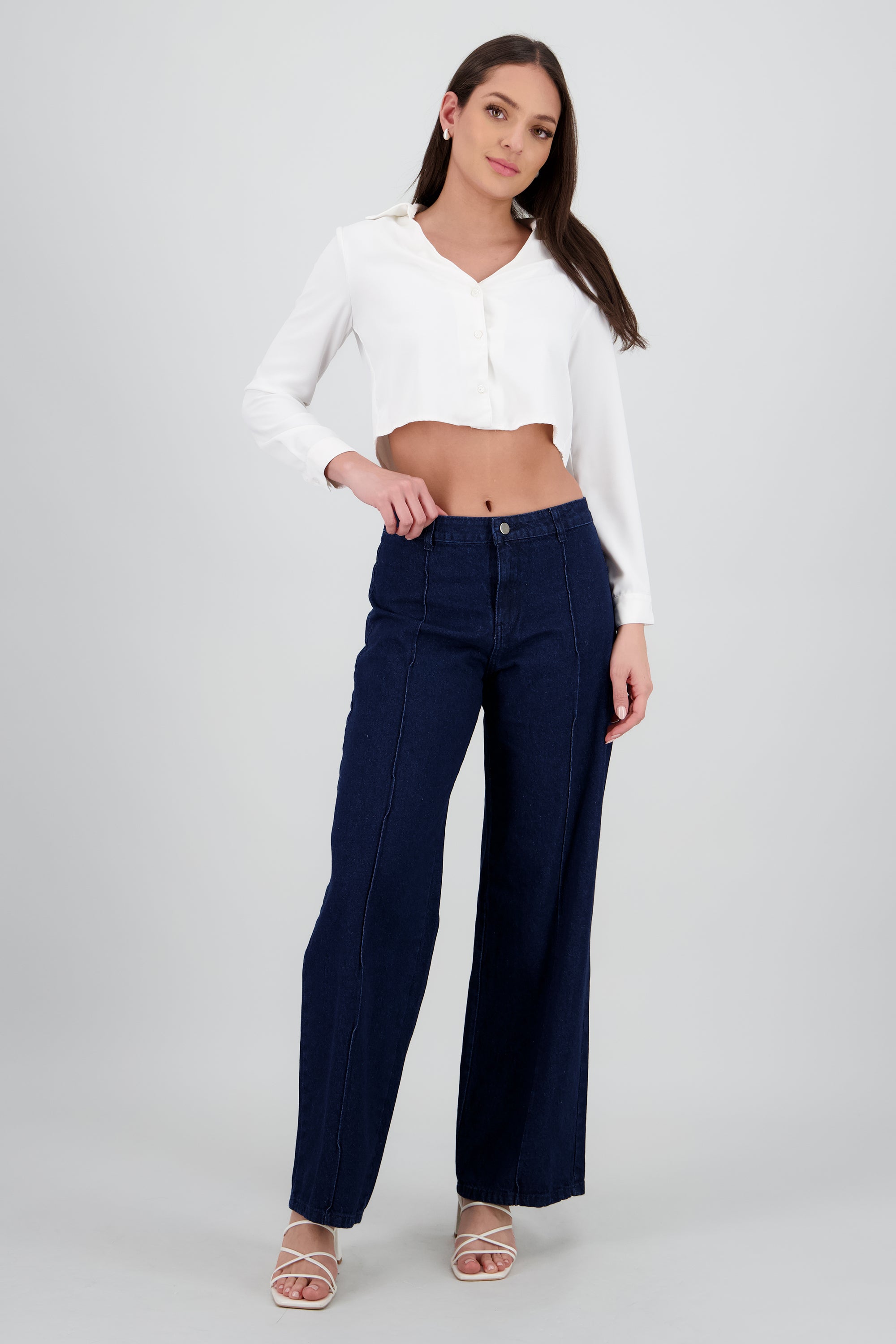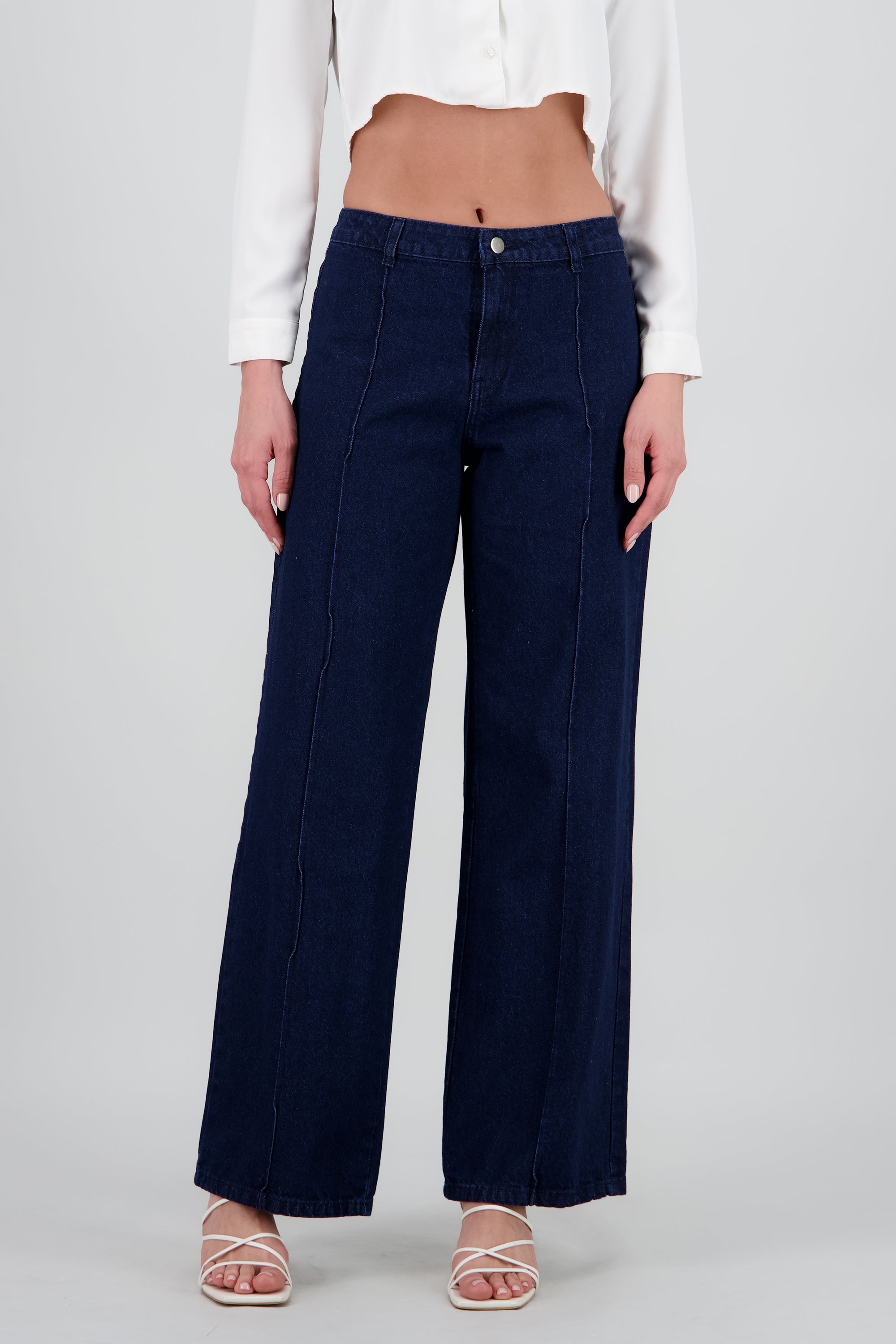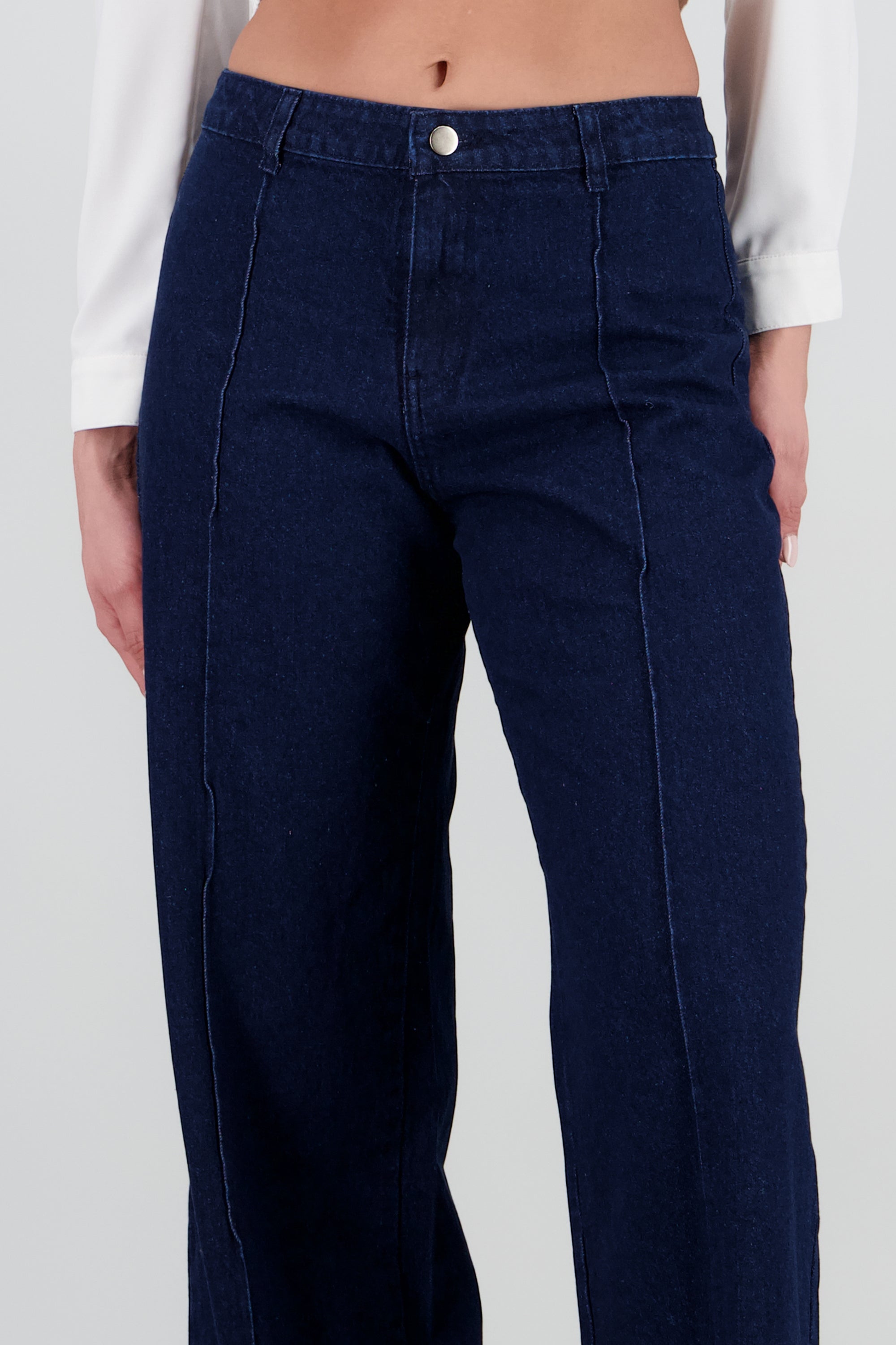 Jeans con costura al frente, corte ajustado. Cierre de botón y cremallera.