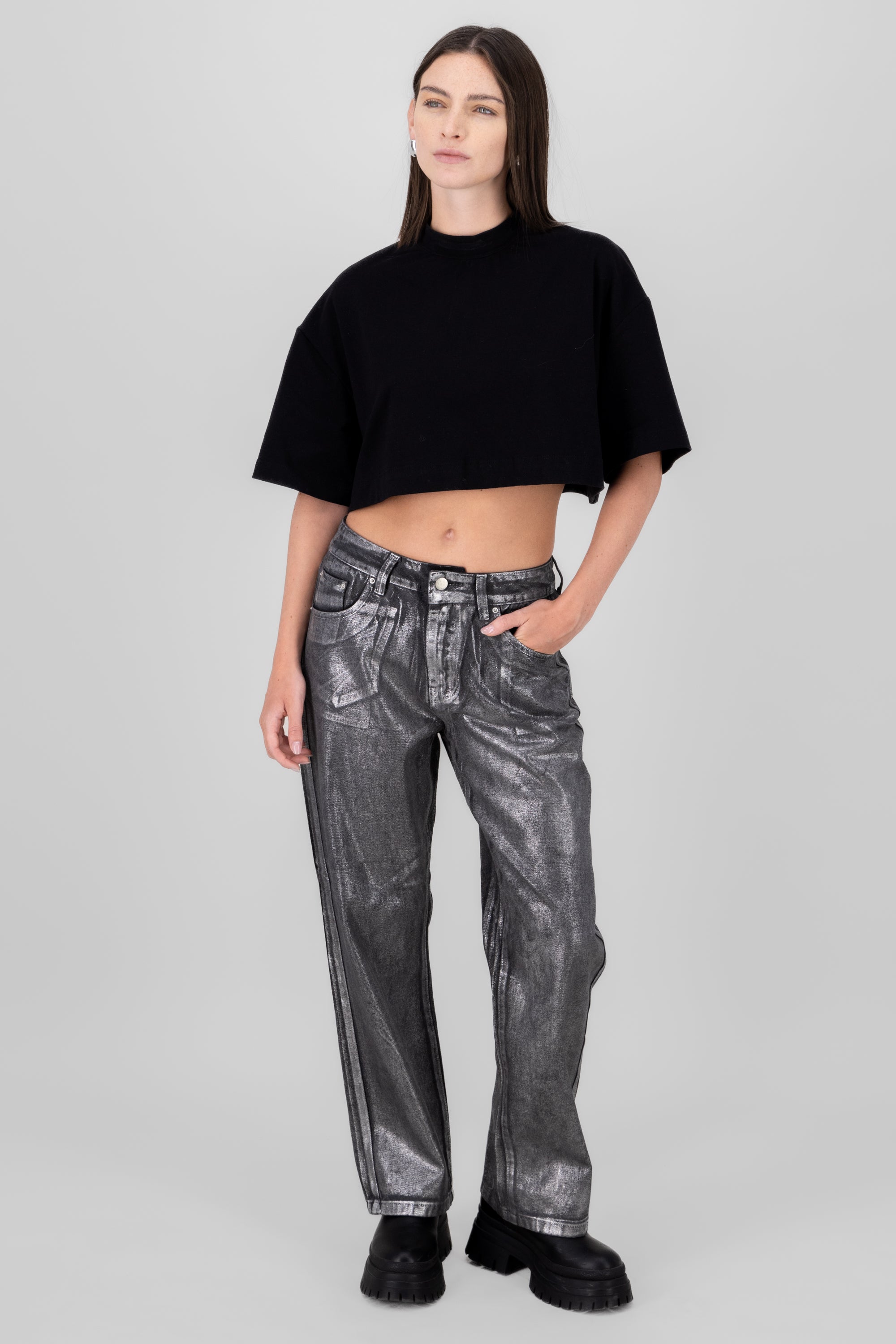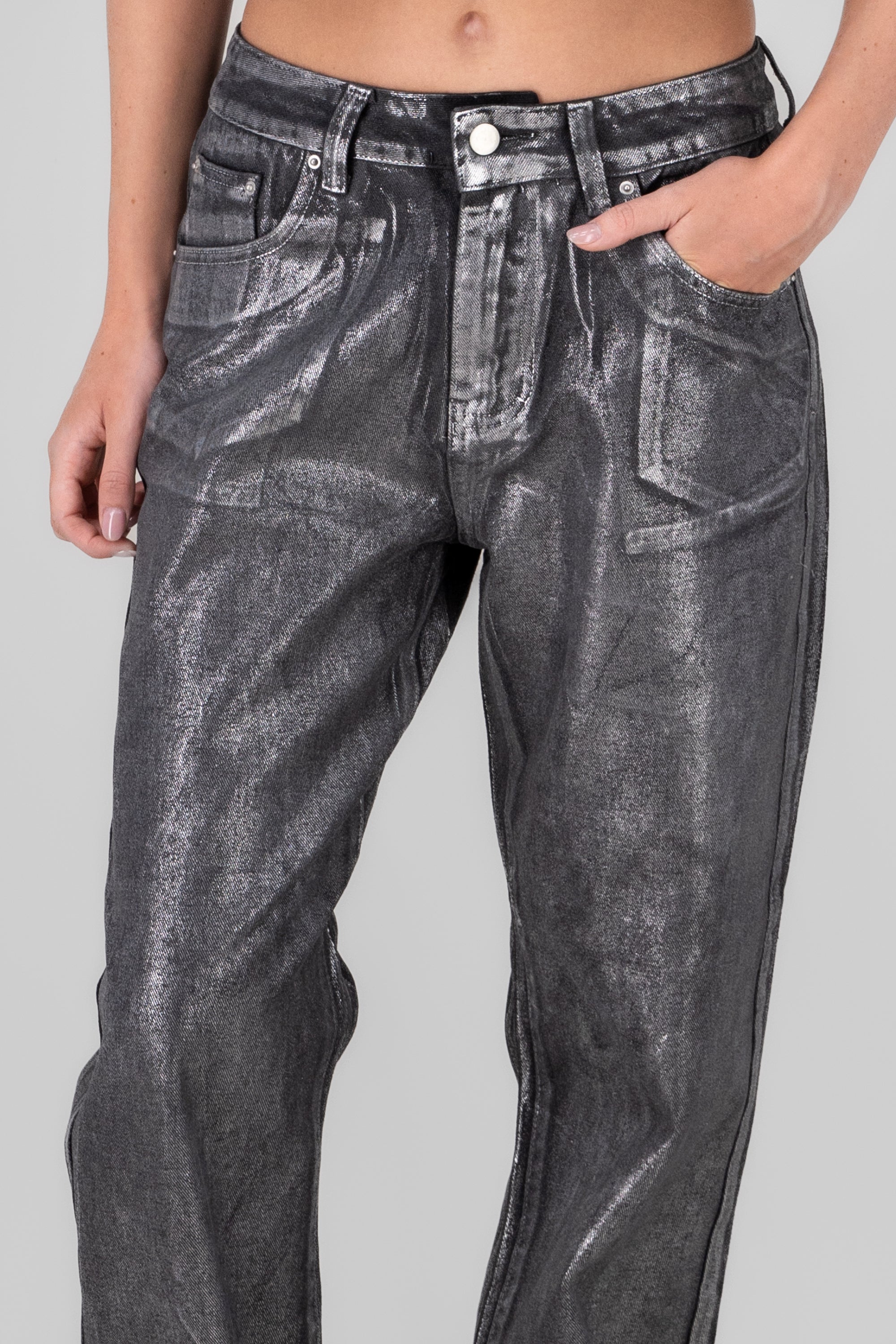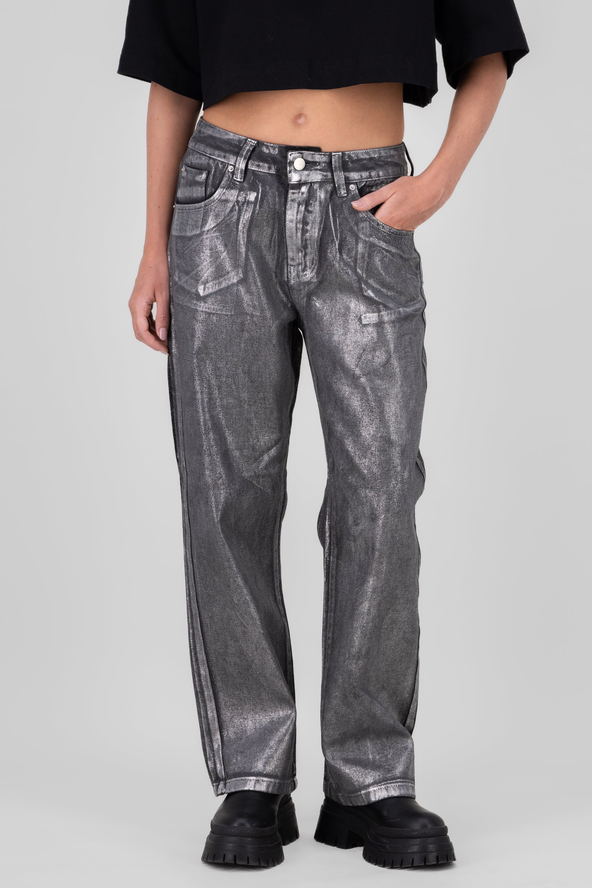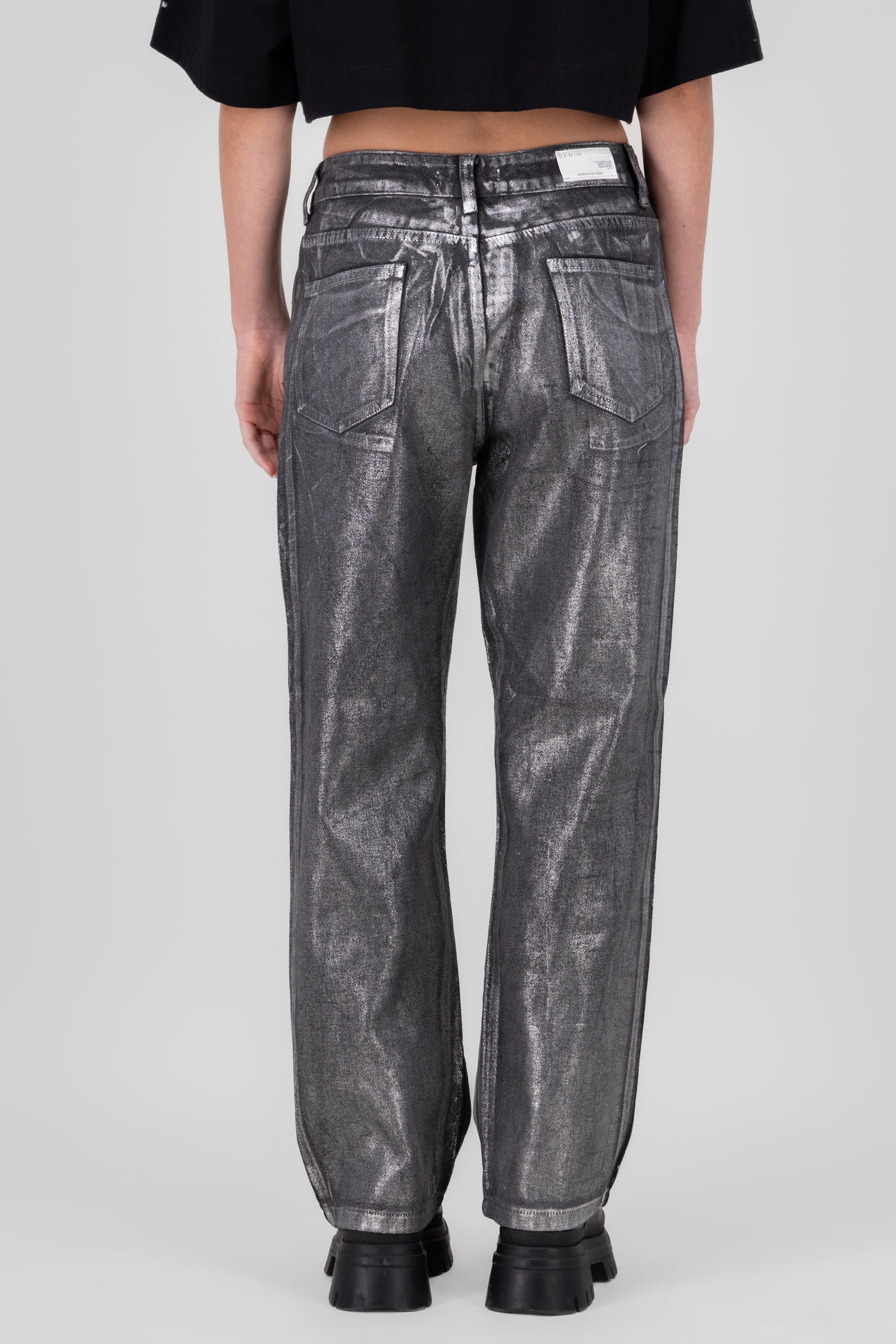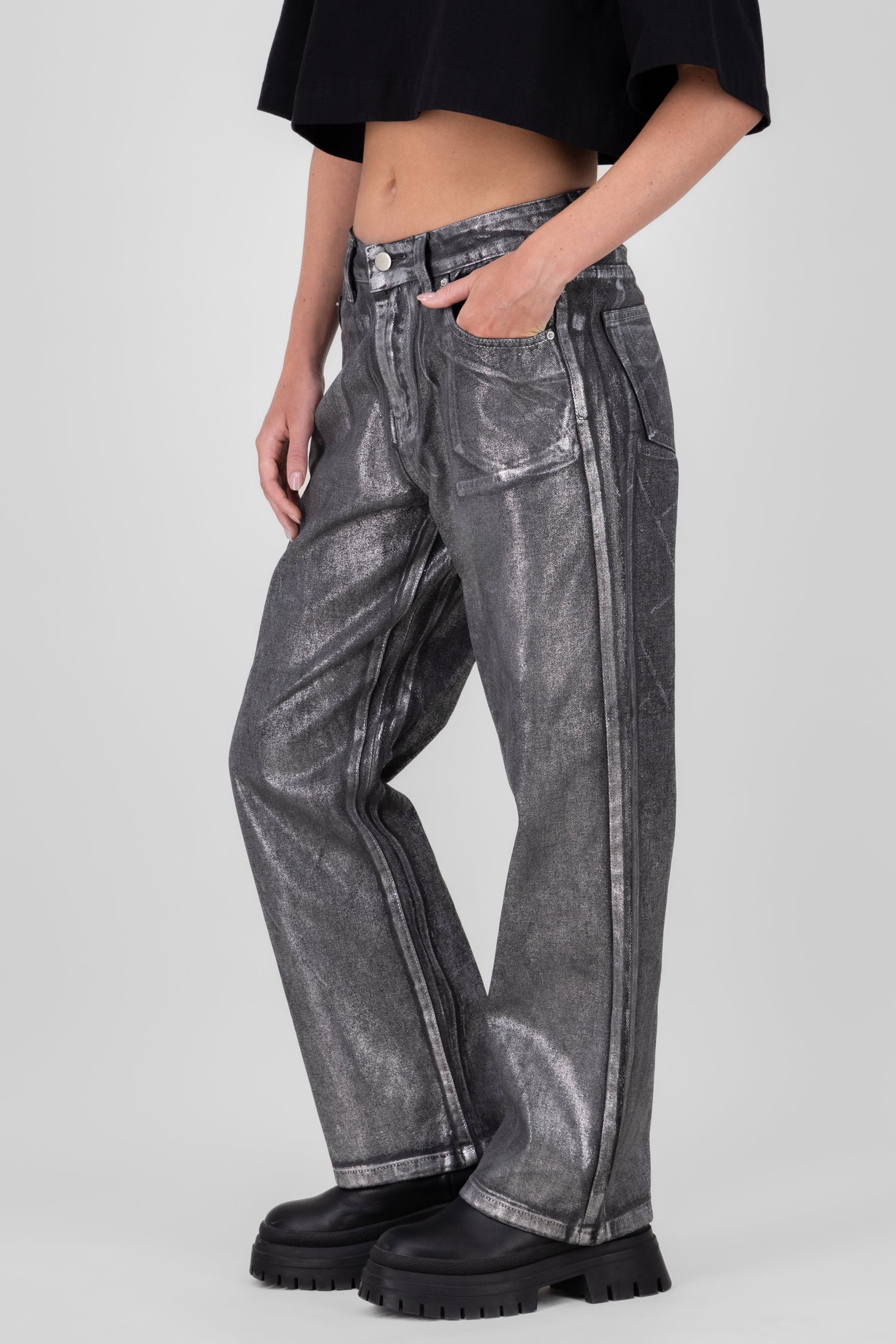 ¡Añade un toque futurista a tu look con estos jeans straight en efecto foil! Su aspecto metalizado es perfecto para un estilo moderno y llamativo.