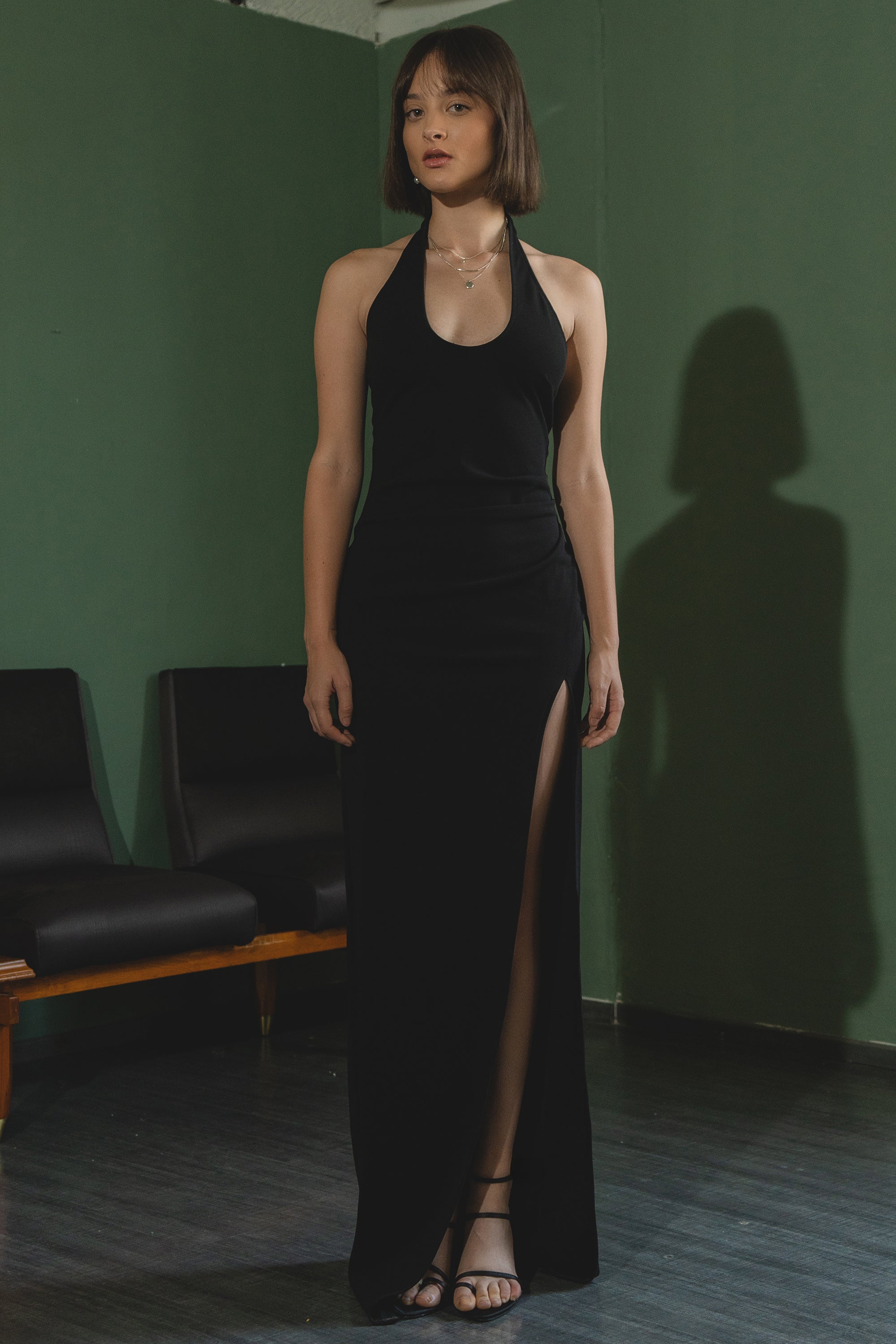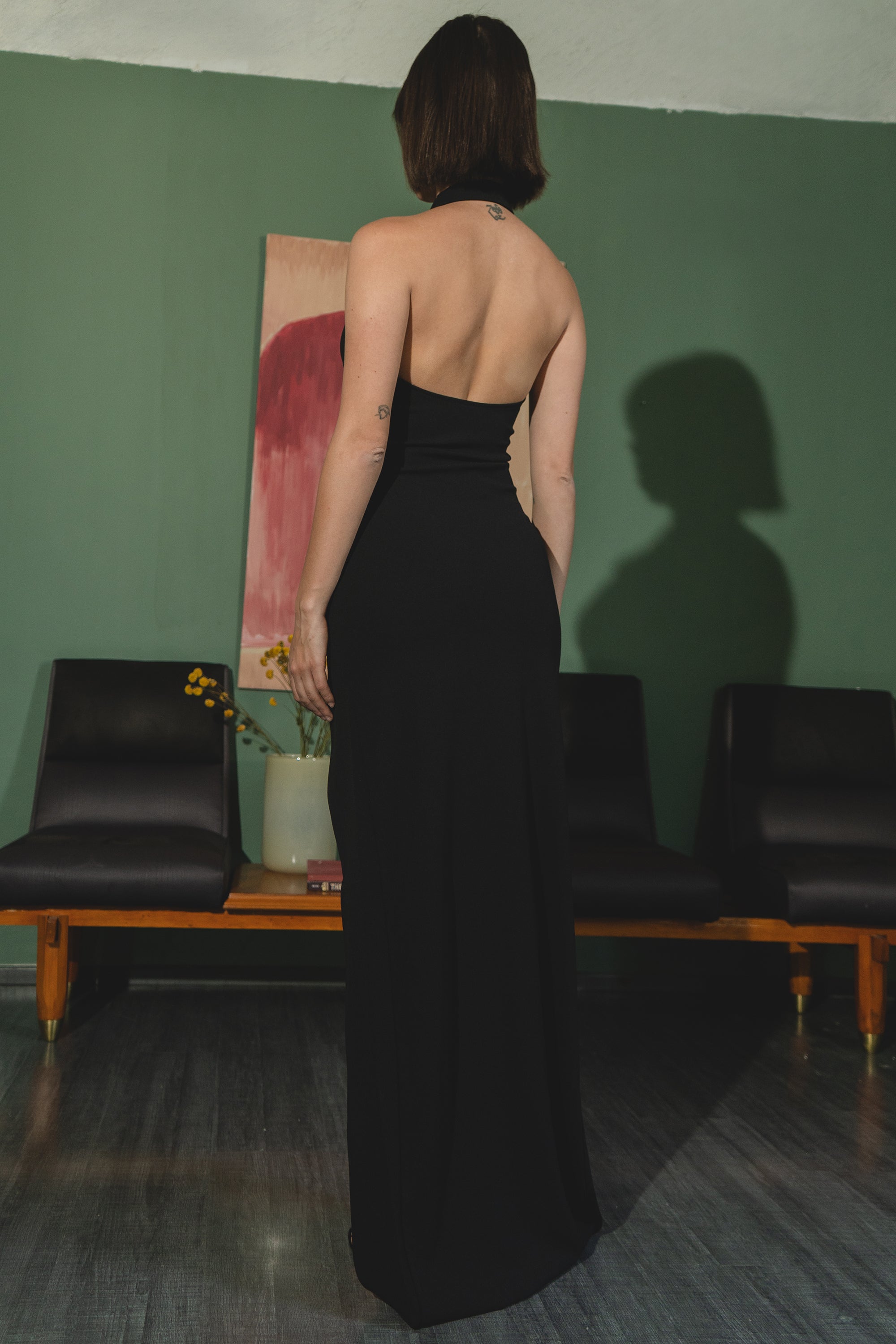 Maxi vestido con cuello halter, corte ajustado, abertura lateral y espalda descubierta.