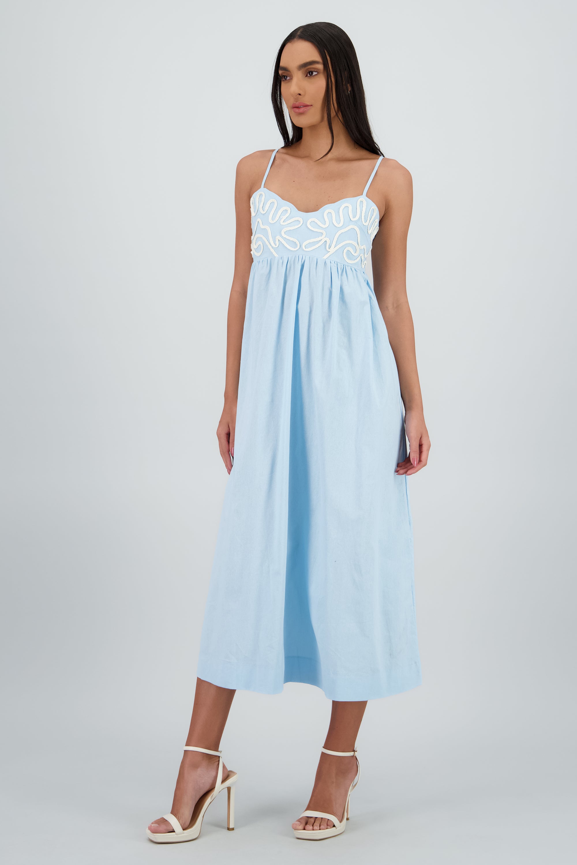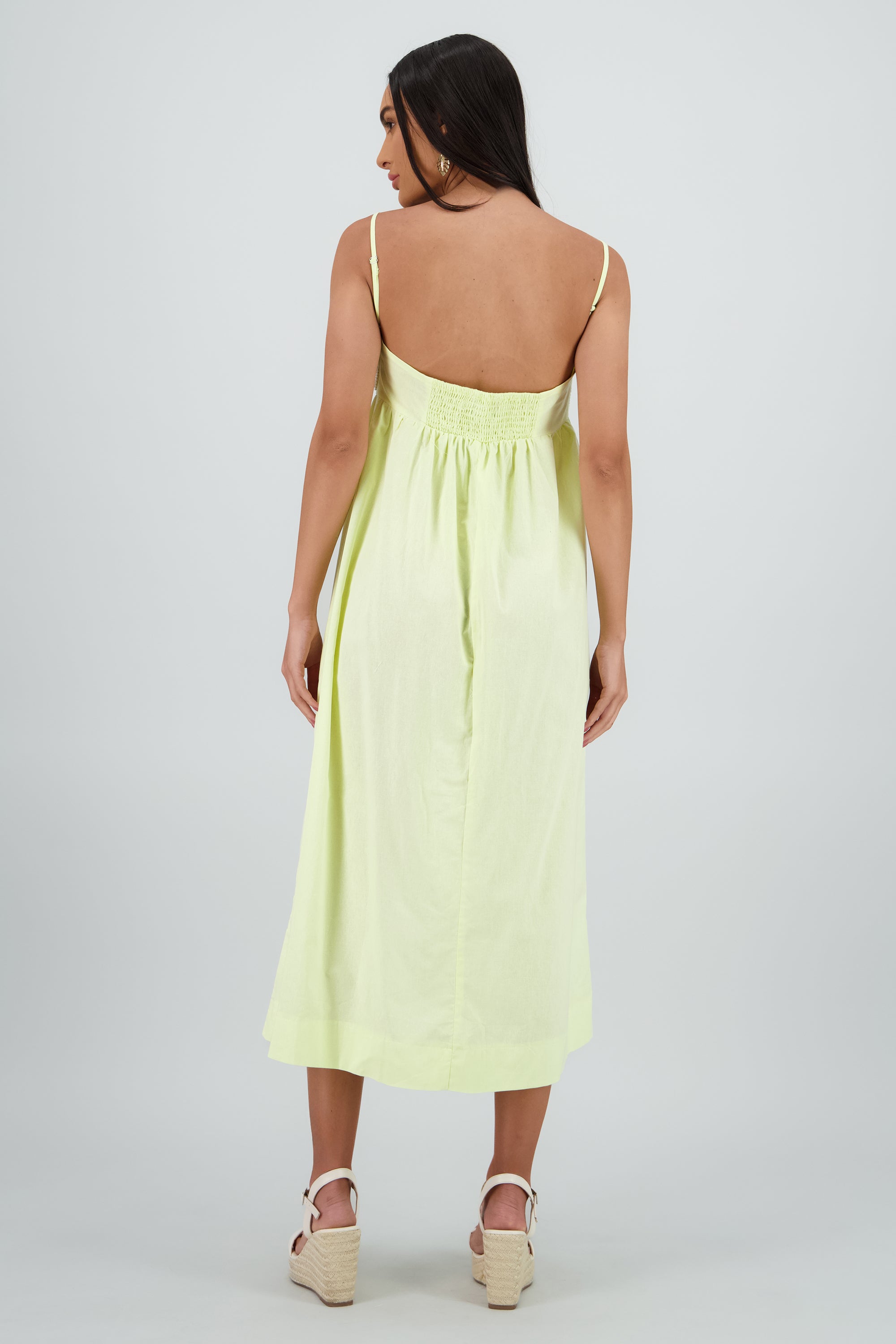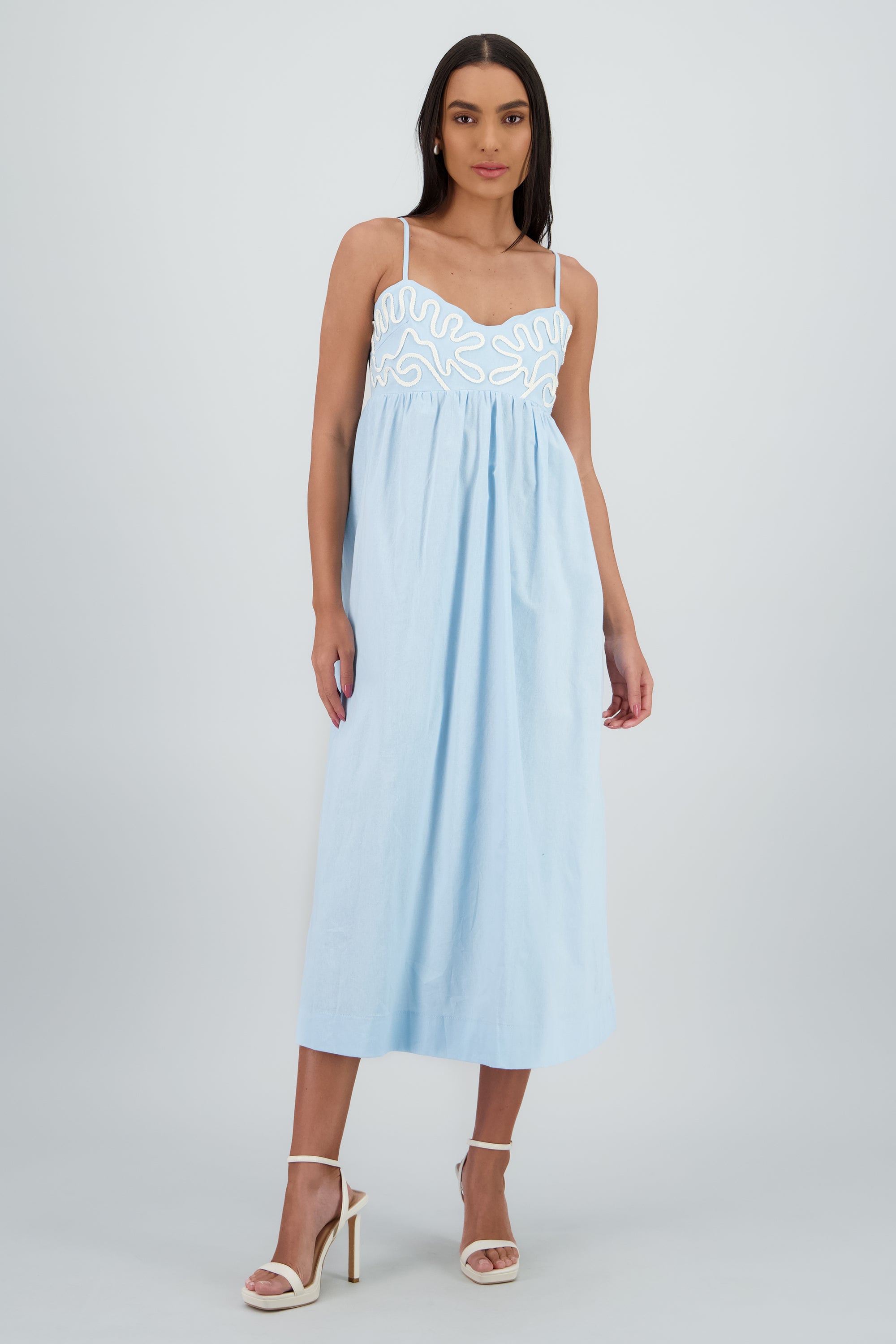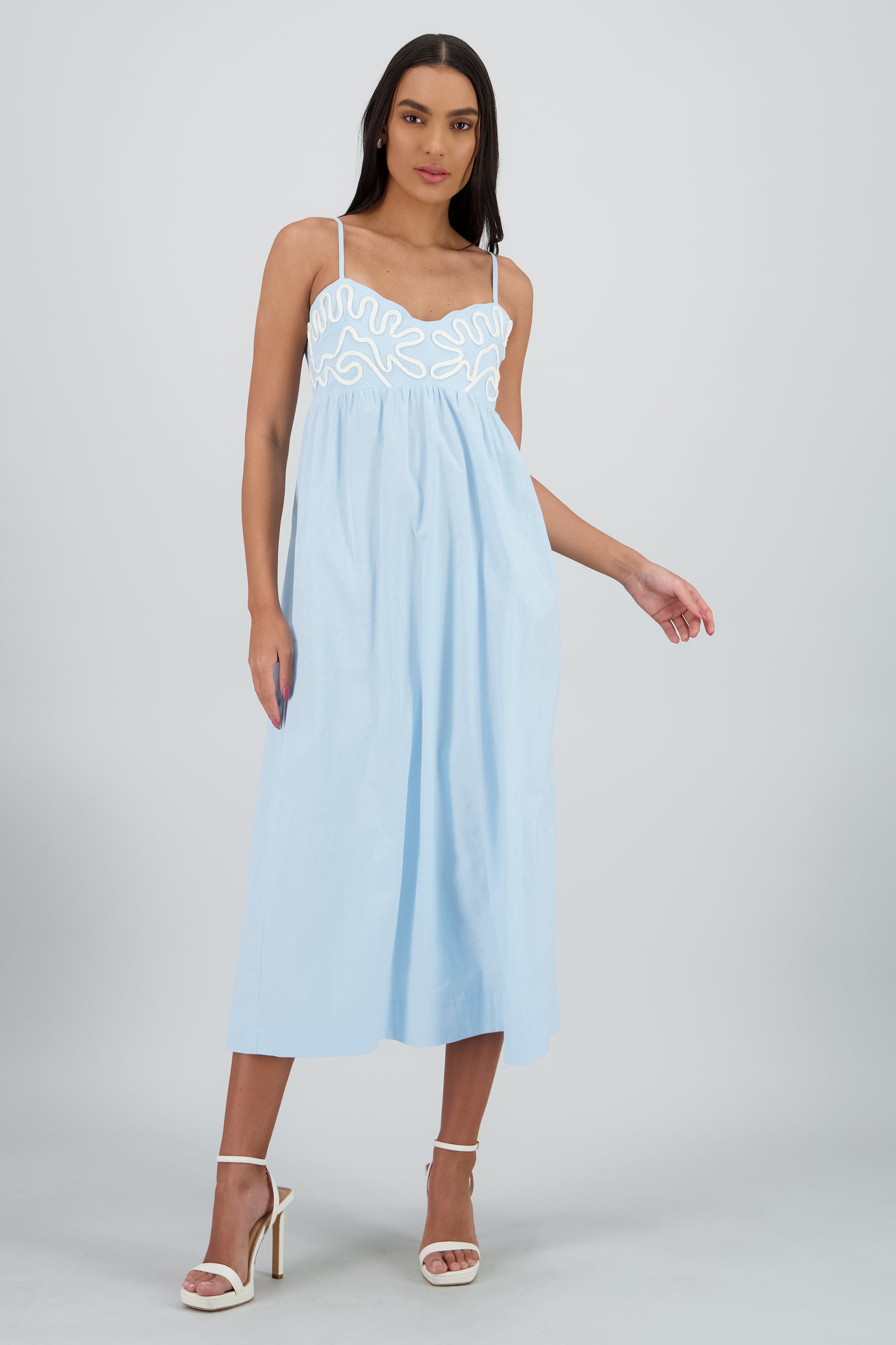 Maxi vestido piping de corte fluido, con tirantes ajustables, detalle frontal vibrante y cintura ajustada.