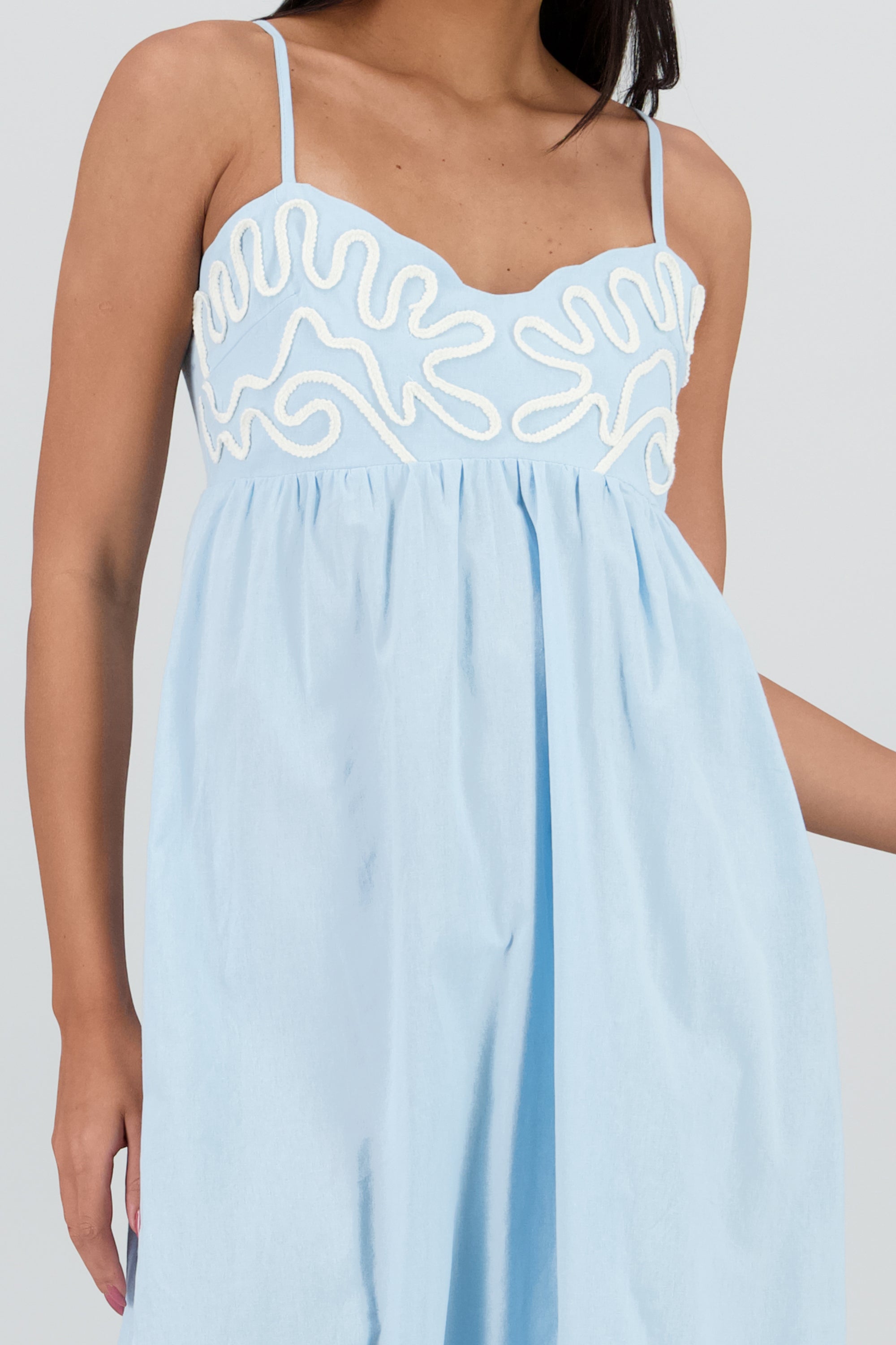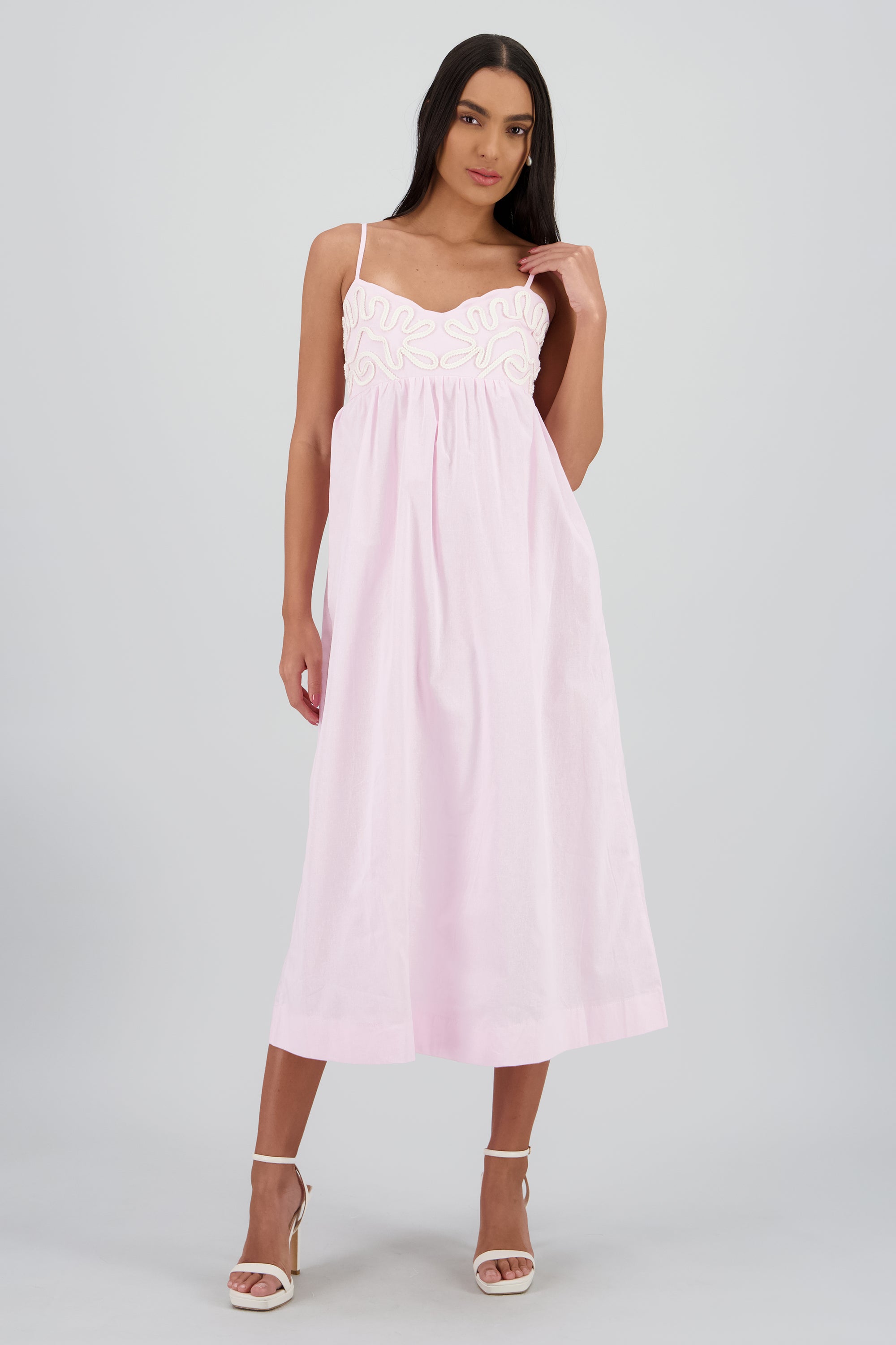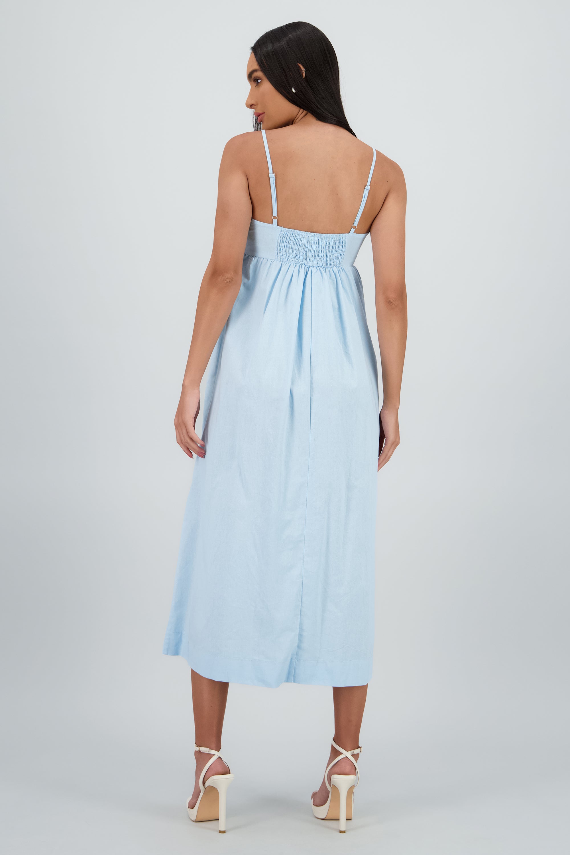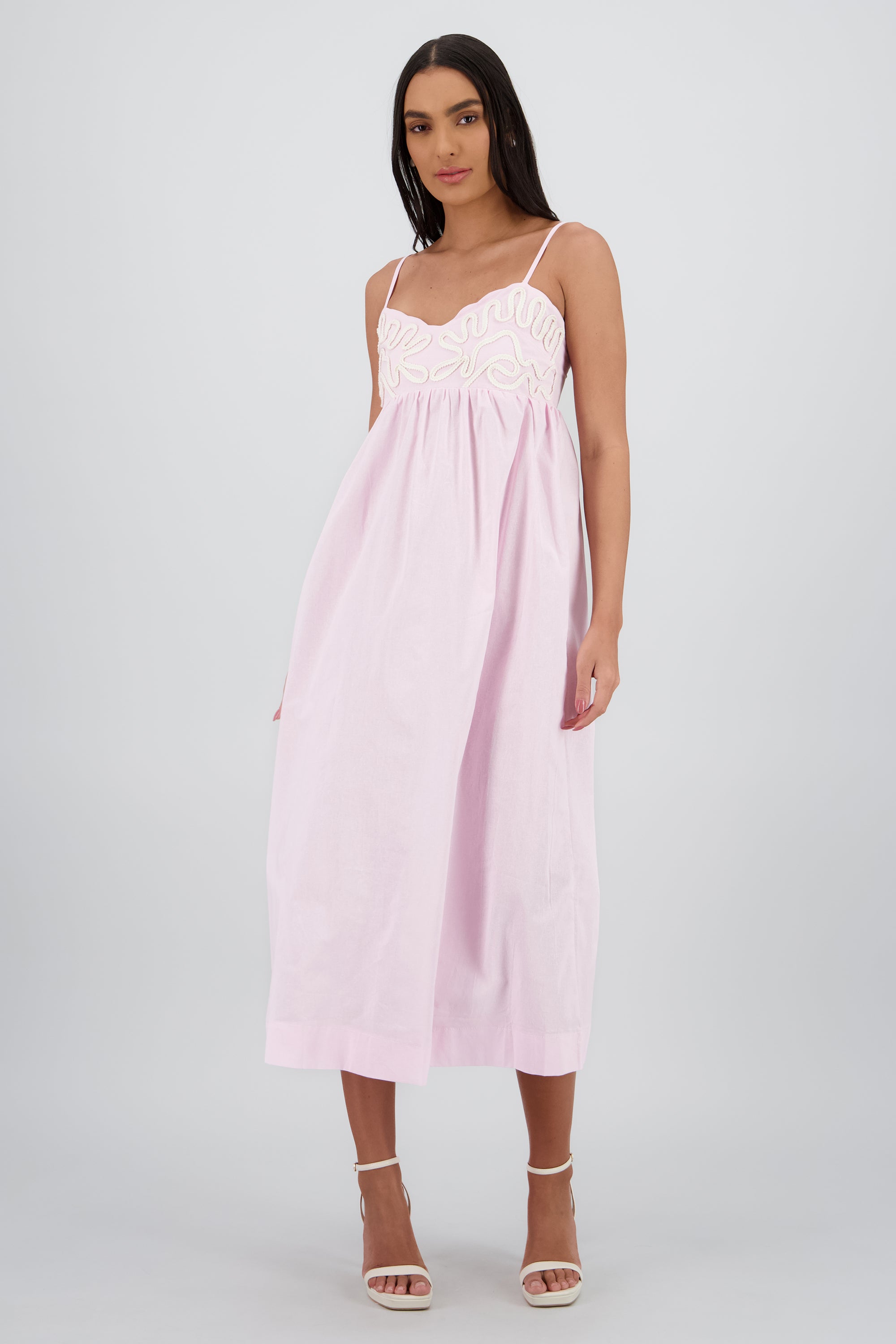Maxi vestido piping de corte fluido, con tirantes ajustables, detalle frontal vibrante y cintura ajustada.
