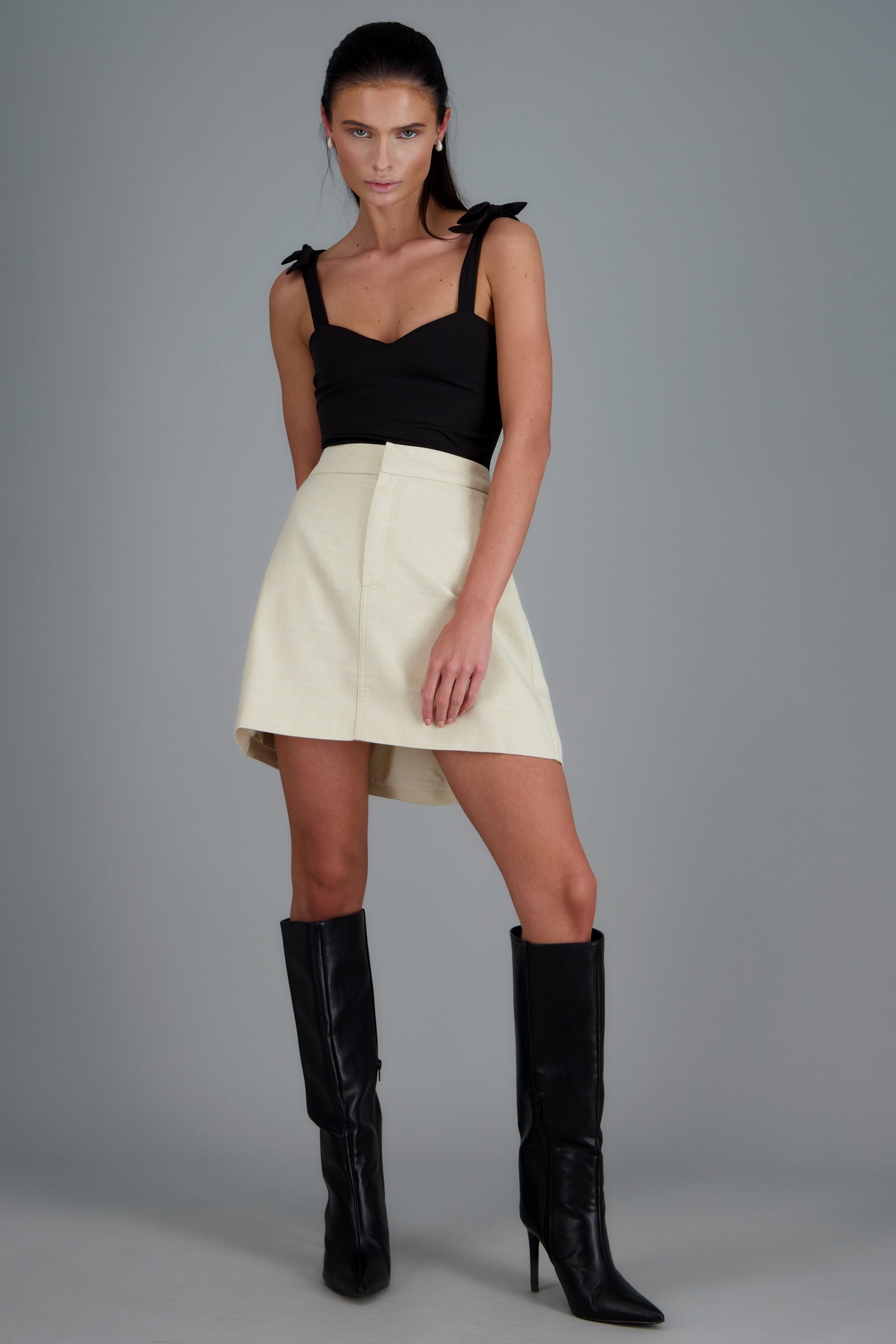 Mini falda sastreada de corte recto, cintura ajustada, cierre frontal de cremallera y botón.