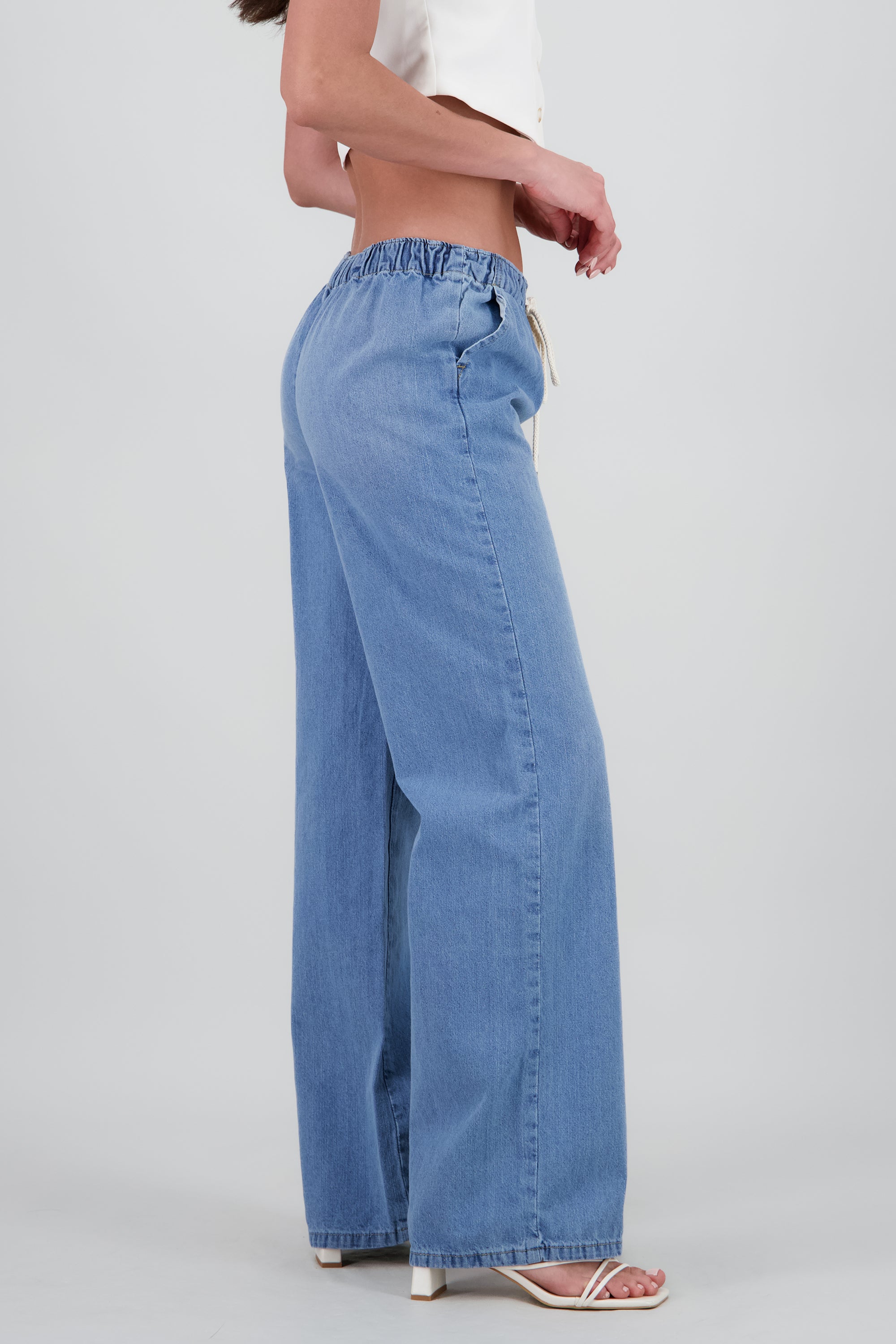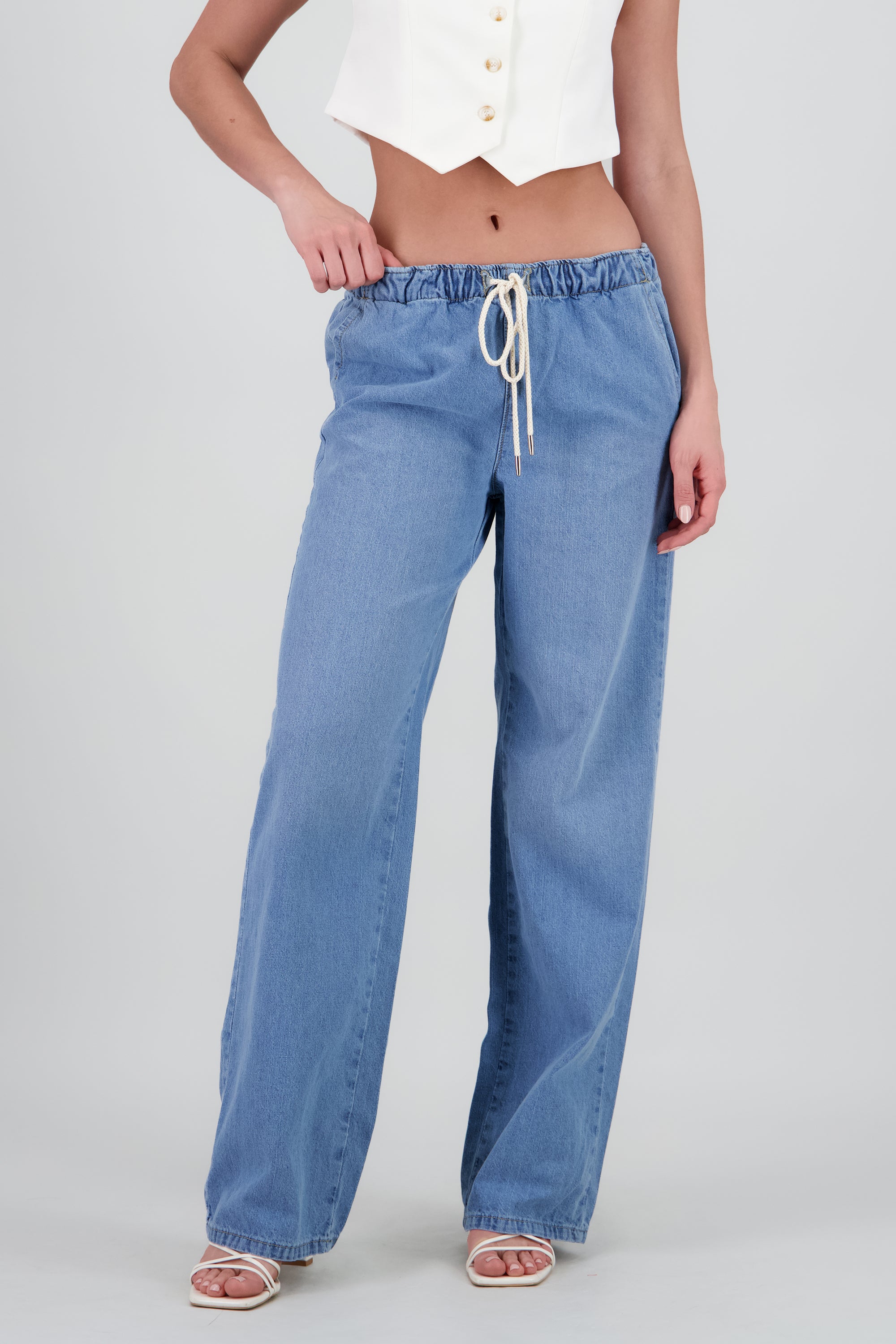 Pantalón denim con cordón ajustable en la cintura, corte recto, bolsas laterales, cintura elástica y ajustable