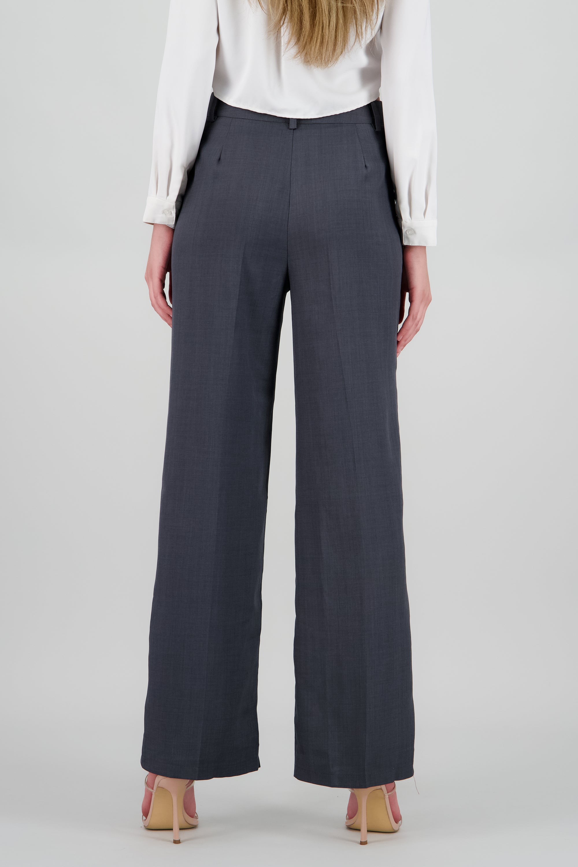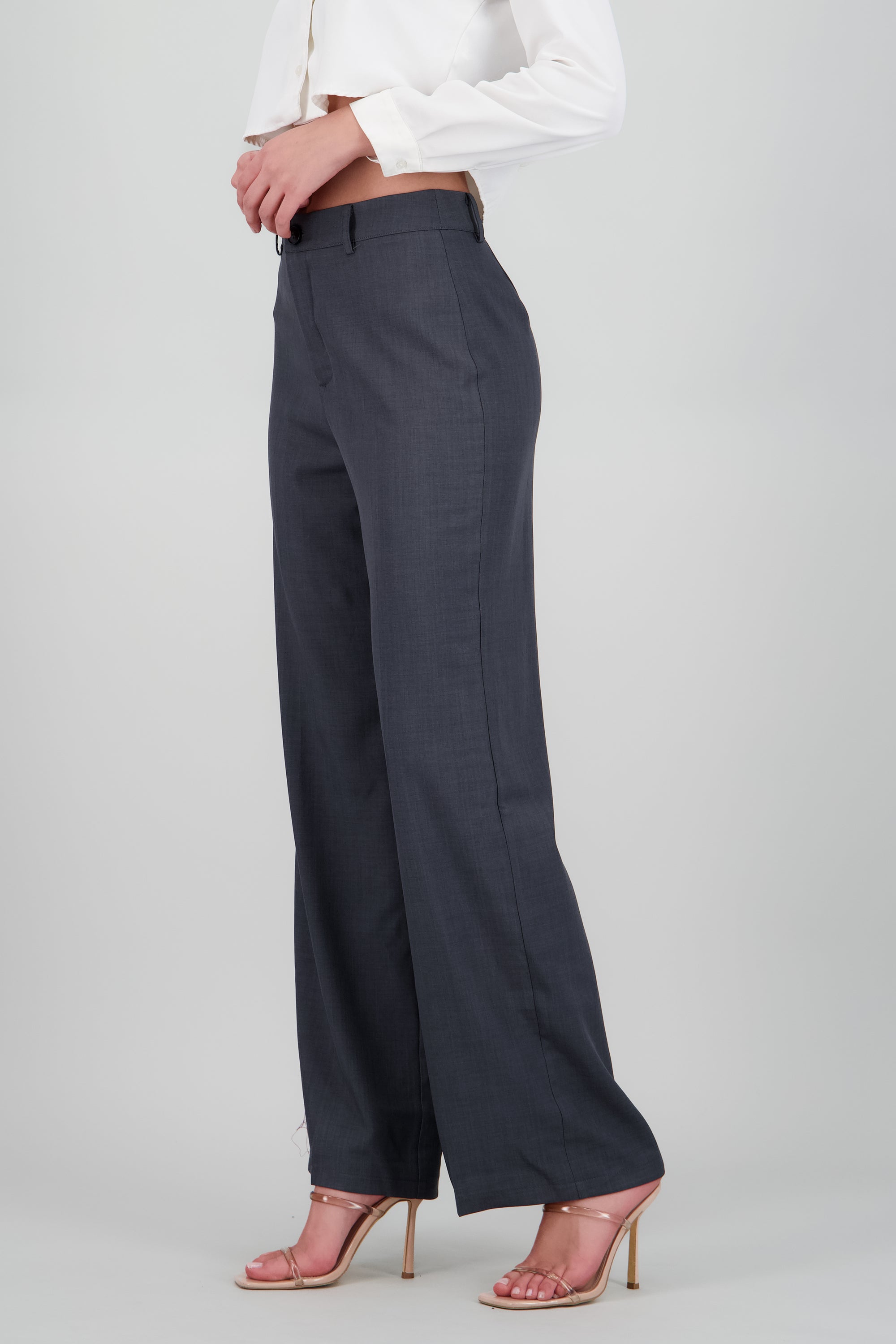 Pantalón de tiro medio, corte recto, pinzas traseras y cierre frontal con botón y cremallera.