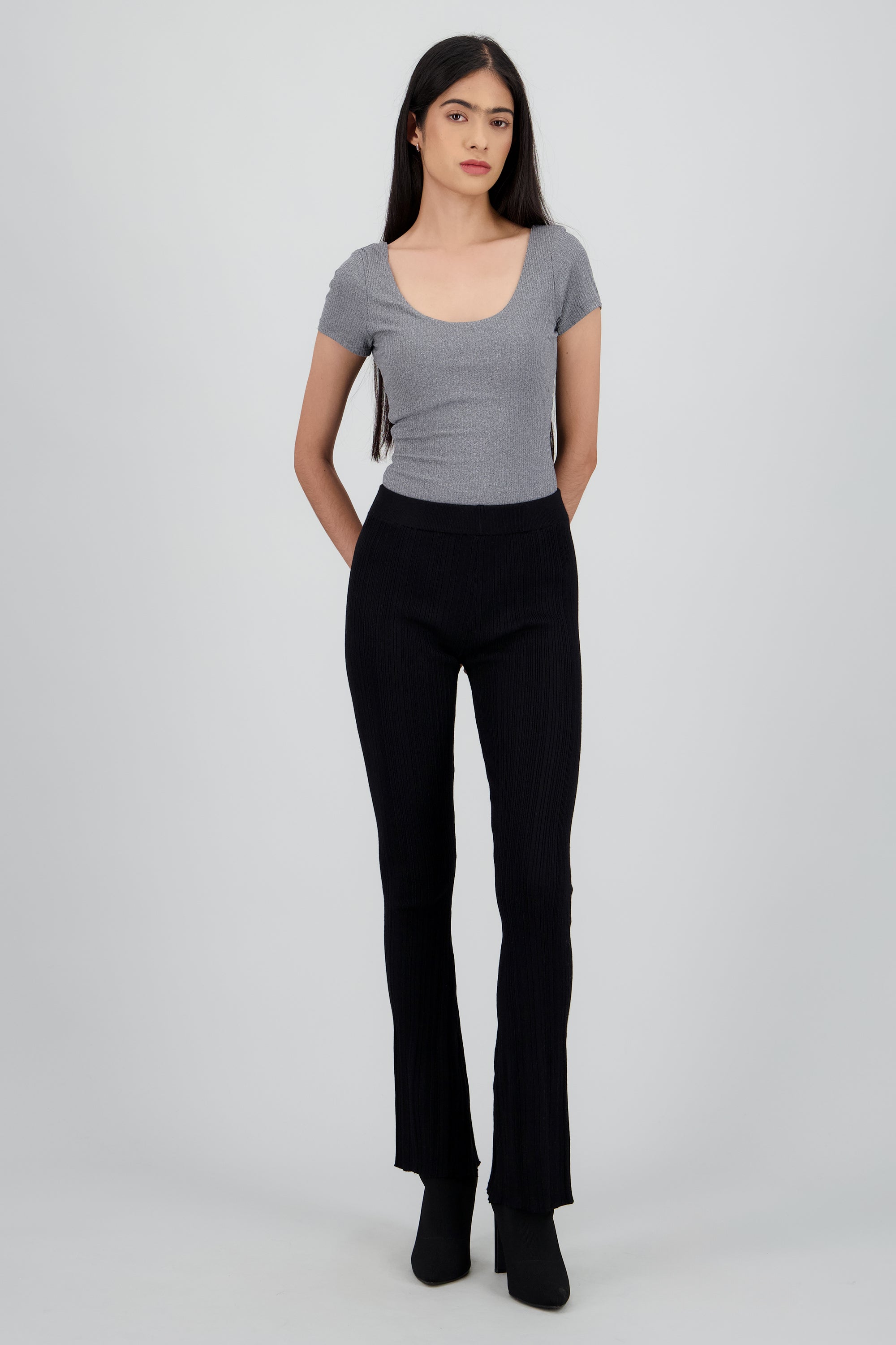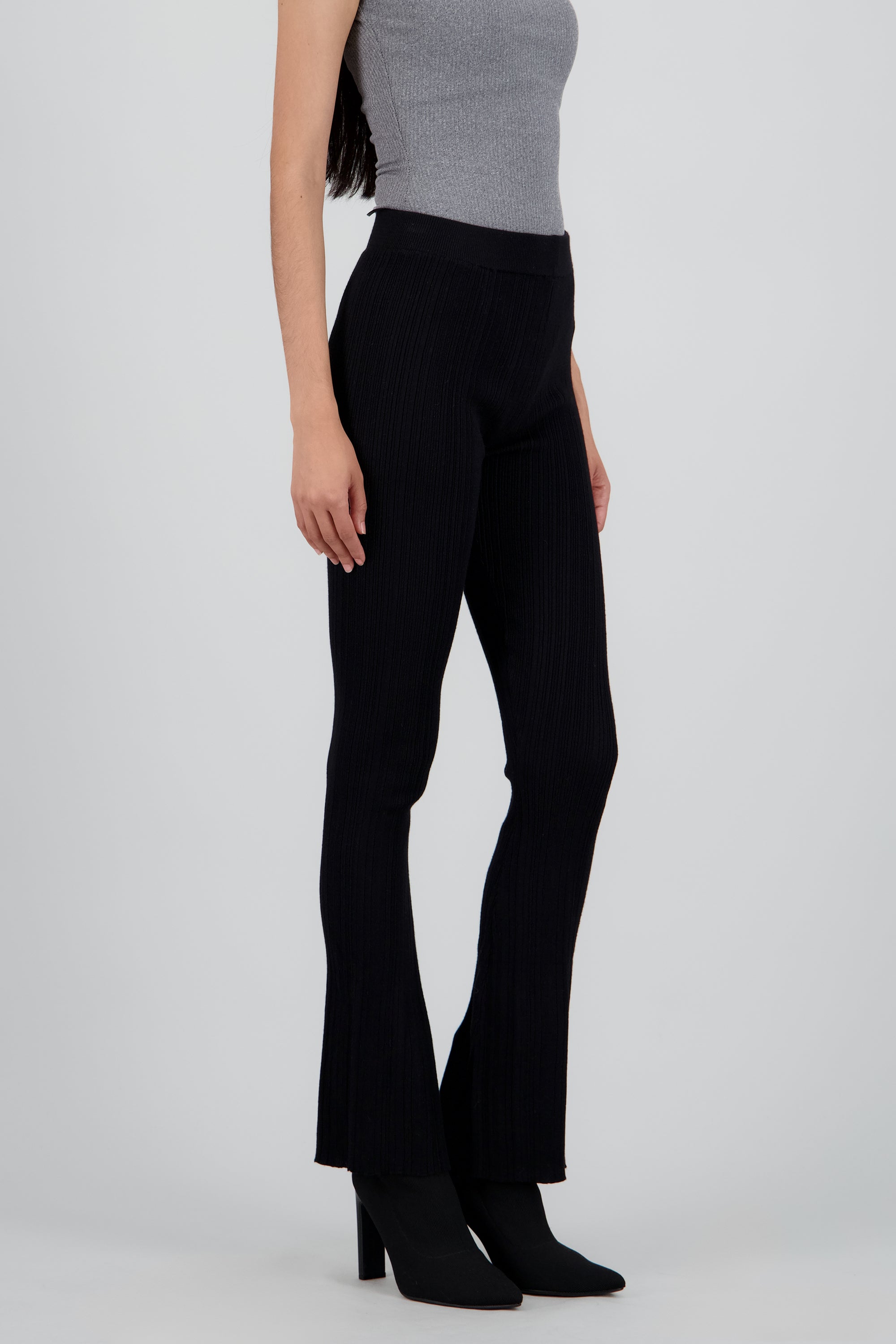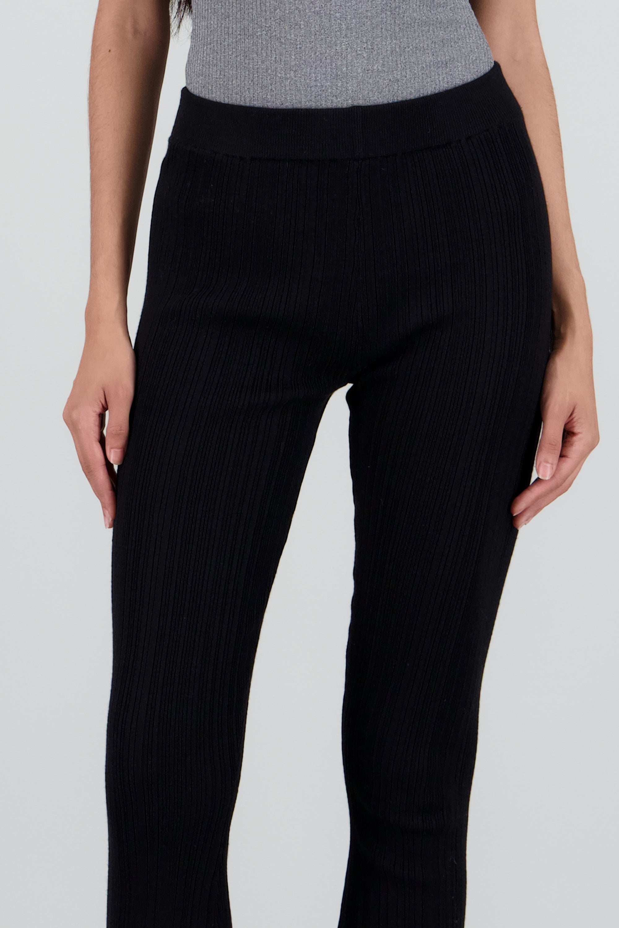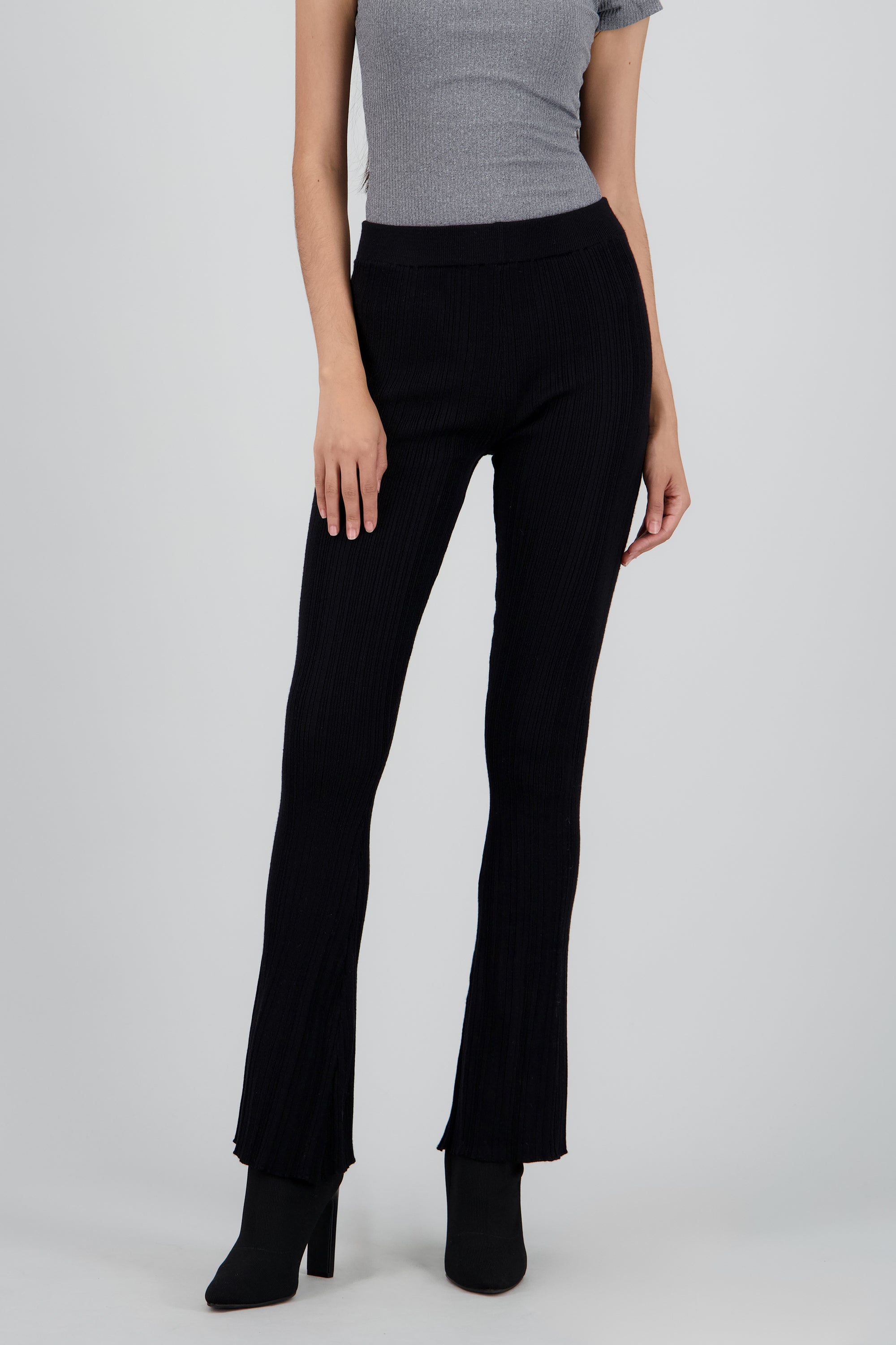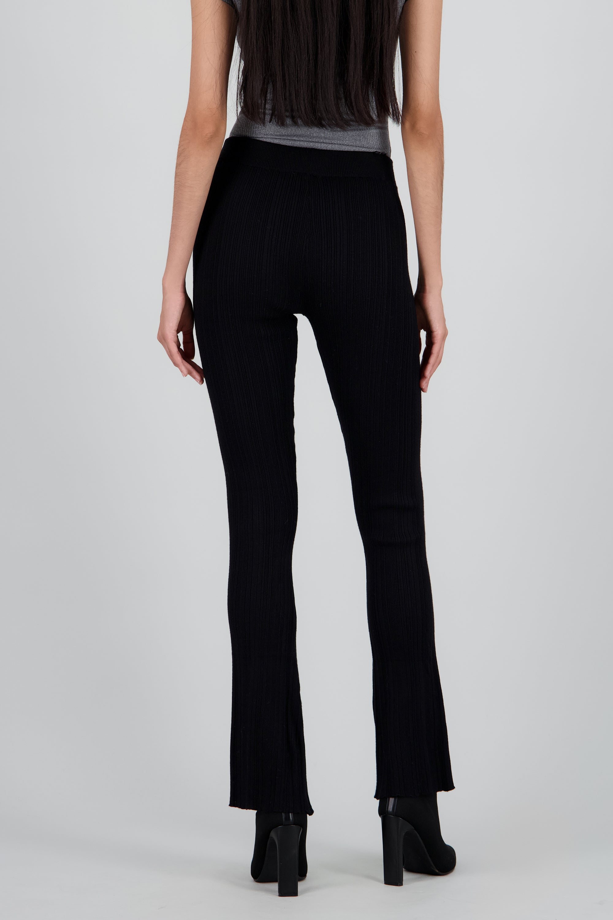 Pantalón de corte flare con textura rib, cintura alta y ajustada.