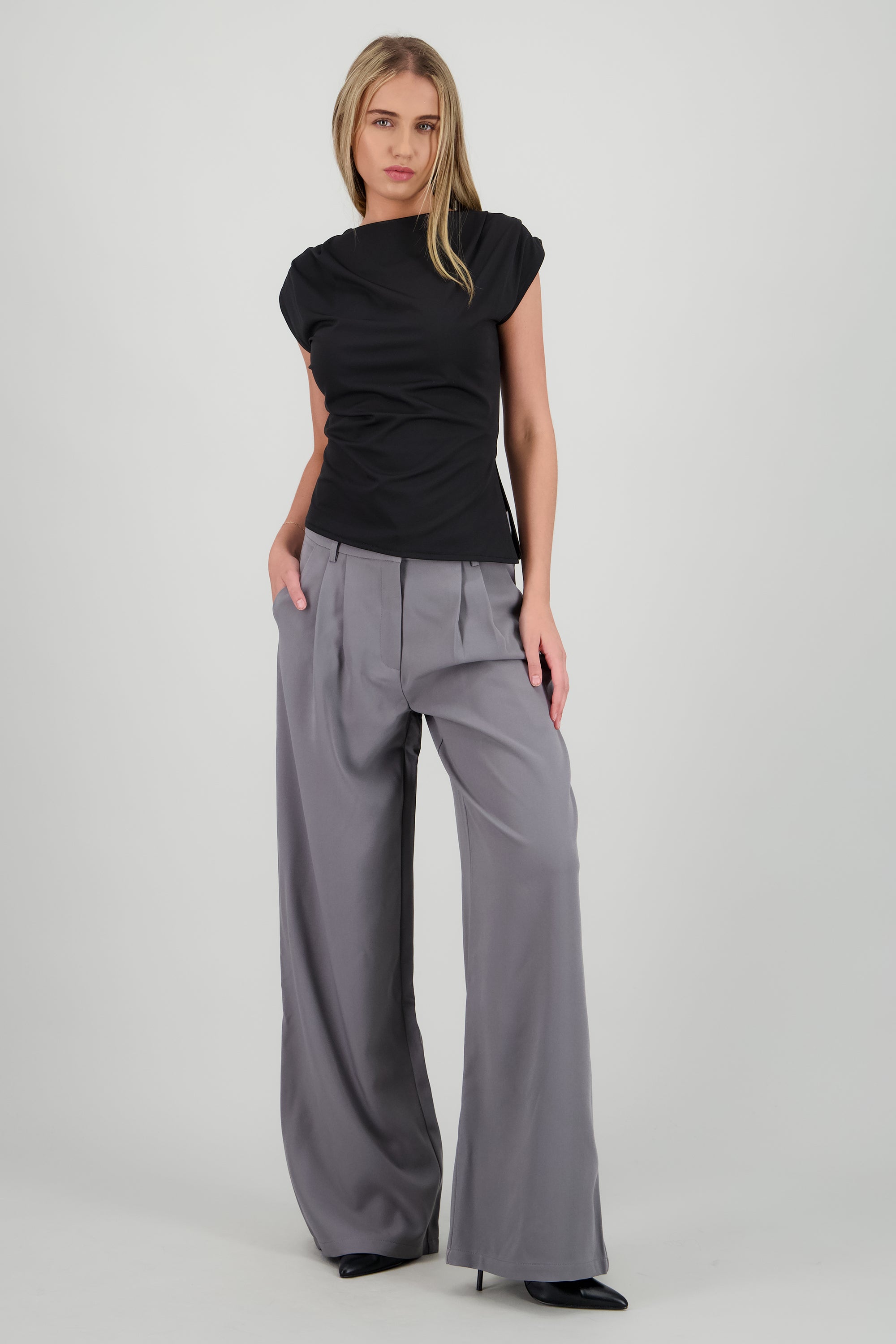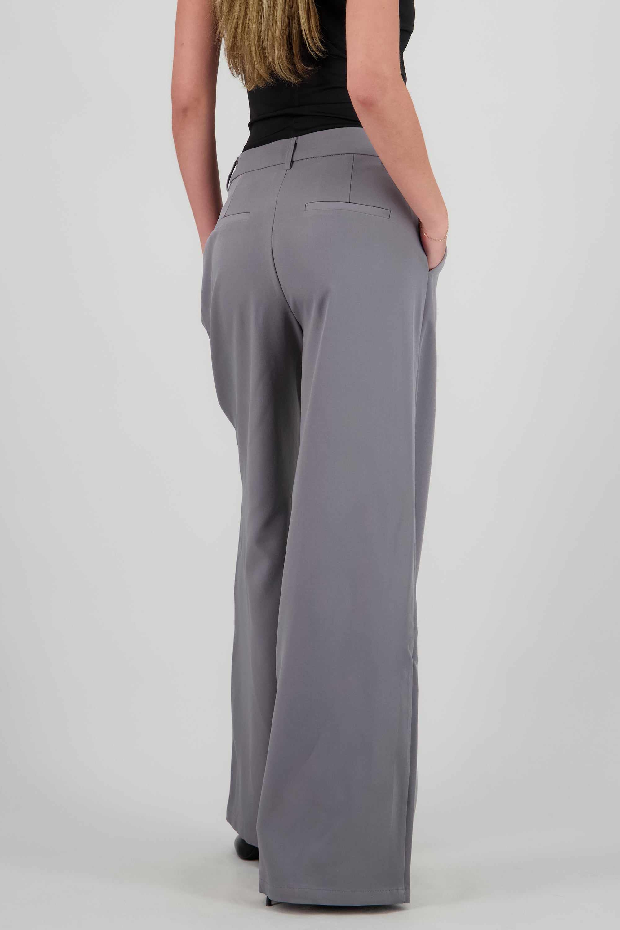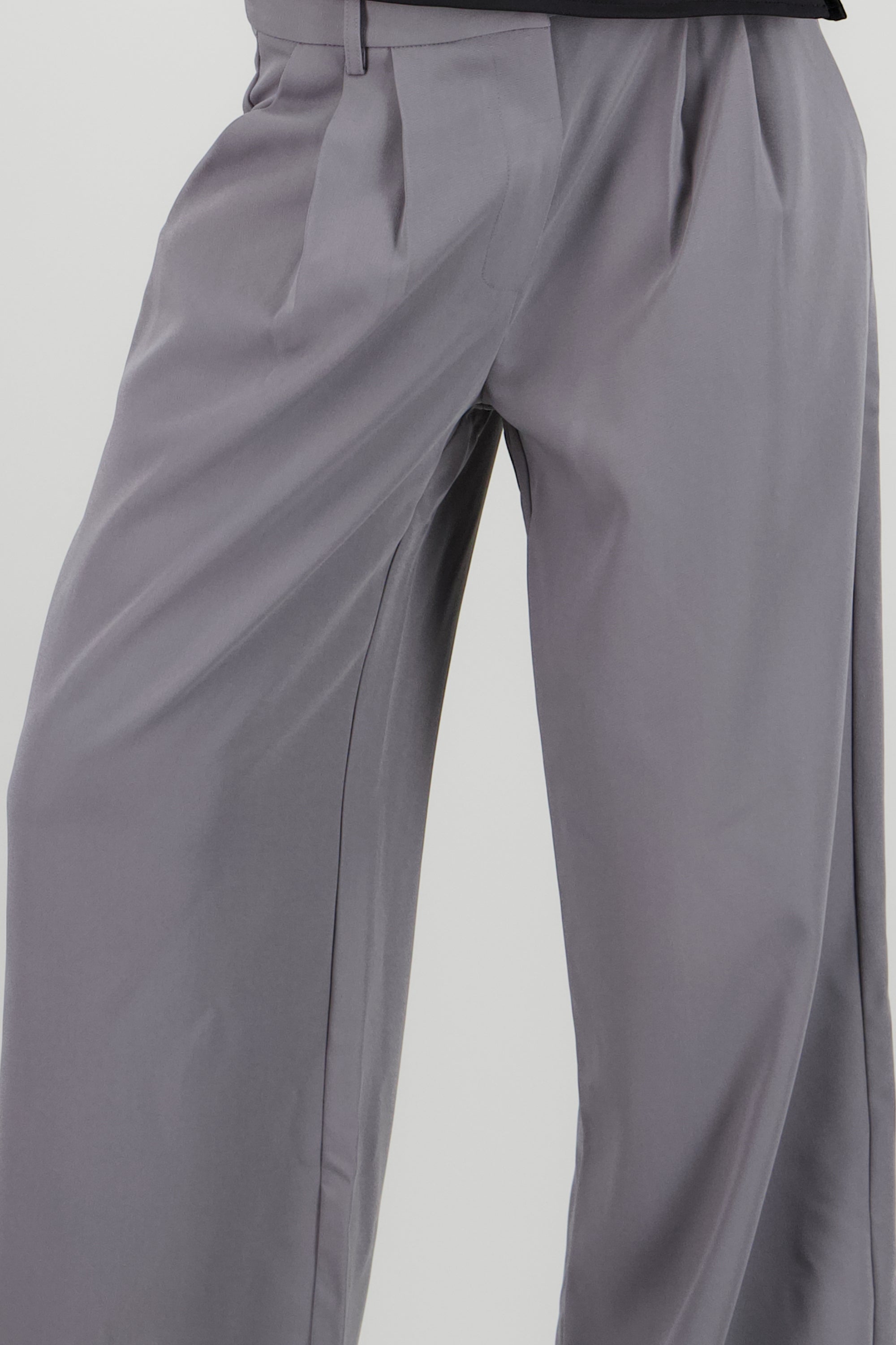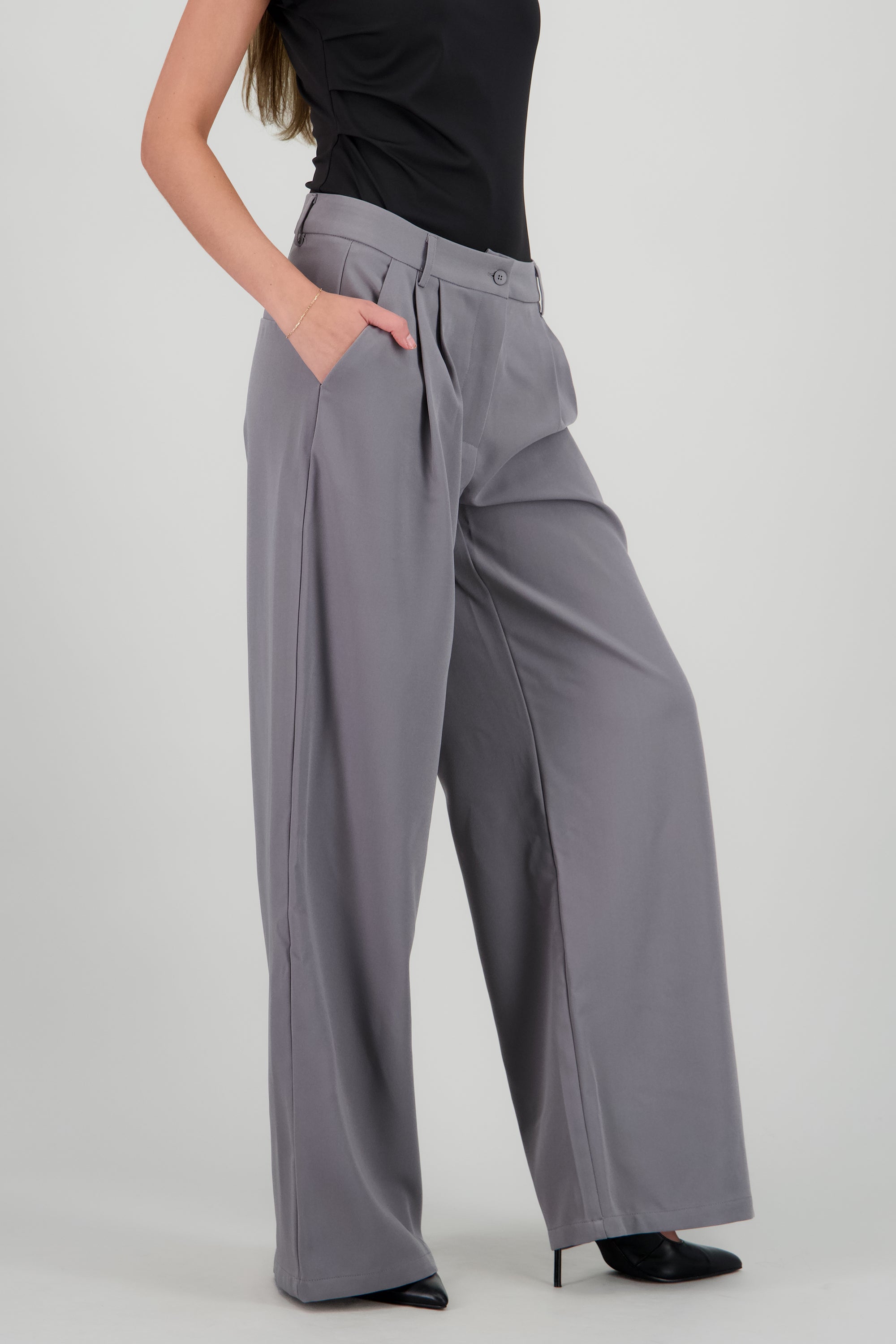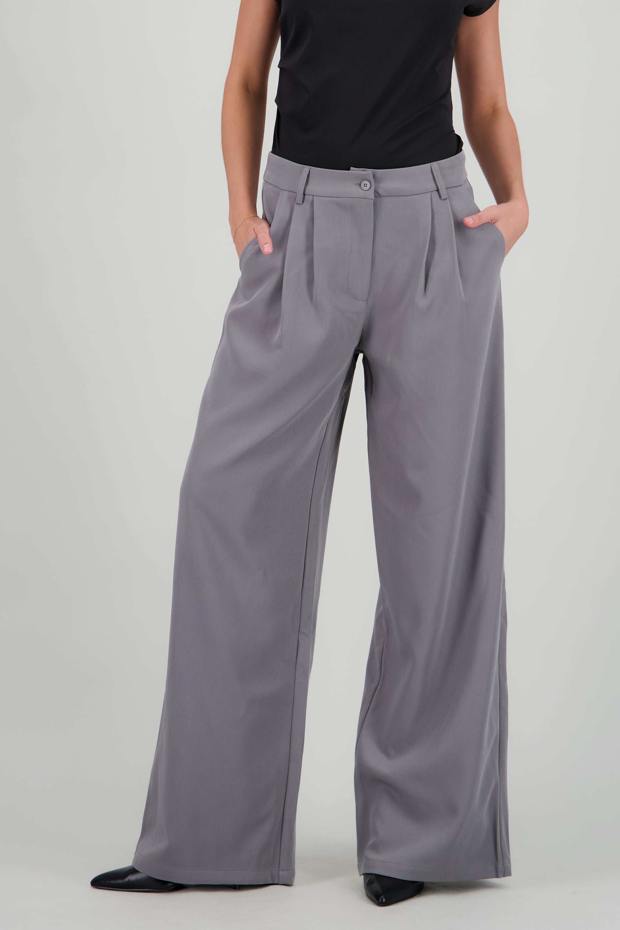 Pantalón baggy con pinzas, corte amplio y fluido. Cierre de cremallera y botón en la parte frontal.