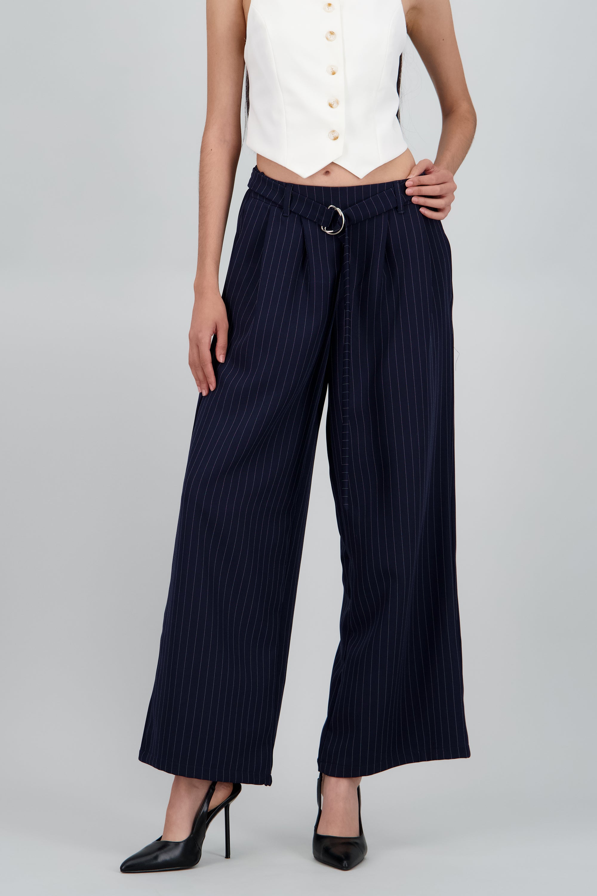 Pantalón sastre de corte recto, pretina con cinturón integrado, bolsas laterales y diseño de rayas.