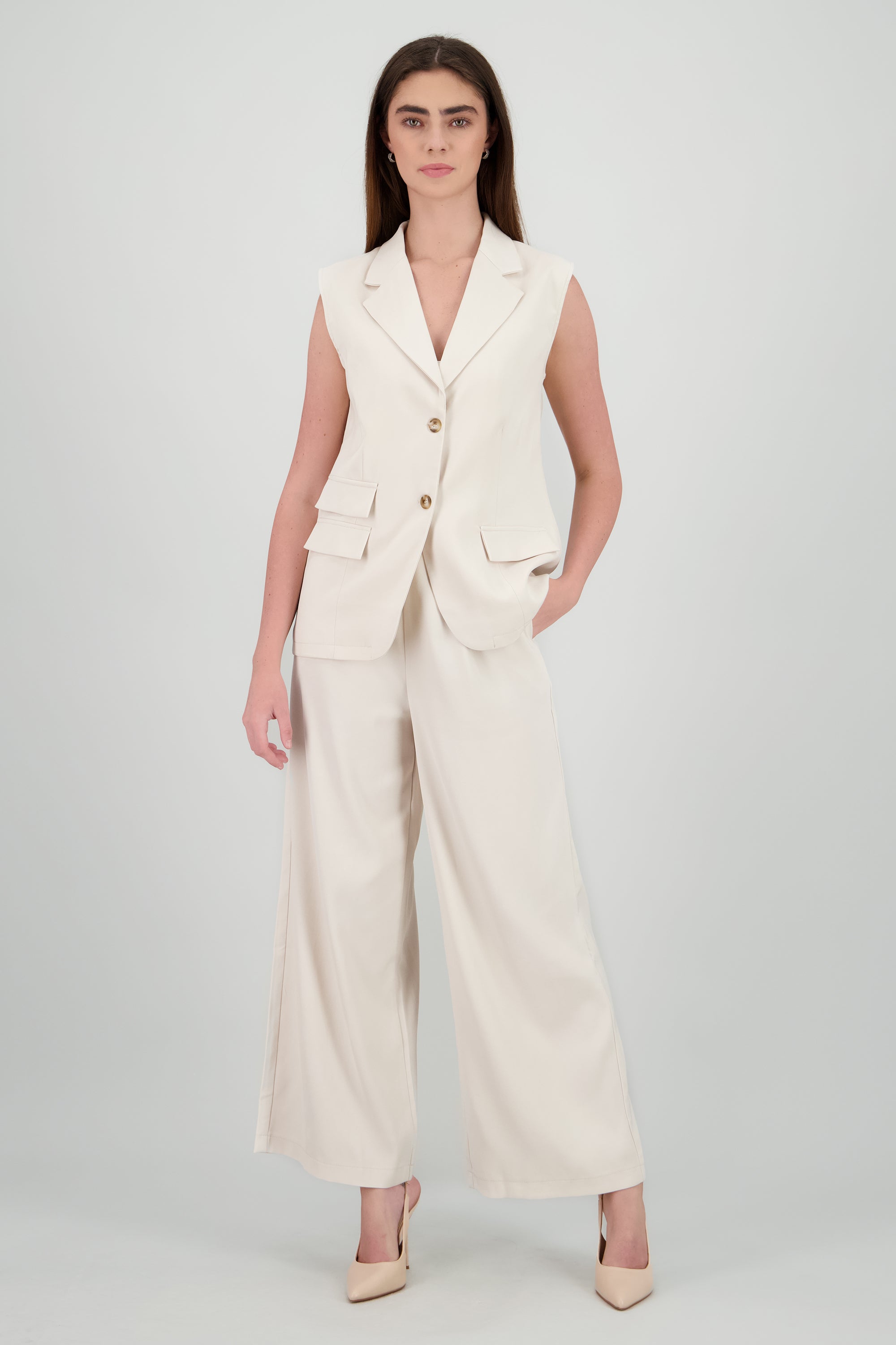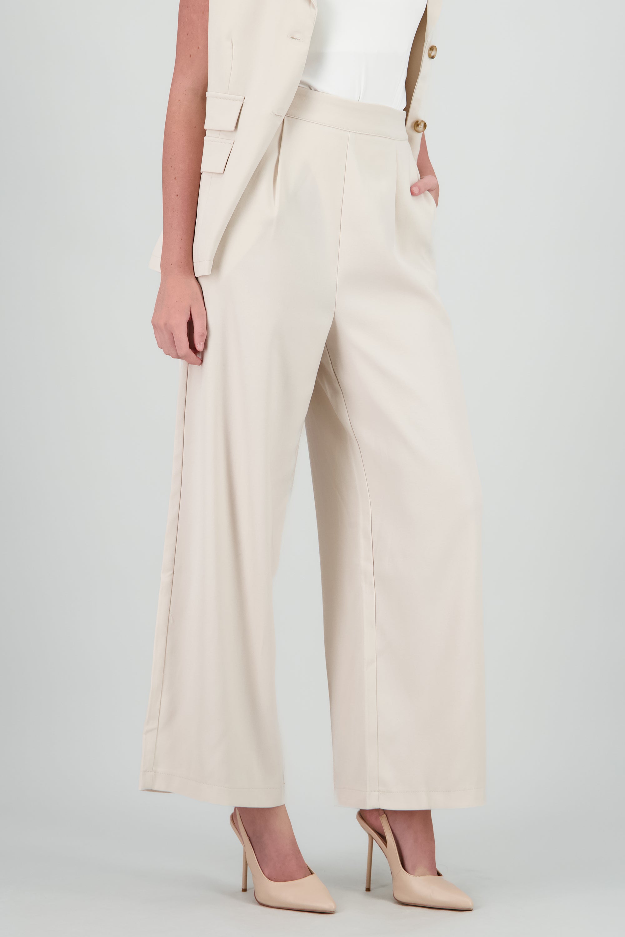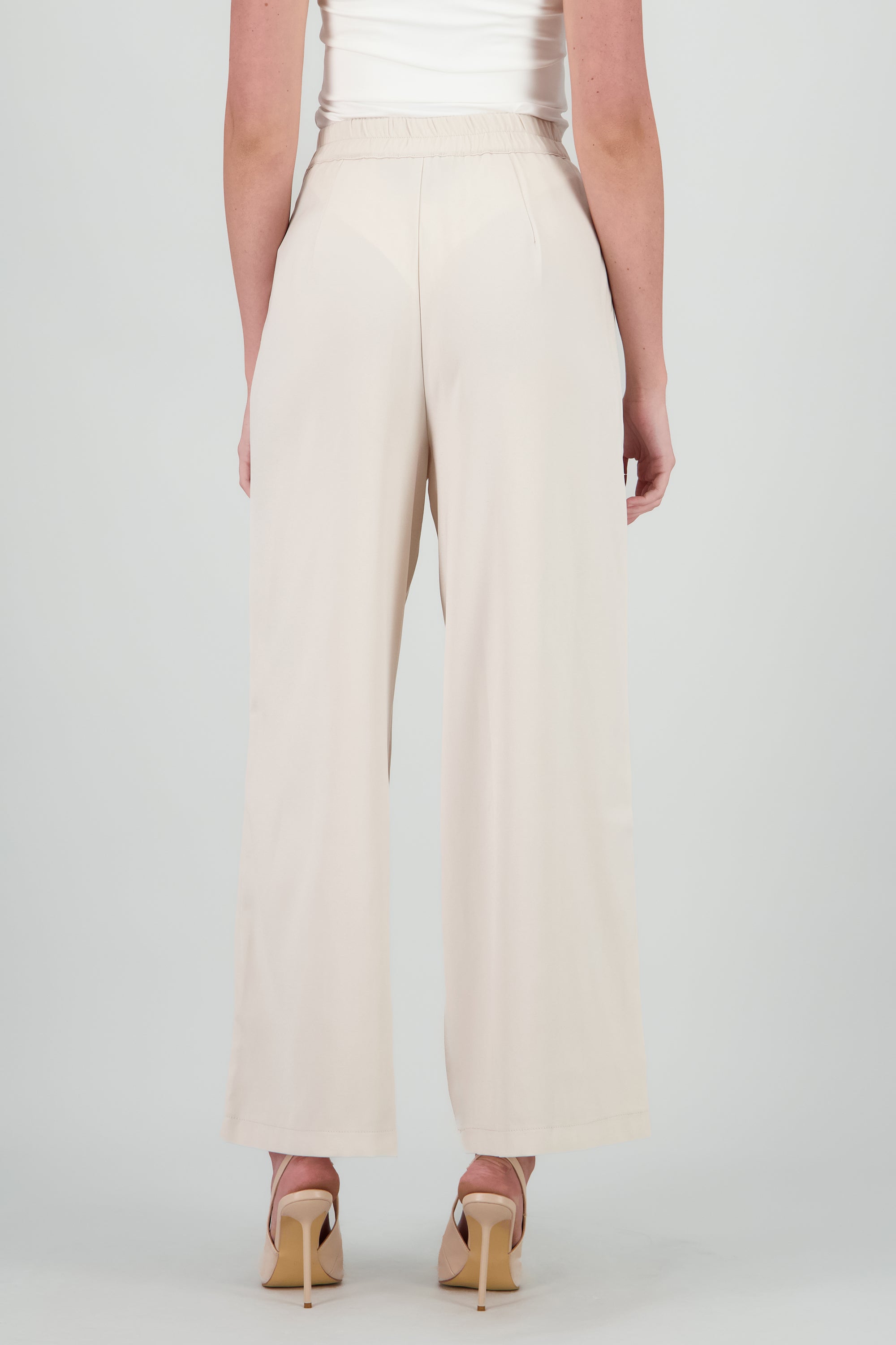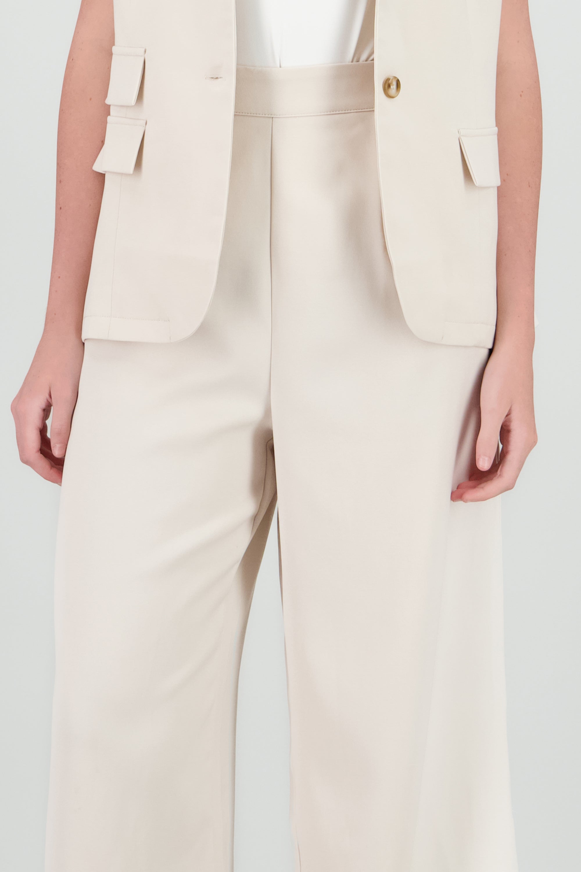 Pantalón liso de corte recto, cintura elástica y bolsas laterales.