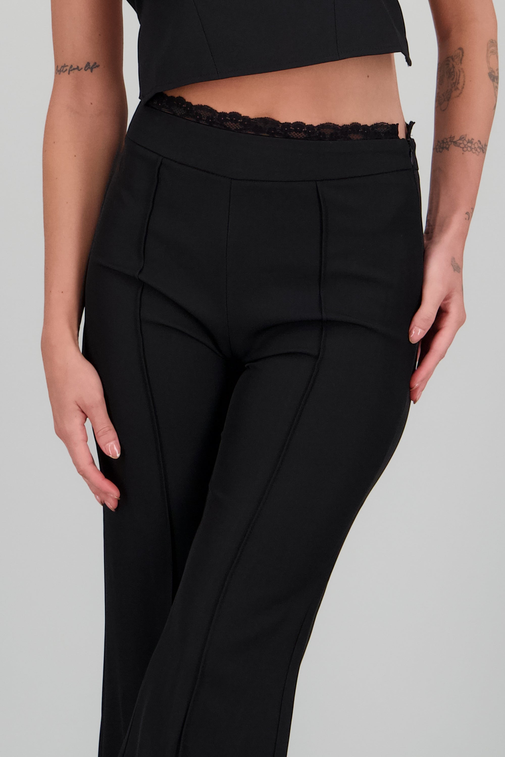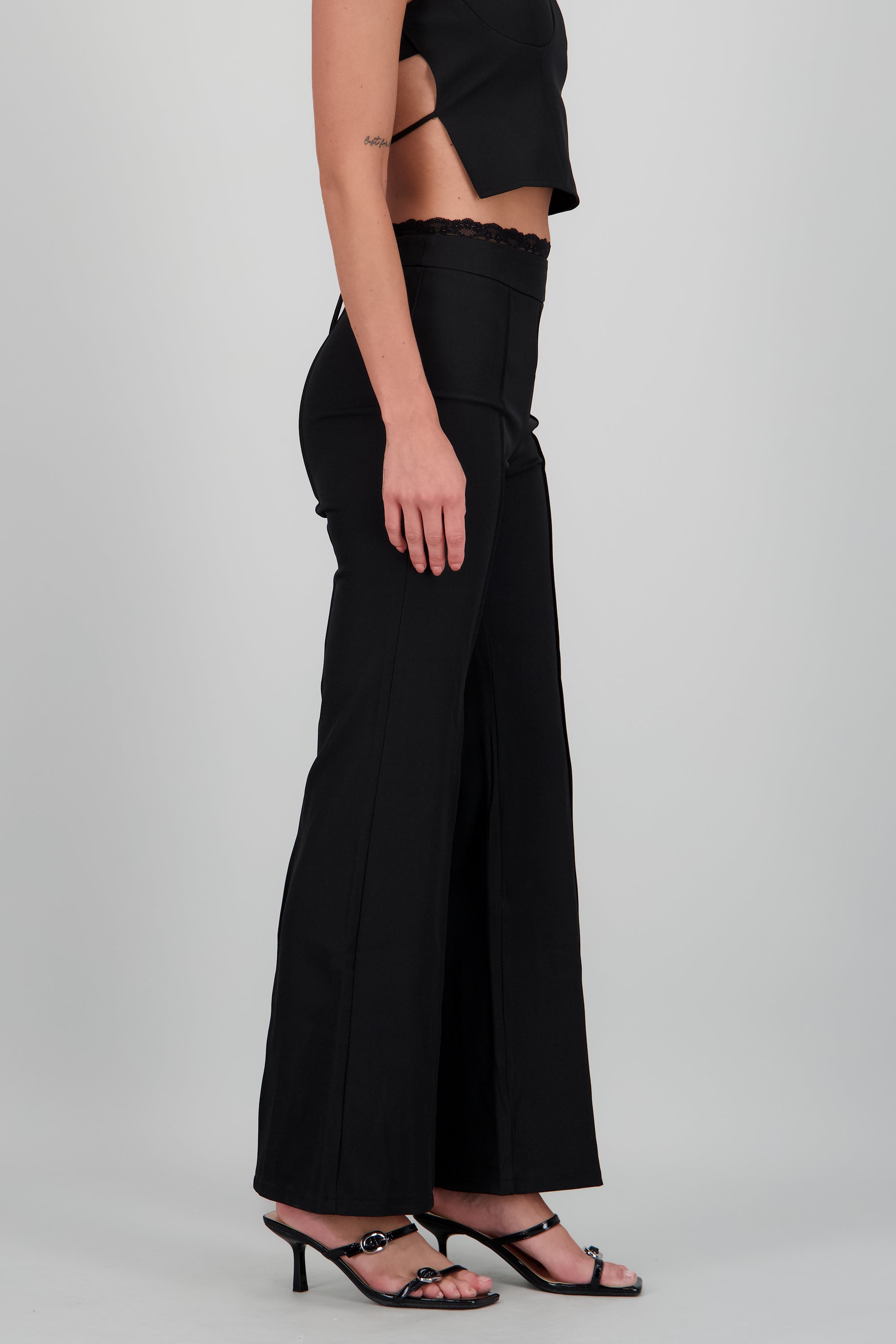 Pantalón sastreado de corte recto, detalle de encaje en la pretina y costuras.