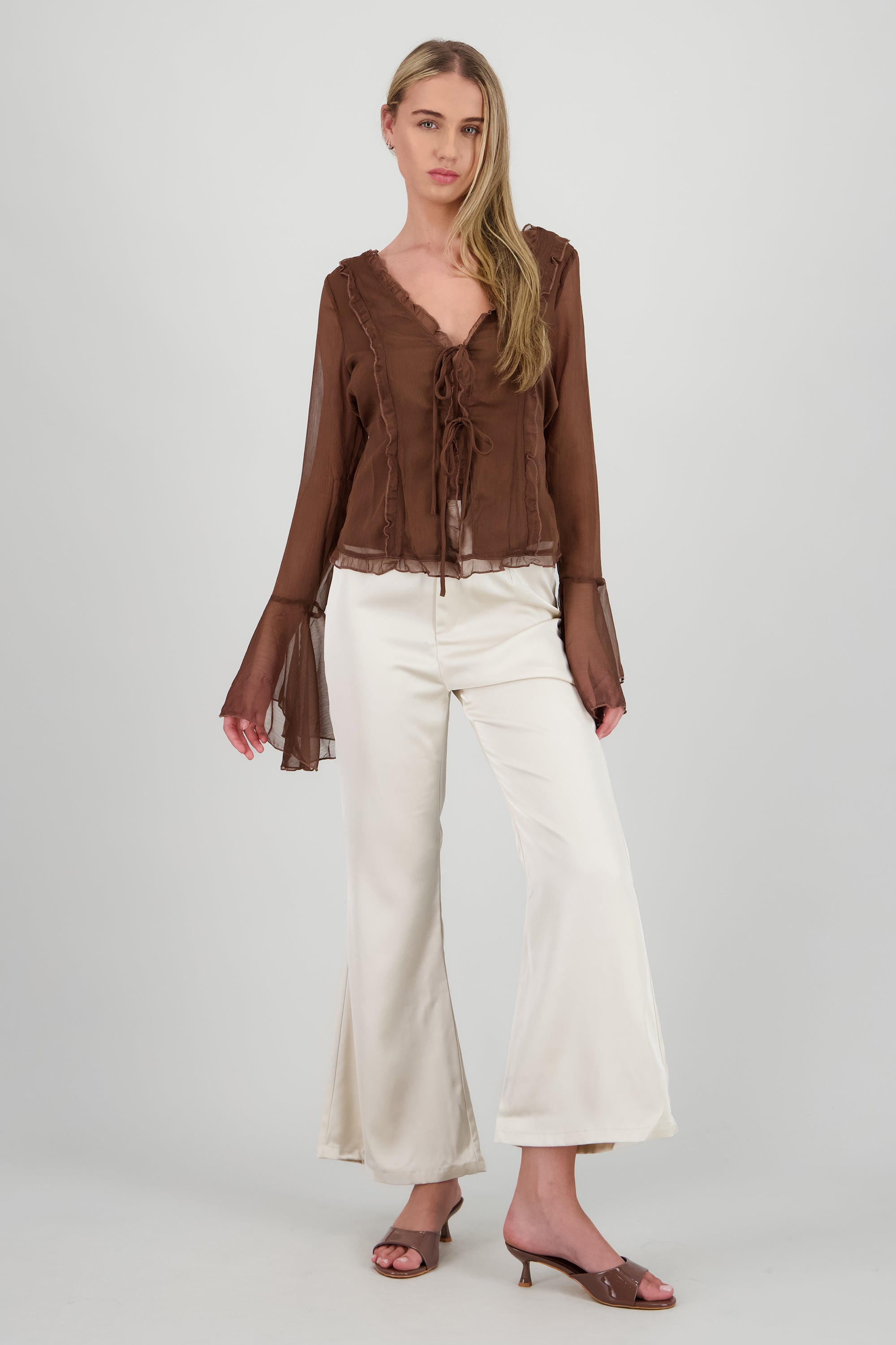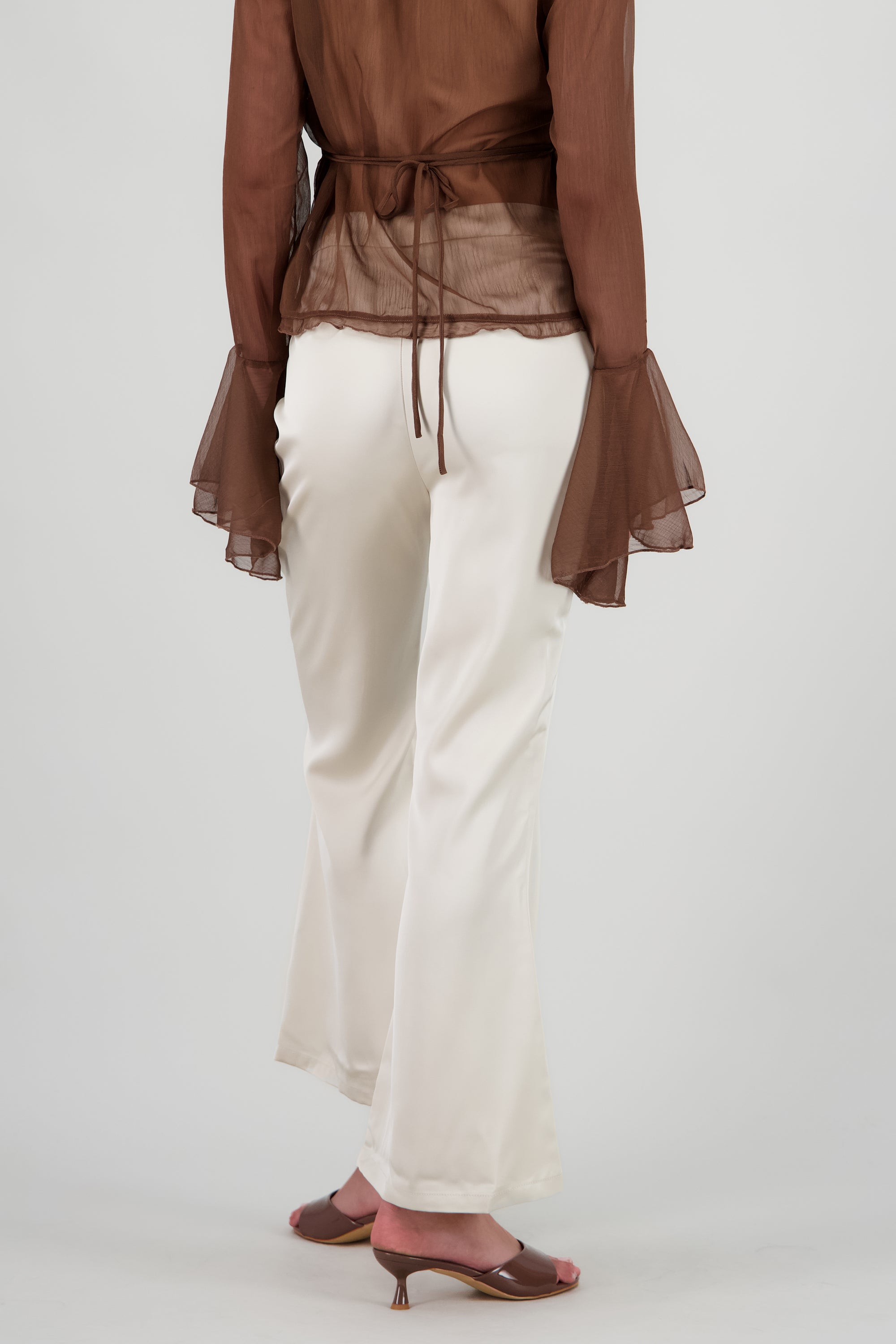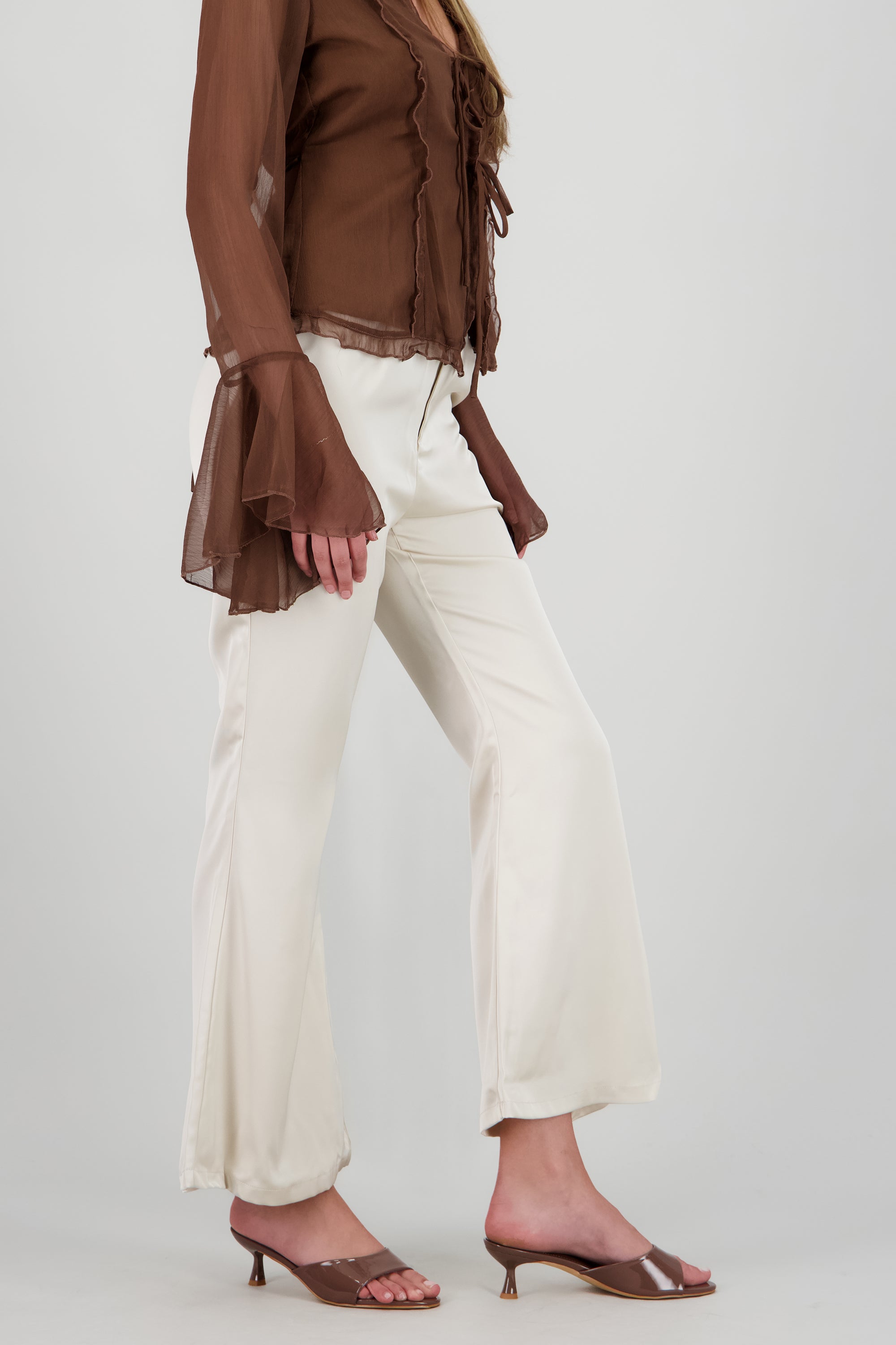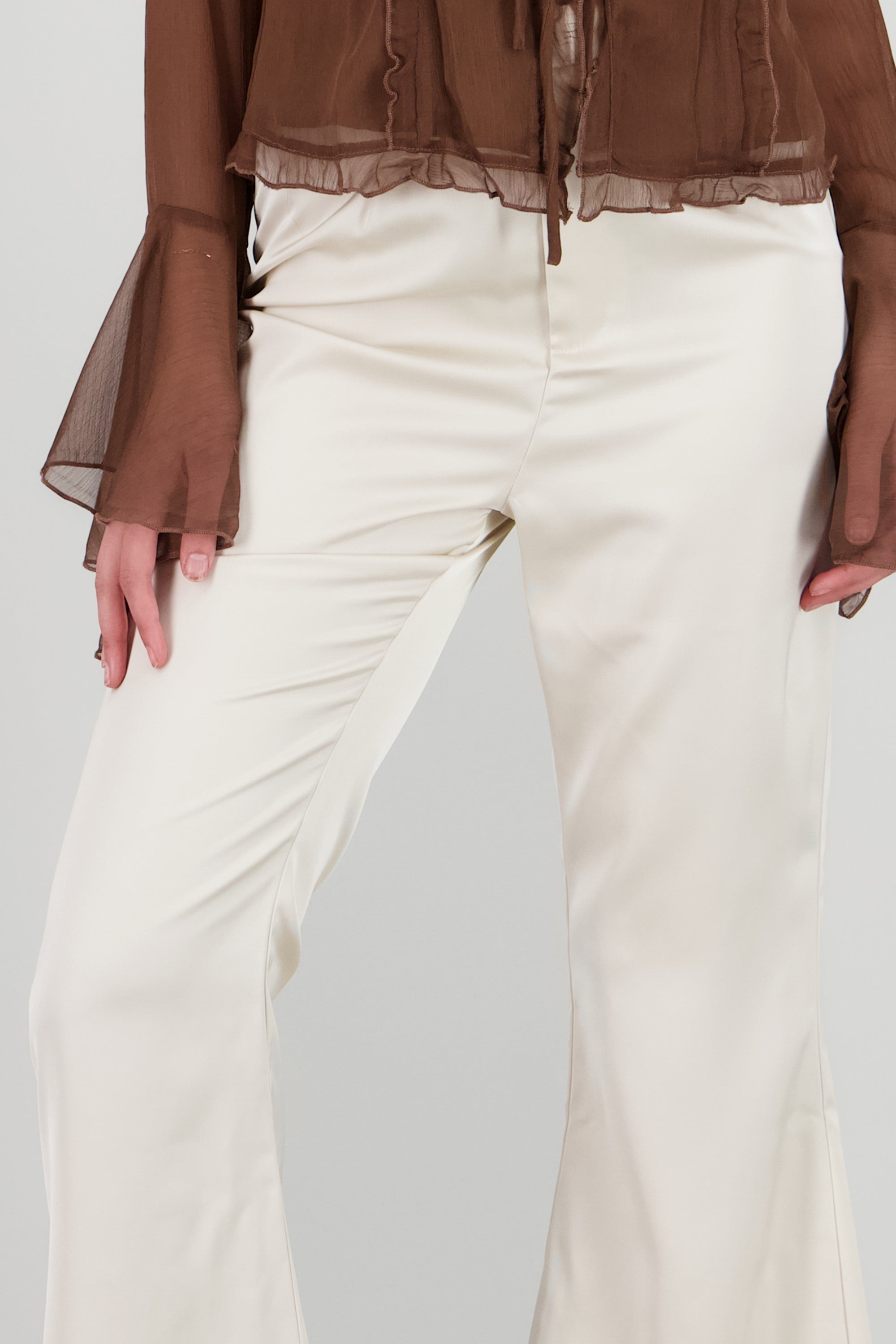 Pantalón de satin con corte recto, diseño de pinzas al frente, cierre oculto y bolsas laterales.