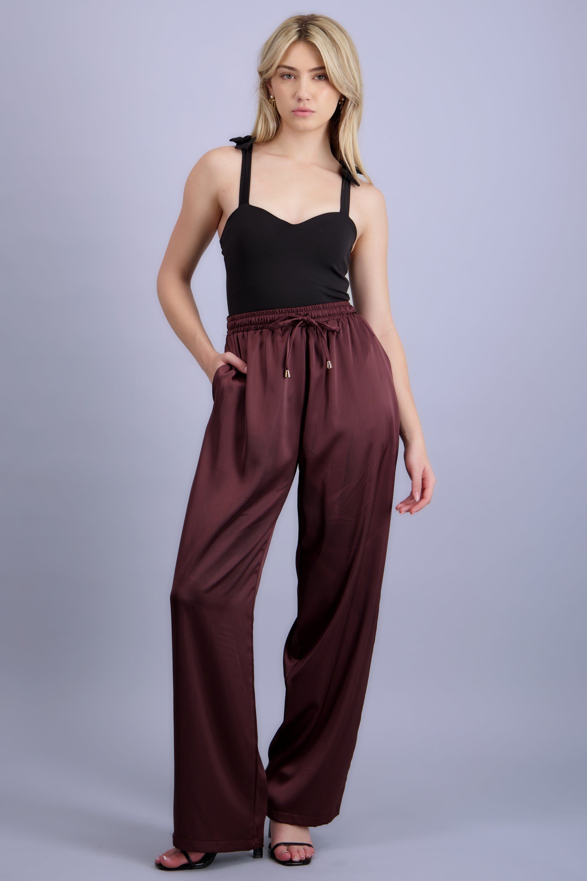 Pantalón wide leg de corte fluido, jareta ajustable y bolsas laterales.
