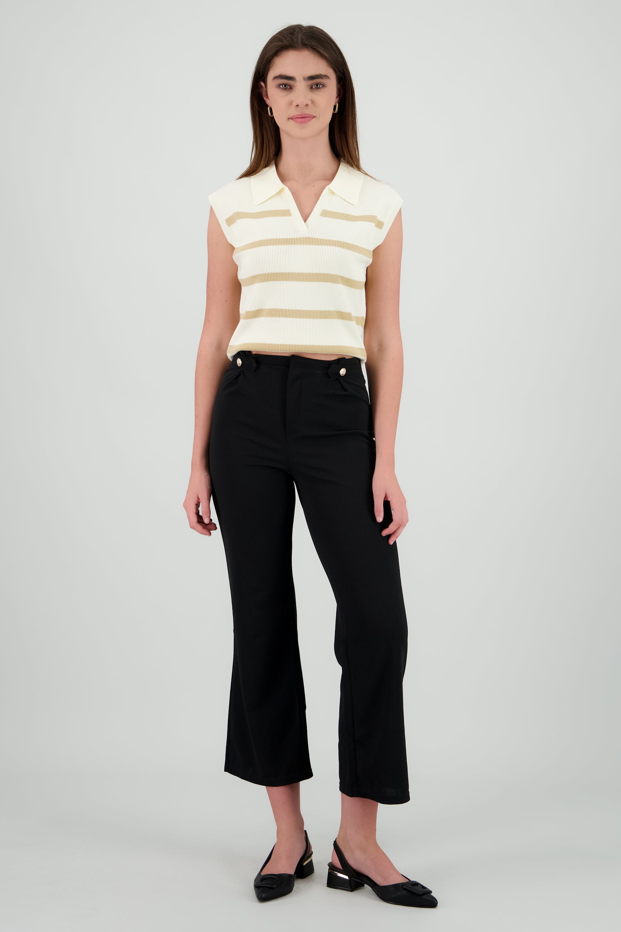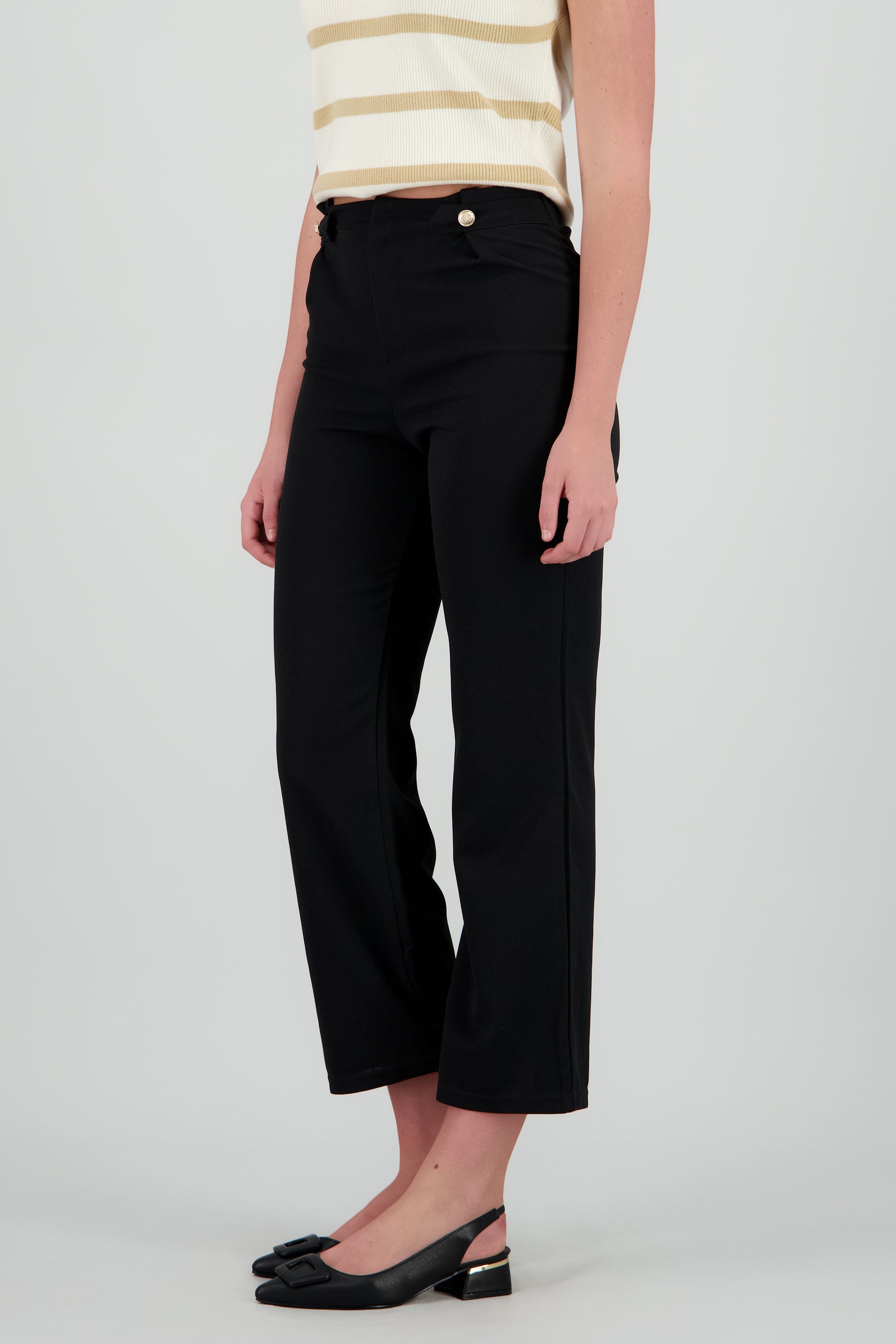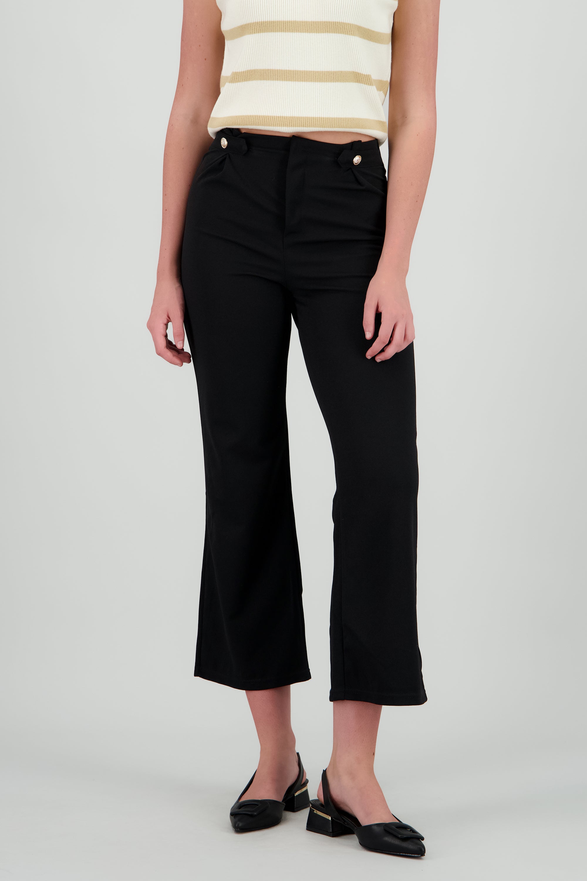 Pantalón de corte recto, con doble botón en la cintura. Detalles de bolsas y cierre de cremallera.