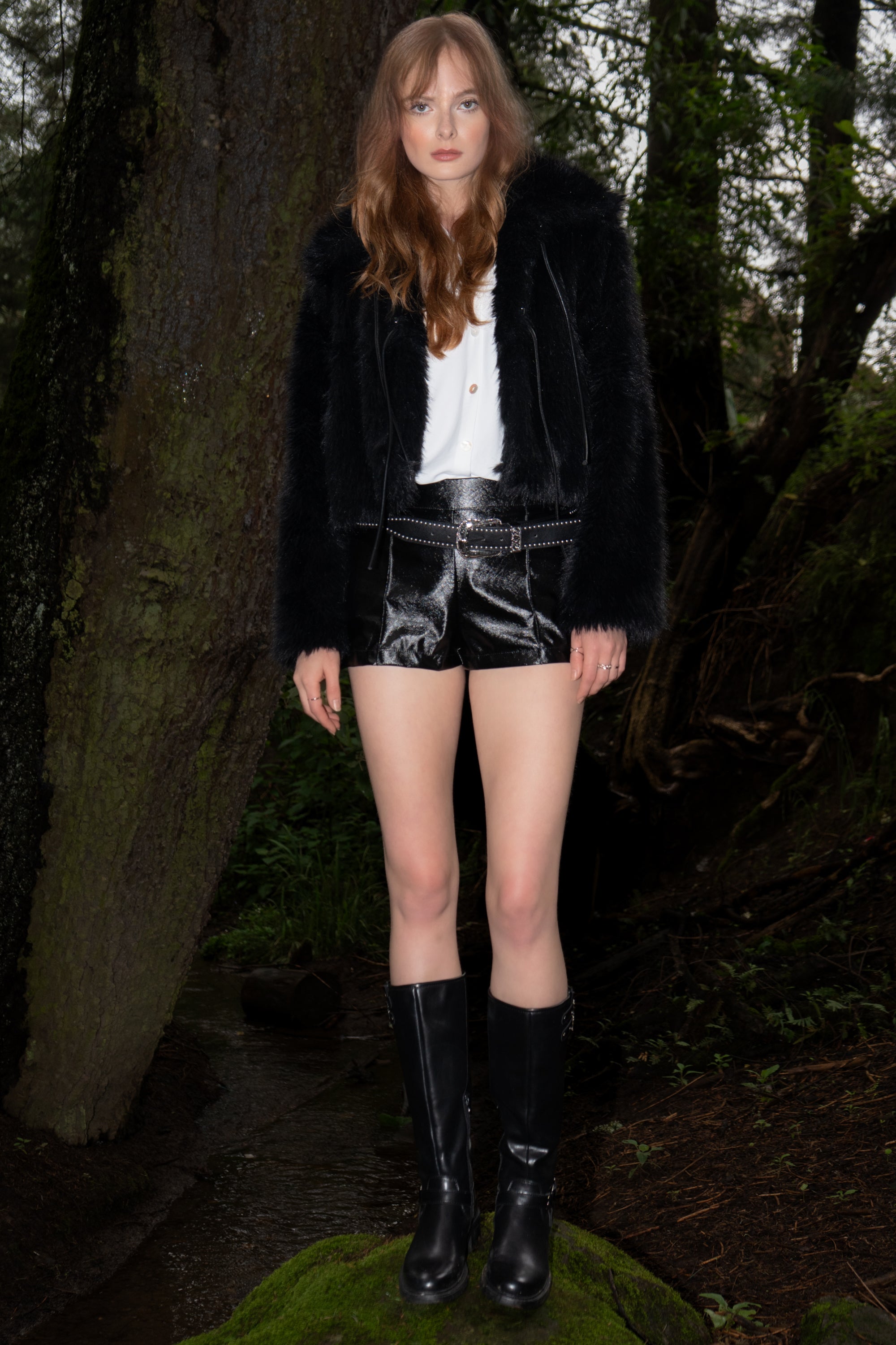 Short mini PU con acabado brillante, cintura alta y ajuste ceñido.