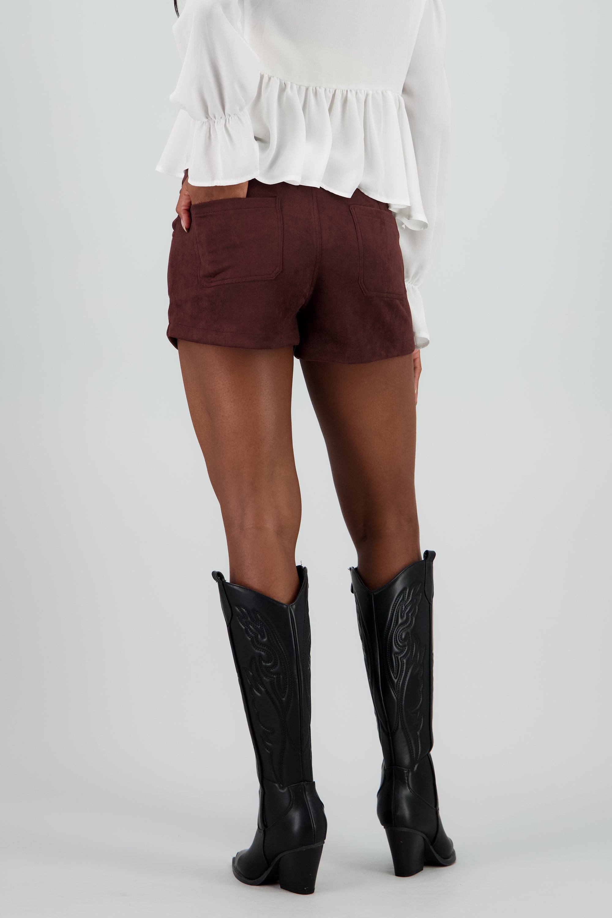 Short suede con cintura alta, corte ajustado y bolsillos laterales.
