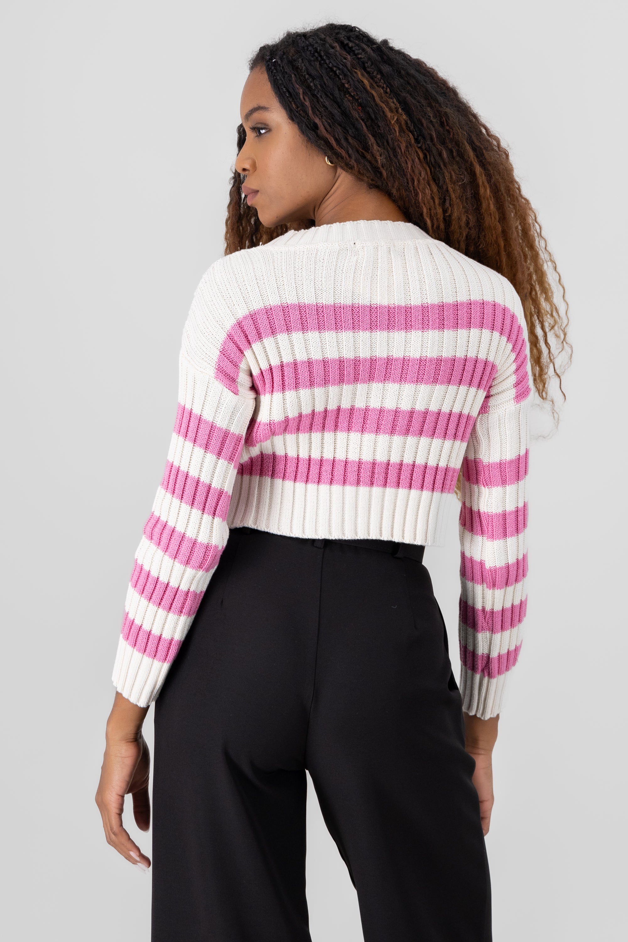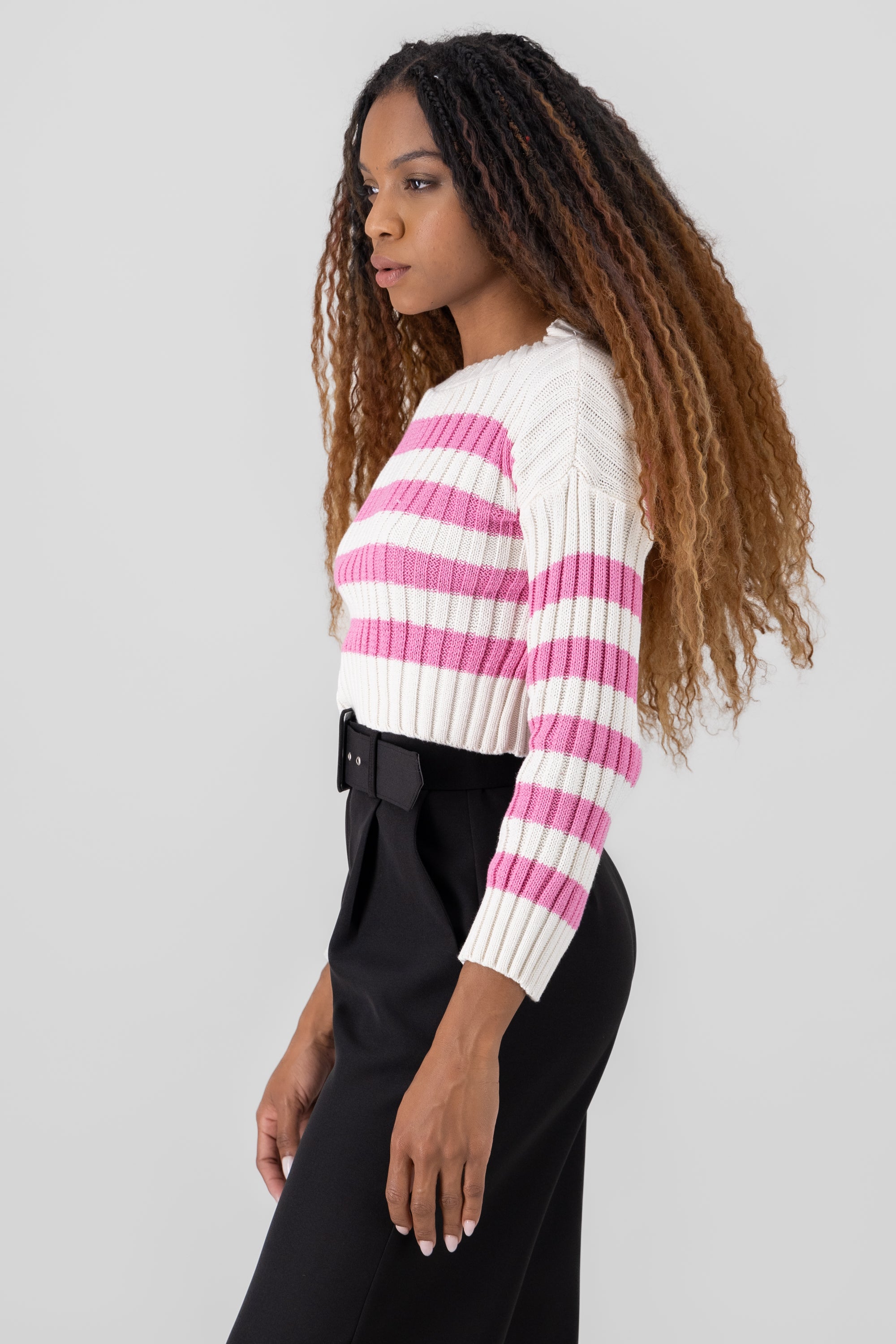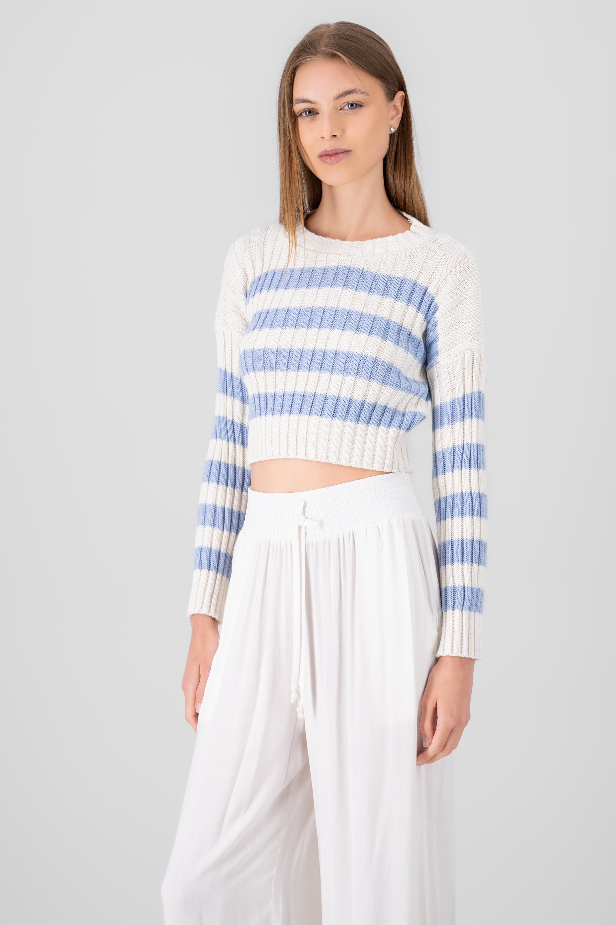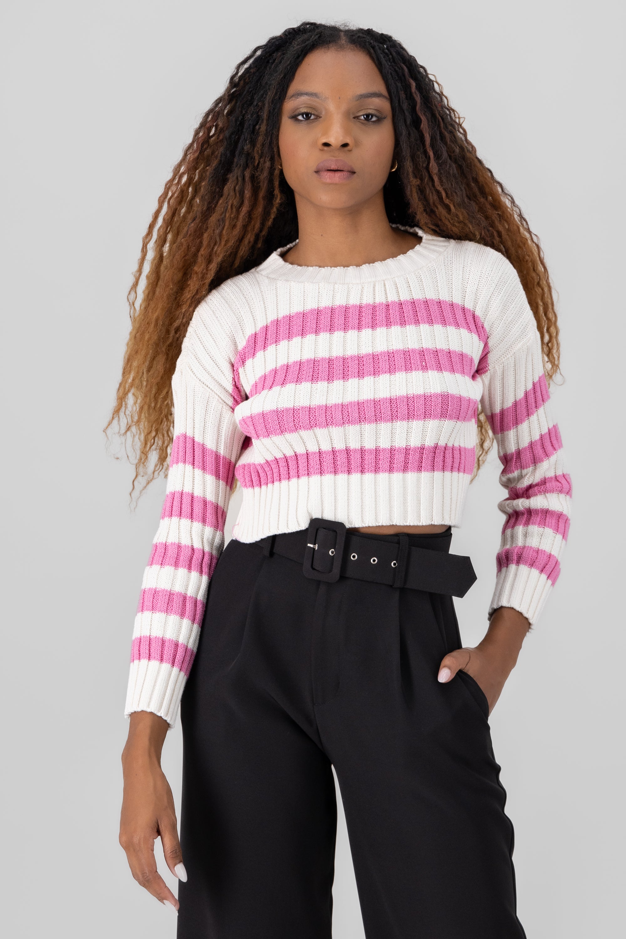 No dejes pasar la oportunidad de lucir a la moda y sentirte cómoda con nuestro suéter crop rayas bicolor. ¡Hazte con el tuyo ahora!