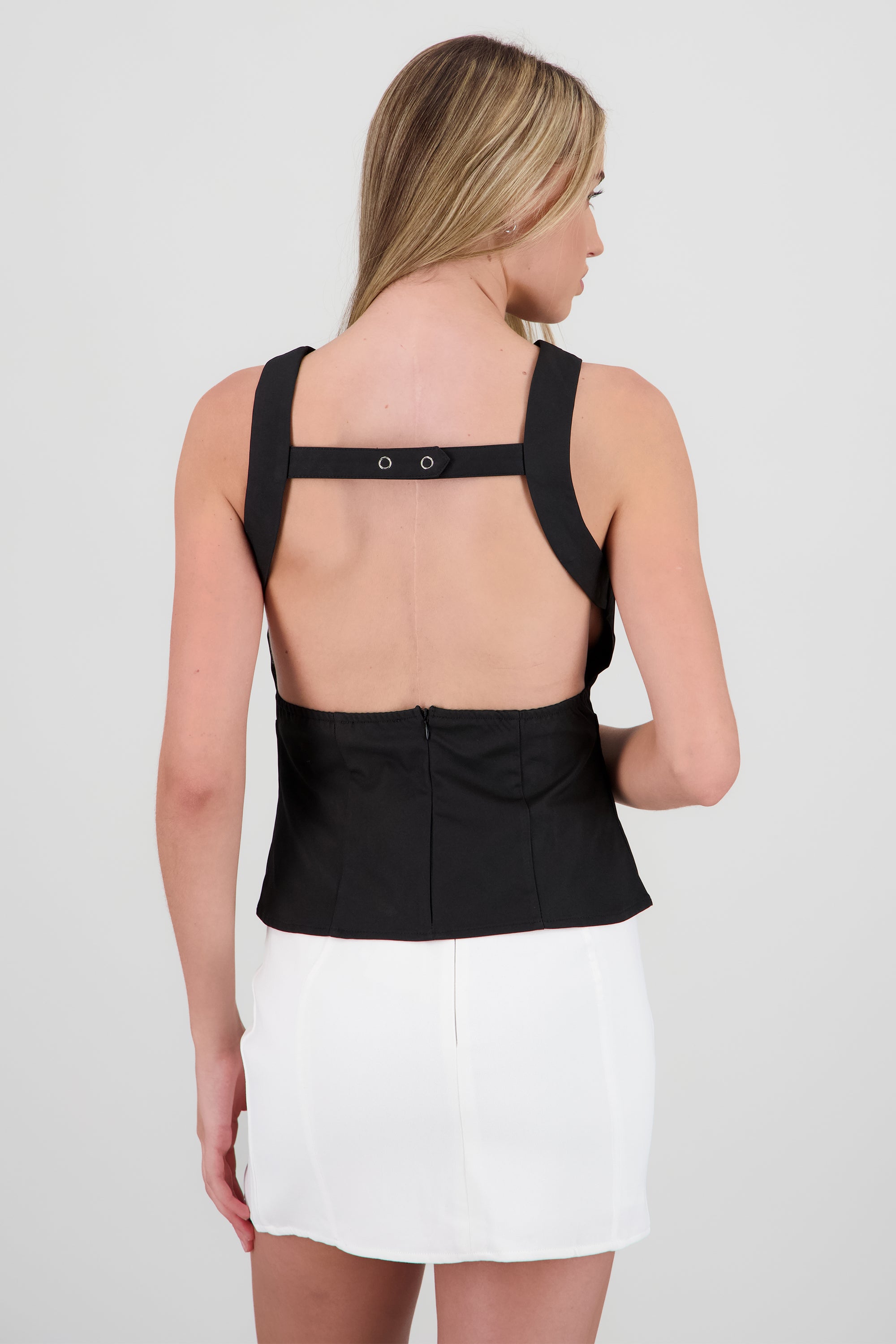 Top de corte ajustado con espalda descubierta. Detalle de tirantes cruzados y cierre trasero.