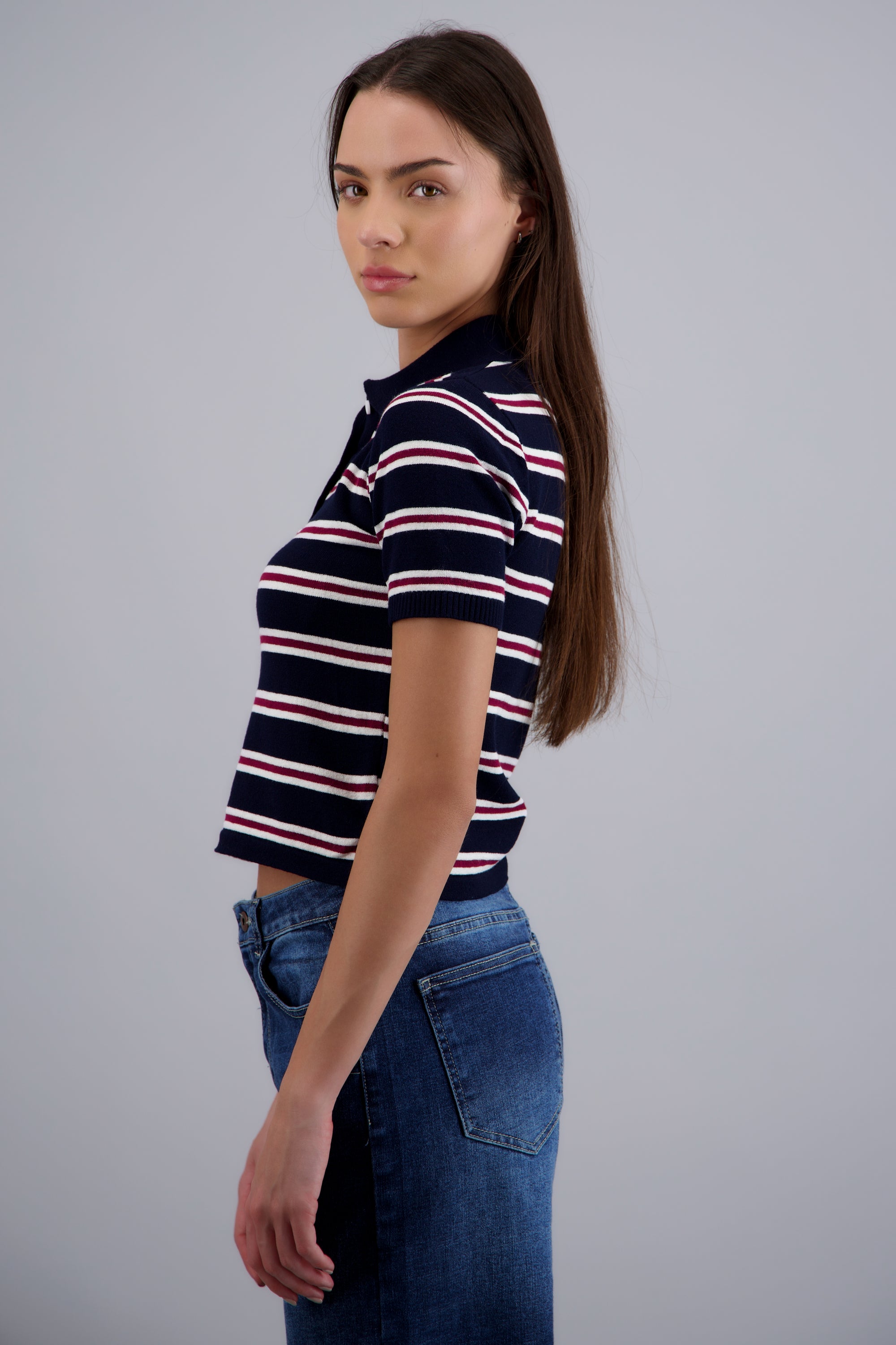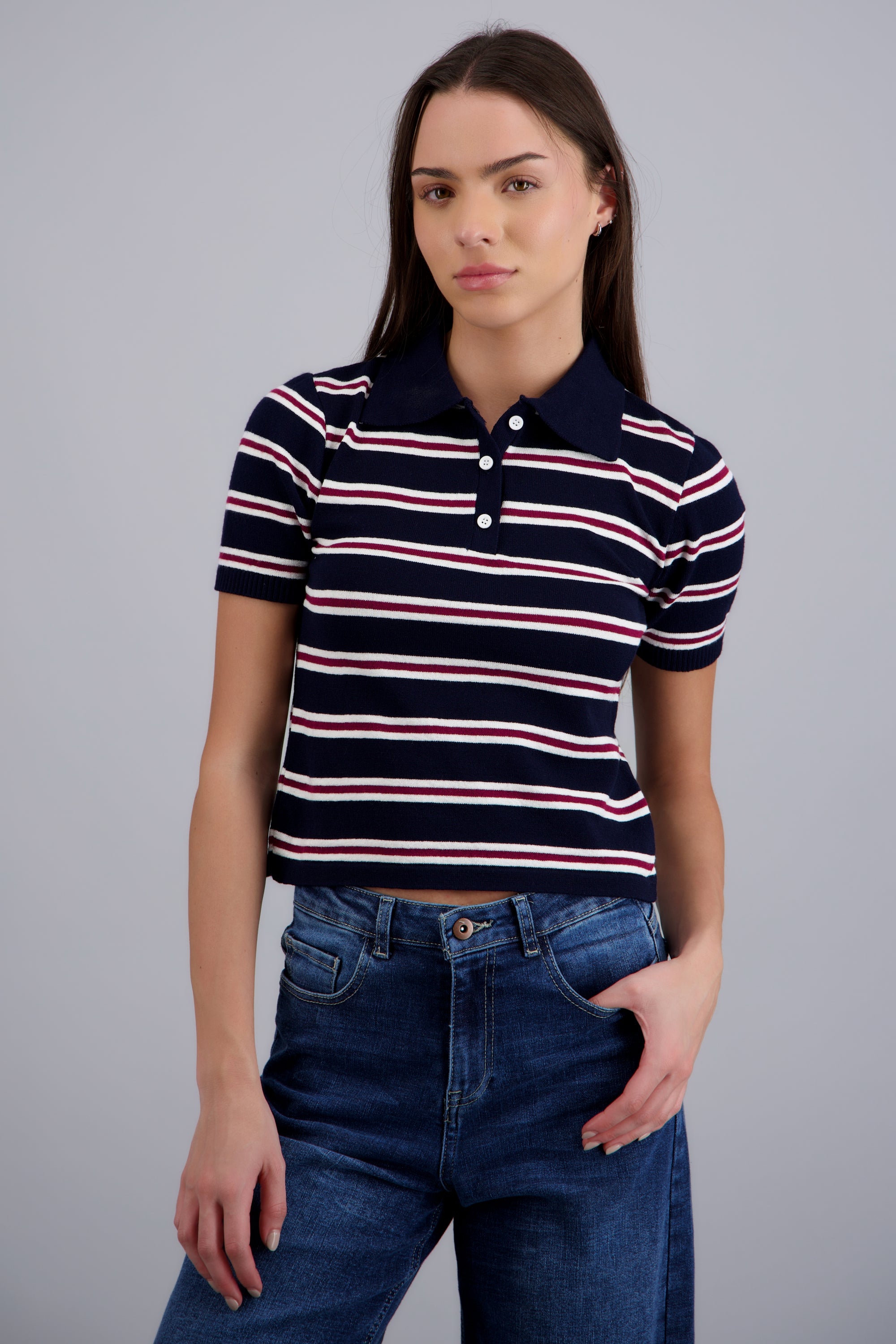Top de cuello polo con diseño de rayas en contraste. Corte ajustado, manga corta, y cierre de botones en el cuello.