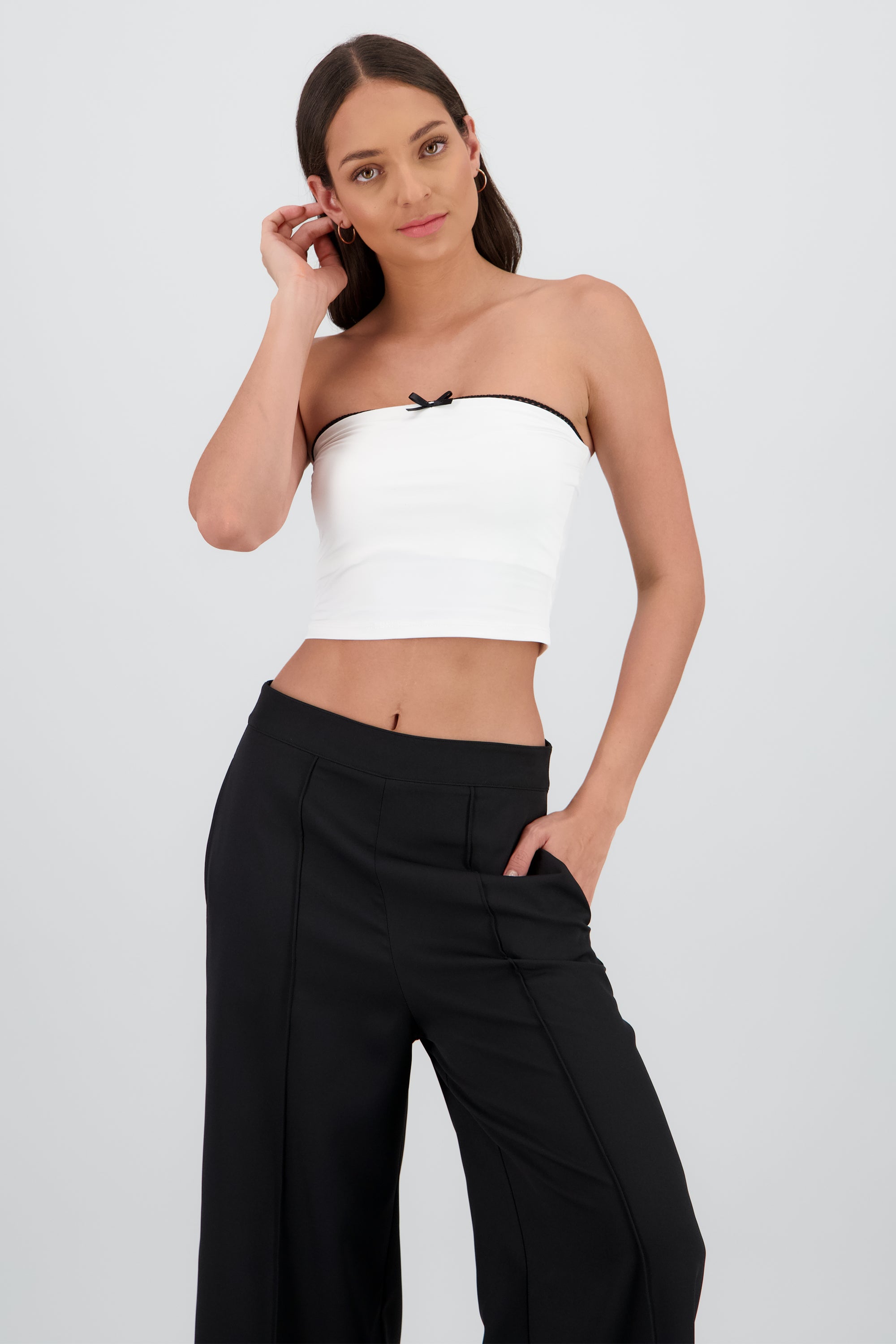 Top con detalle de moño en el frente, ajuste entallado y diseño off shoulder.