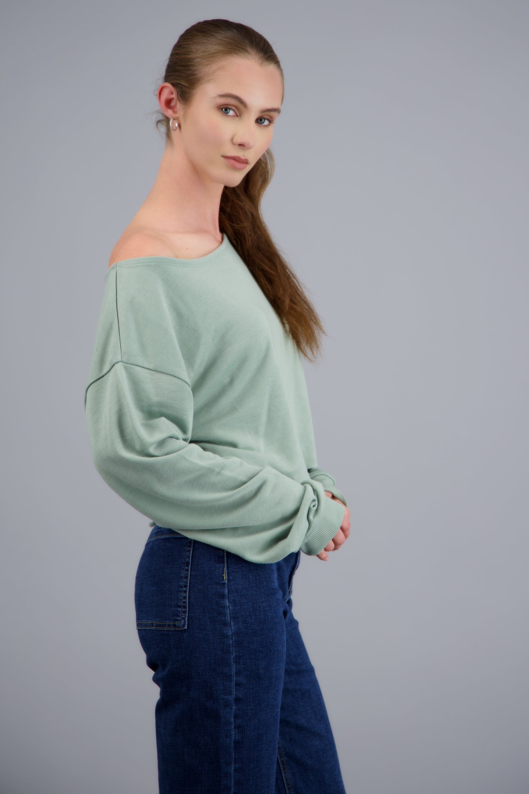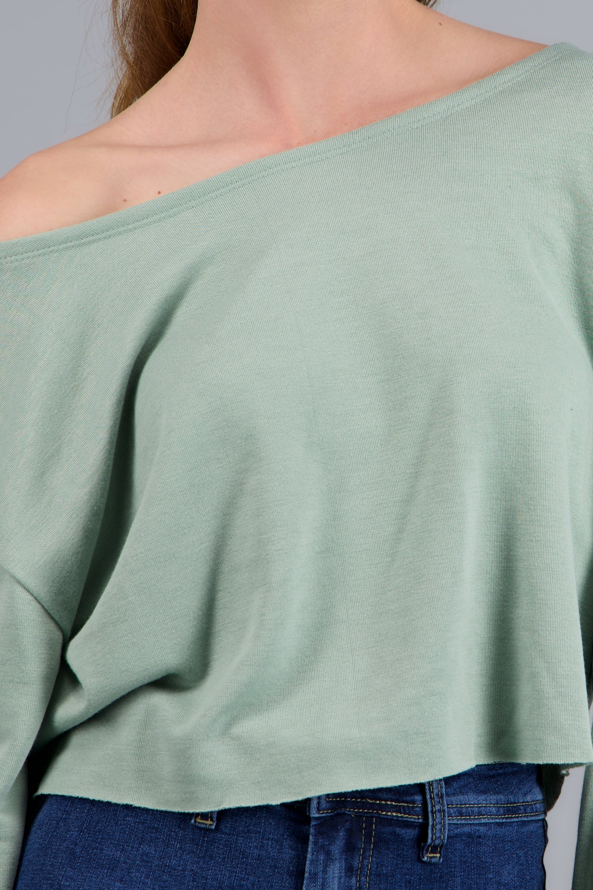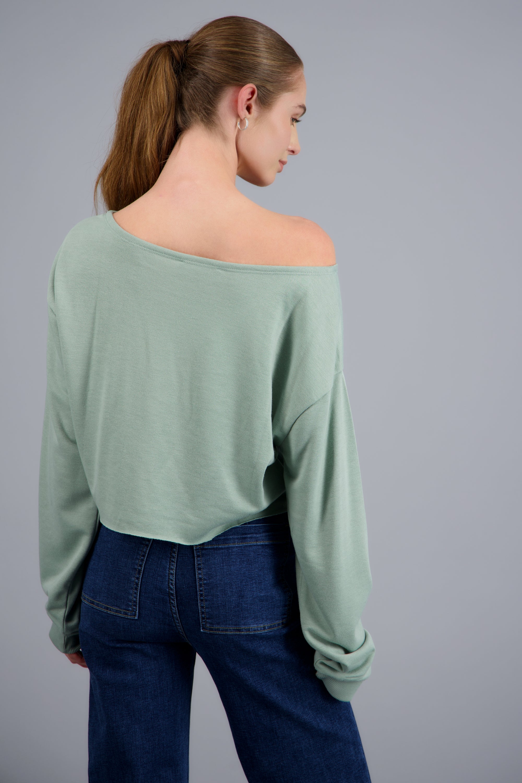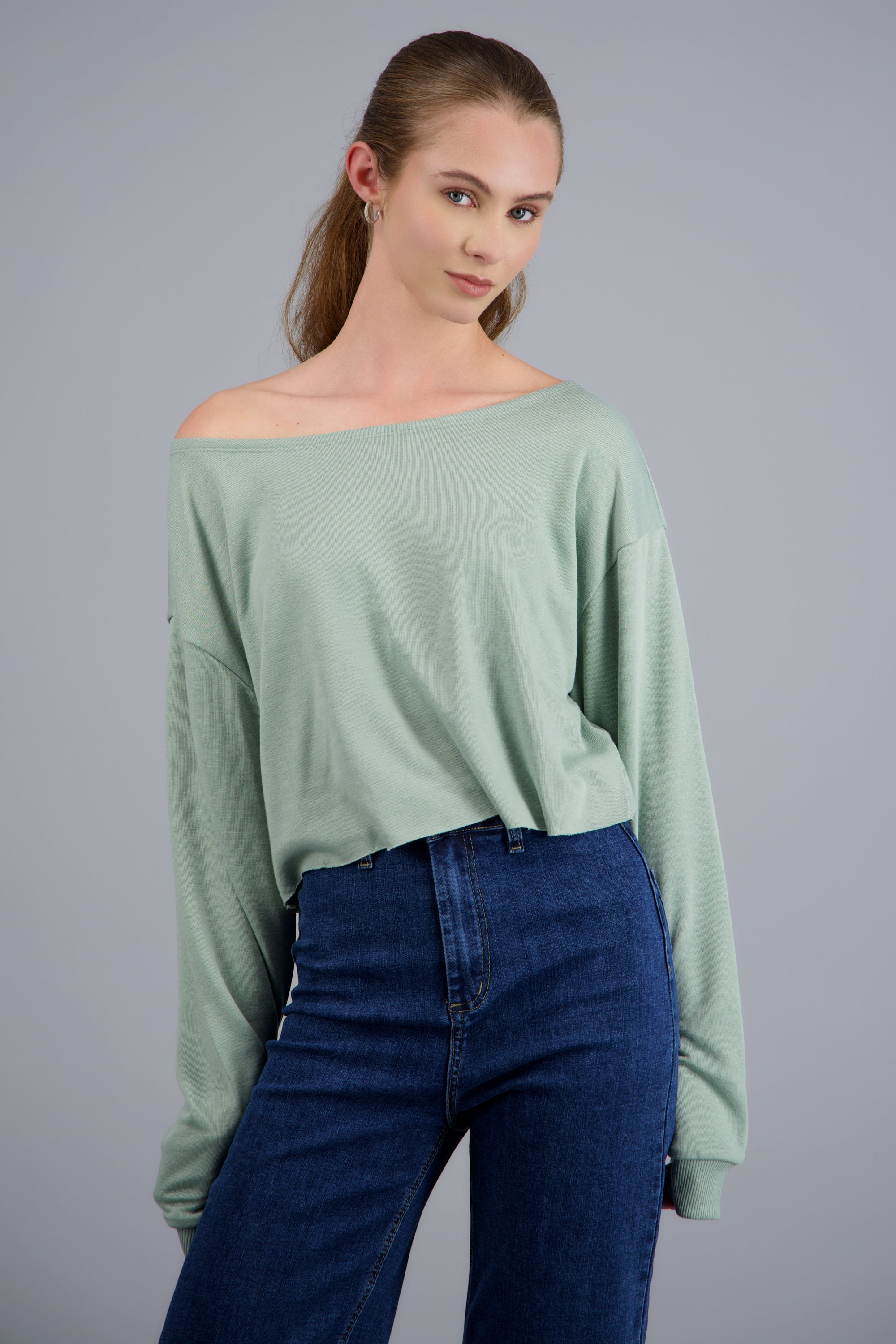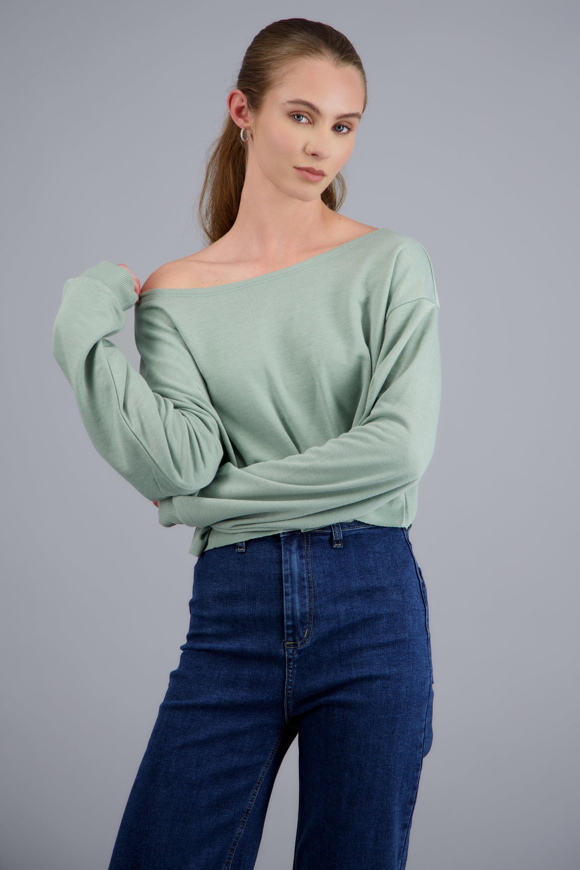 Top de manga larga de corte recto. Detalles de costura y diseño asimétrico.