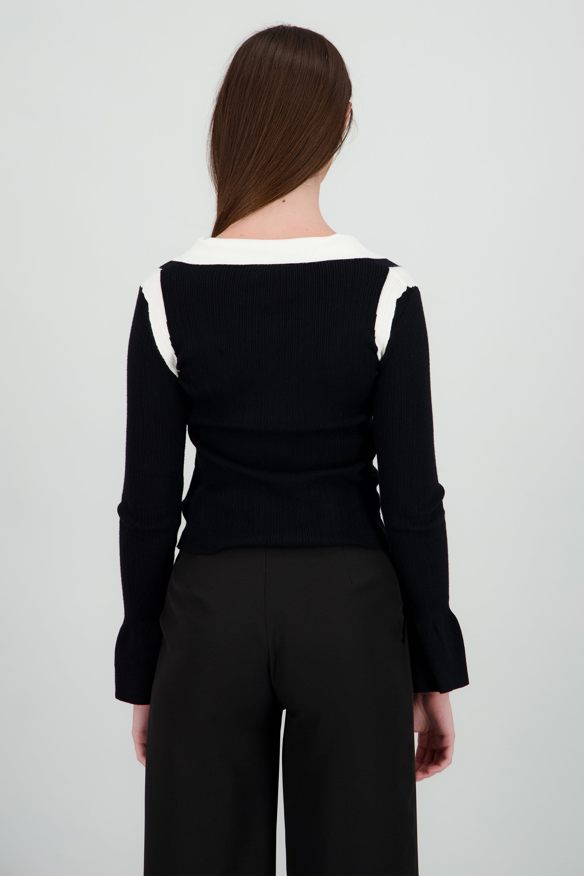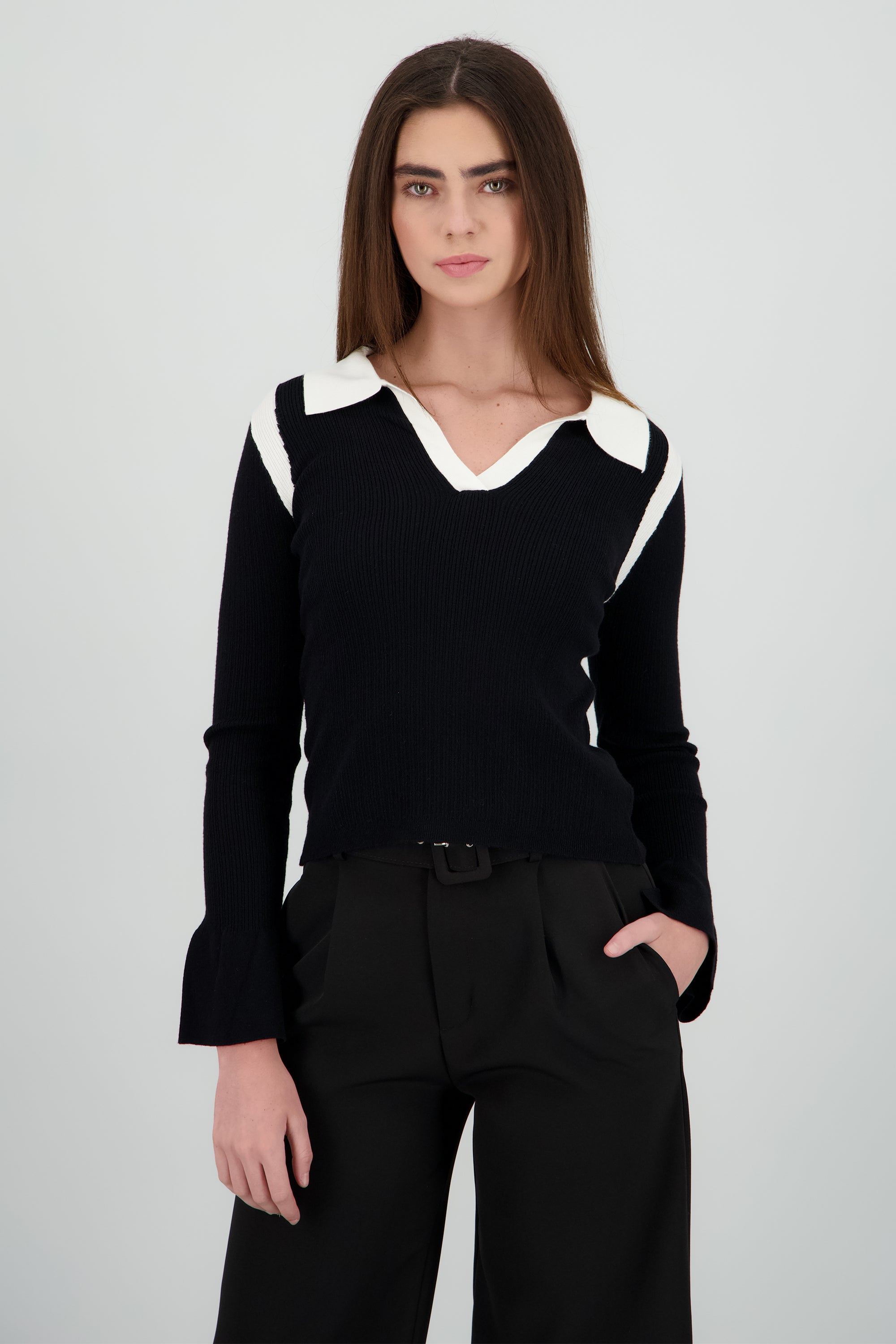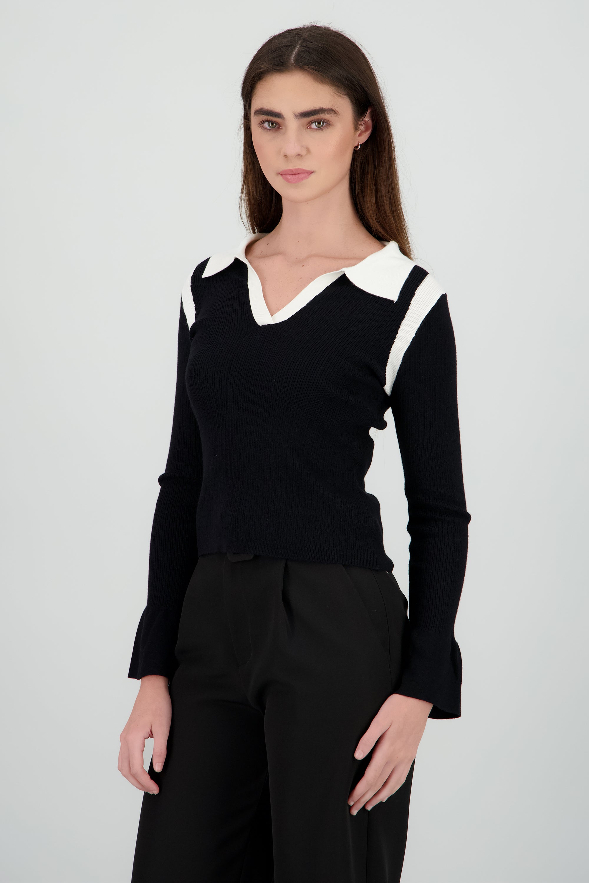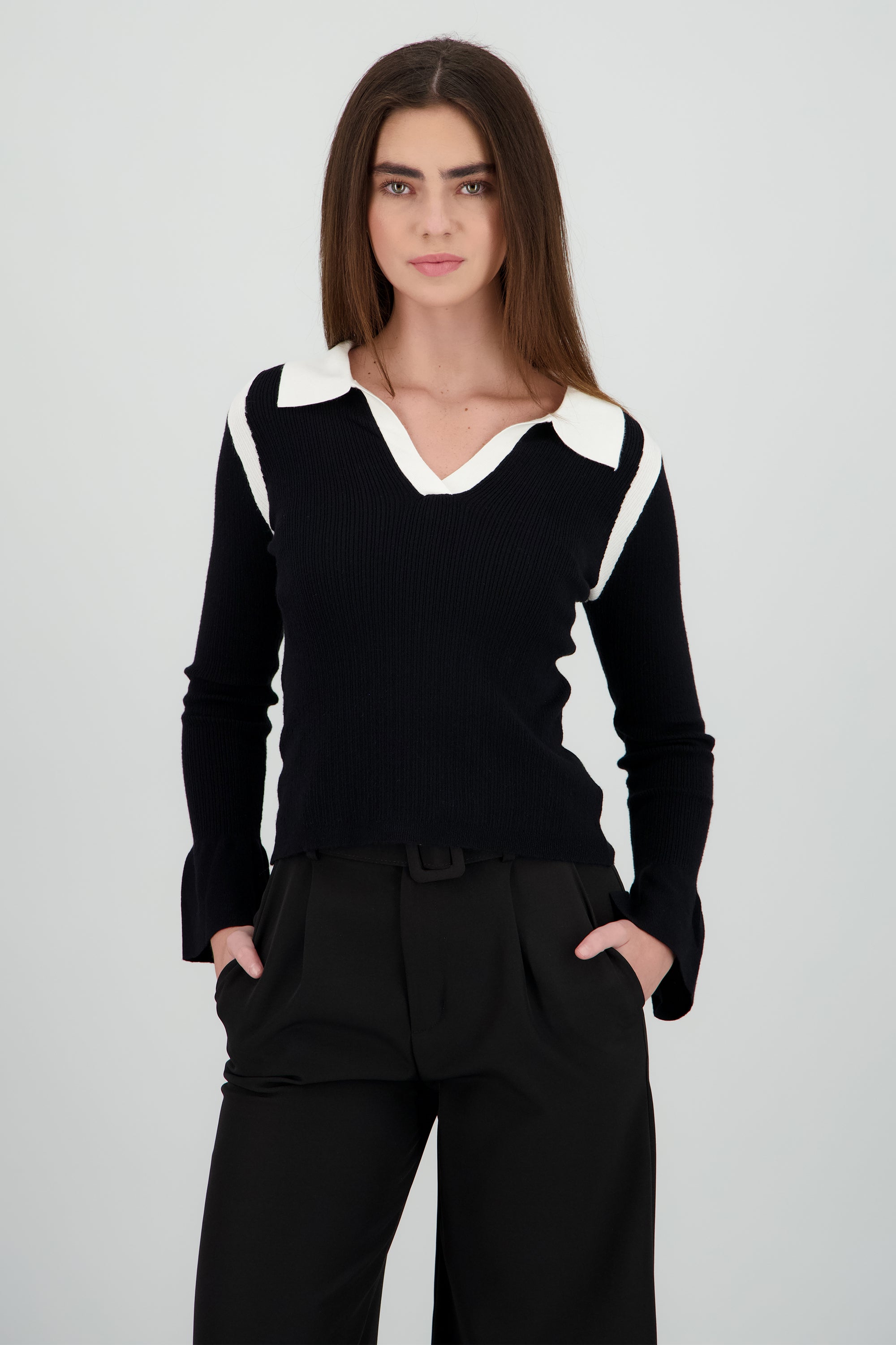 Top manga larga con cuello polo tejido