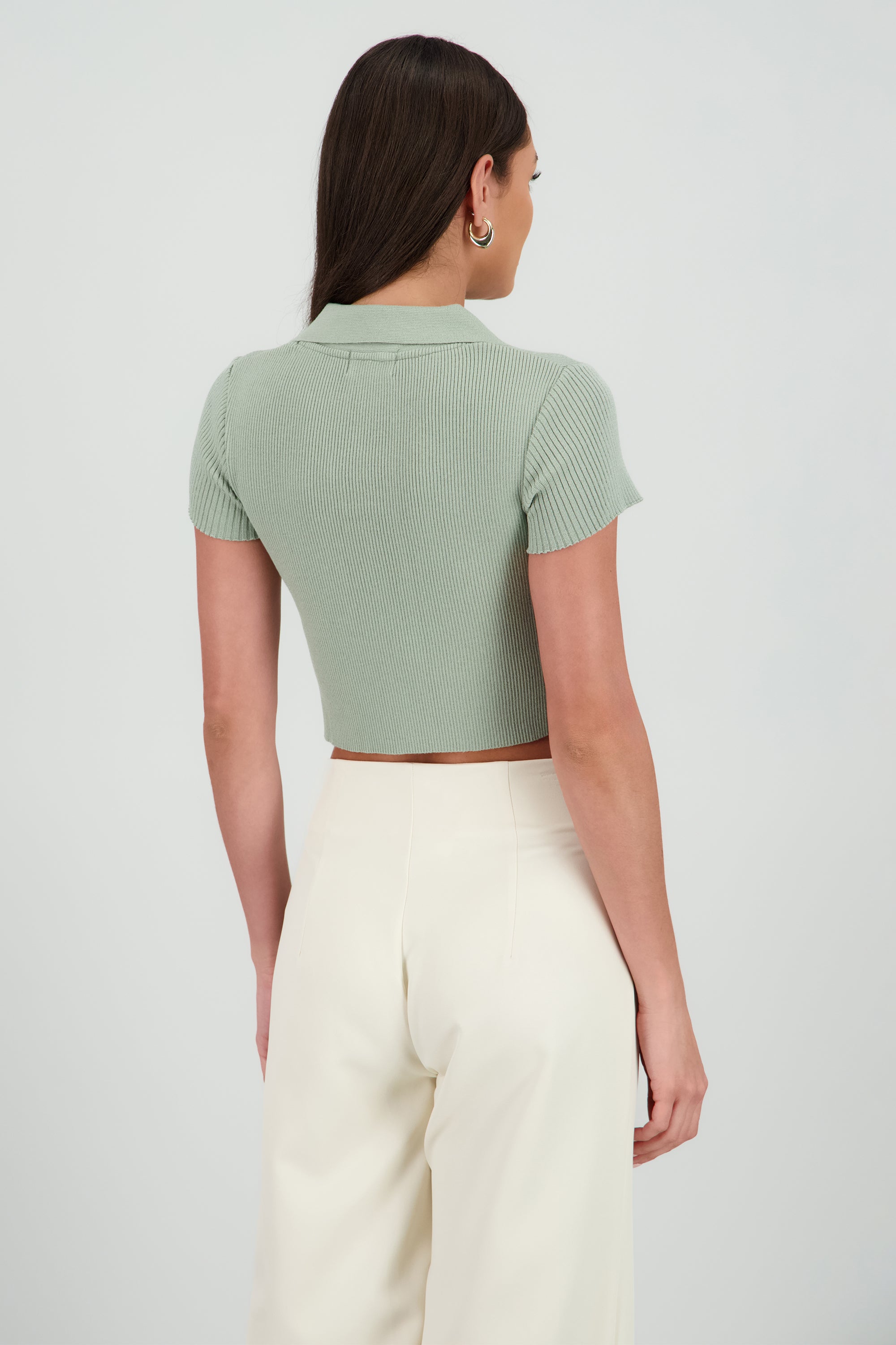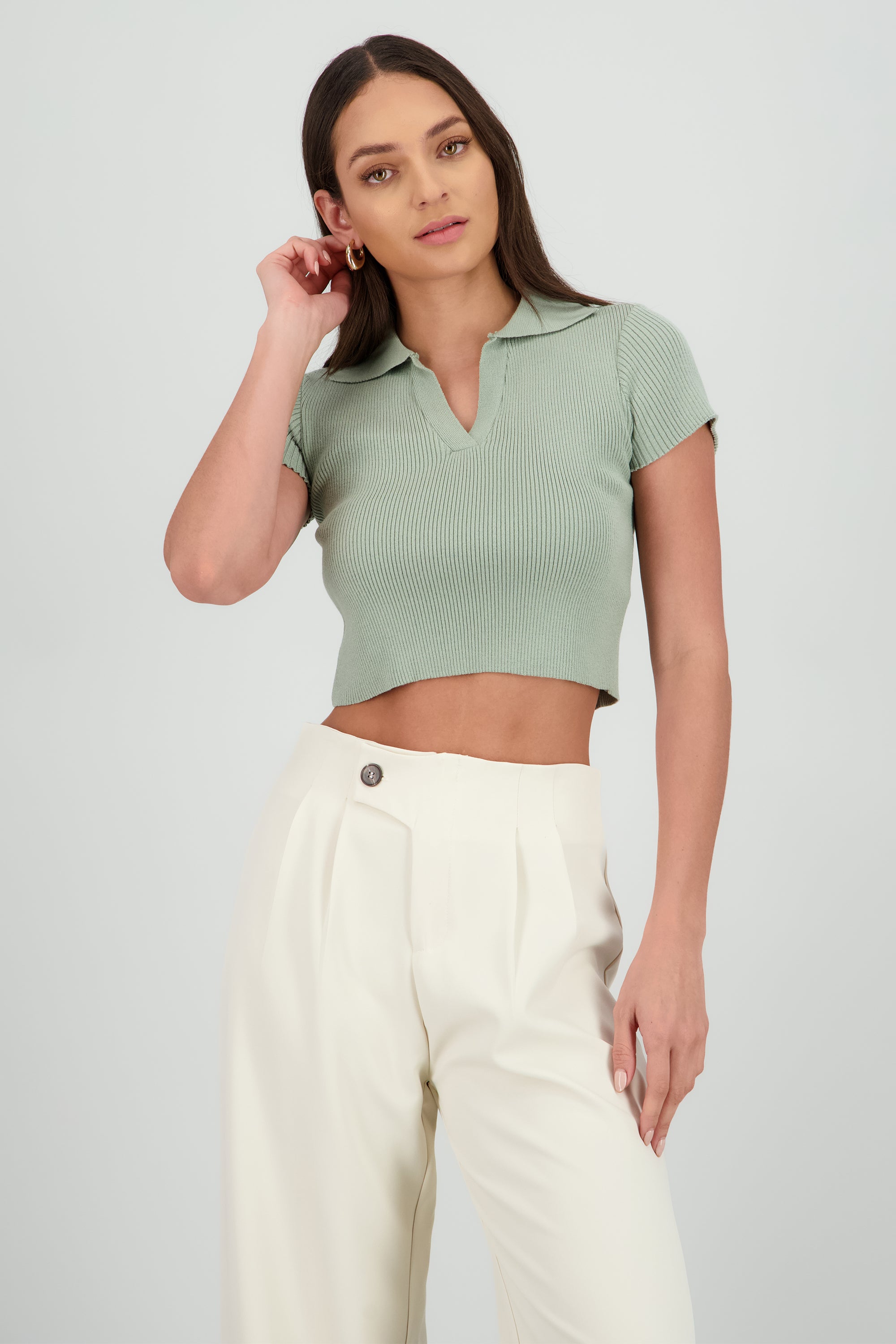 Top liso tejido, con diseño clásico, cuello tipo polo, manga corta y corte ajustado.