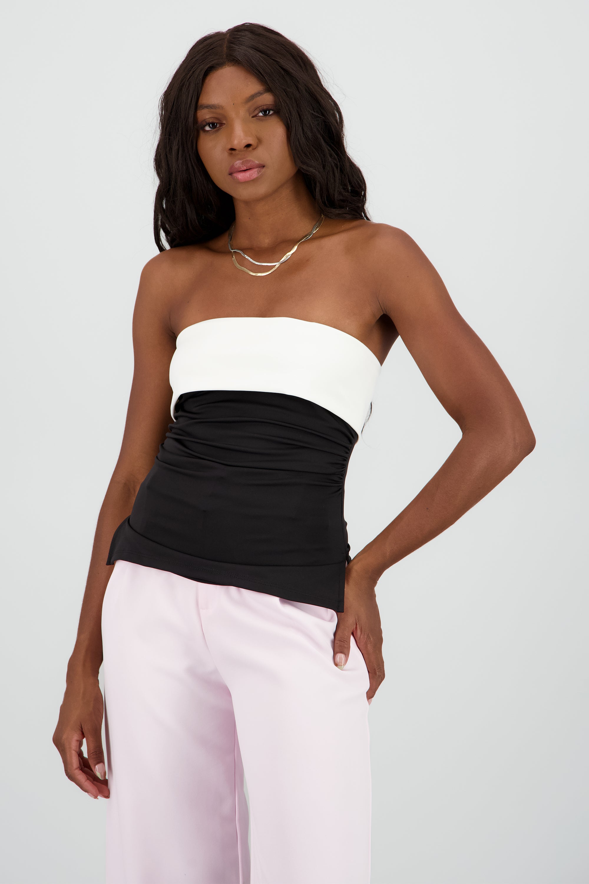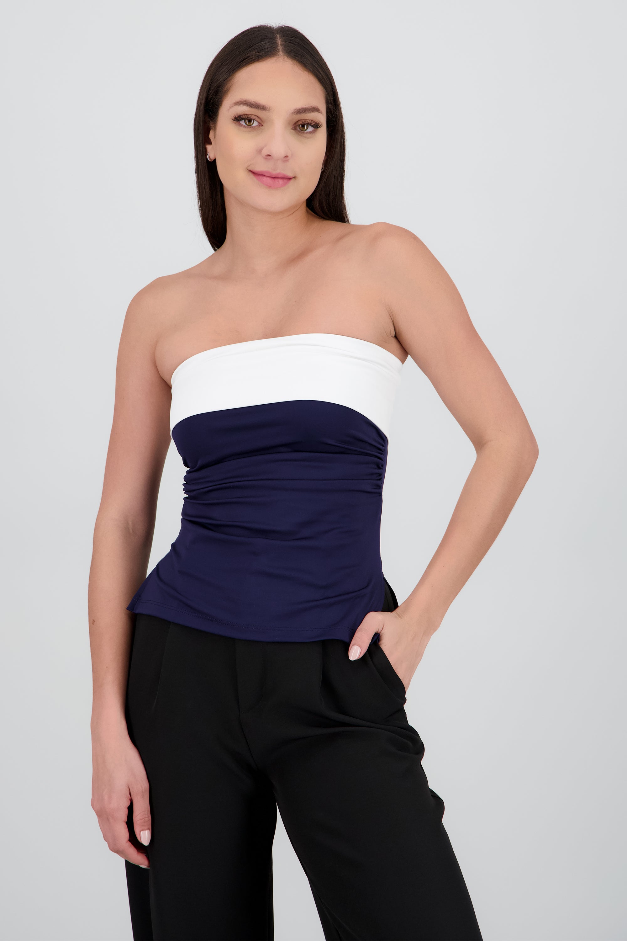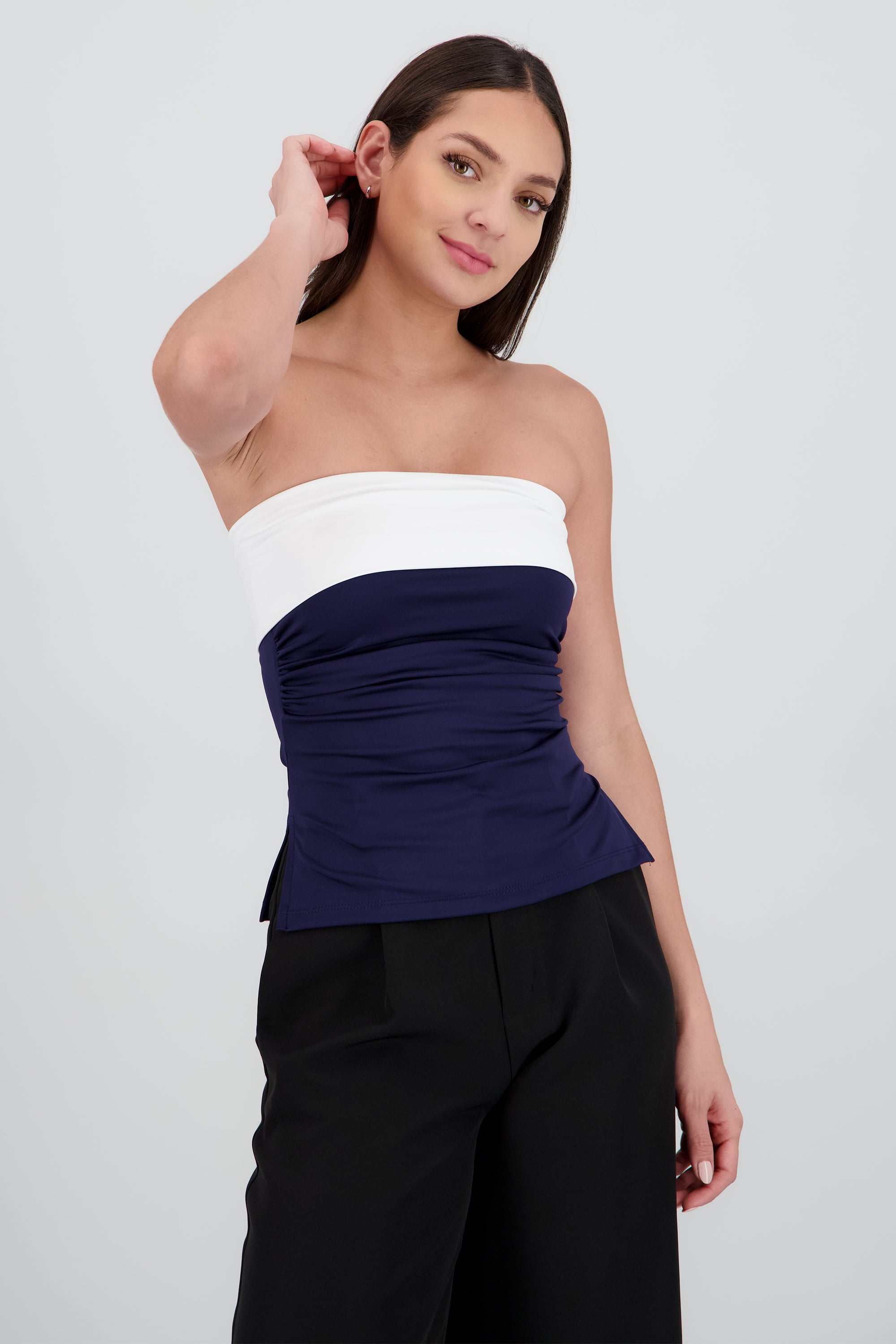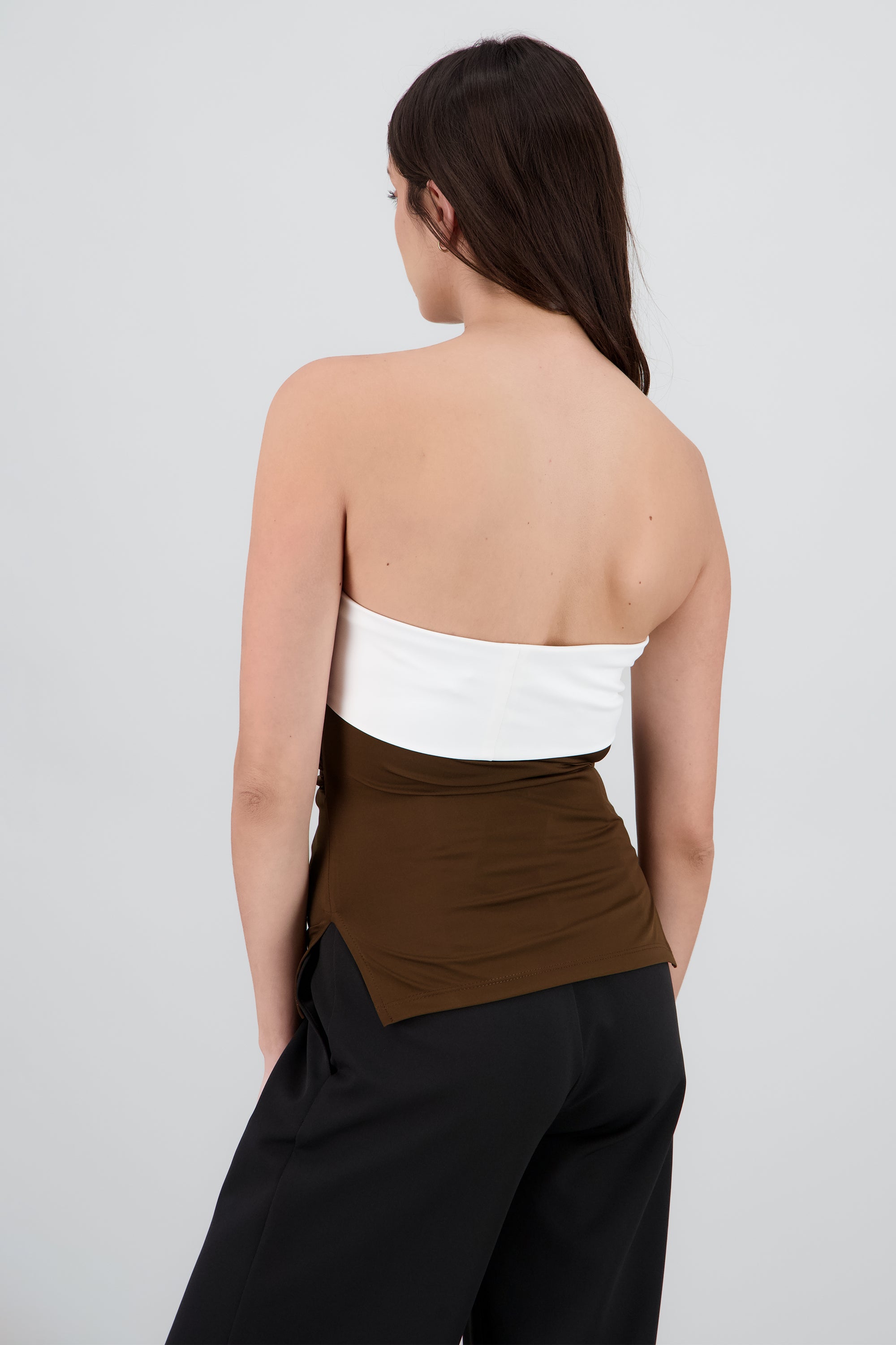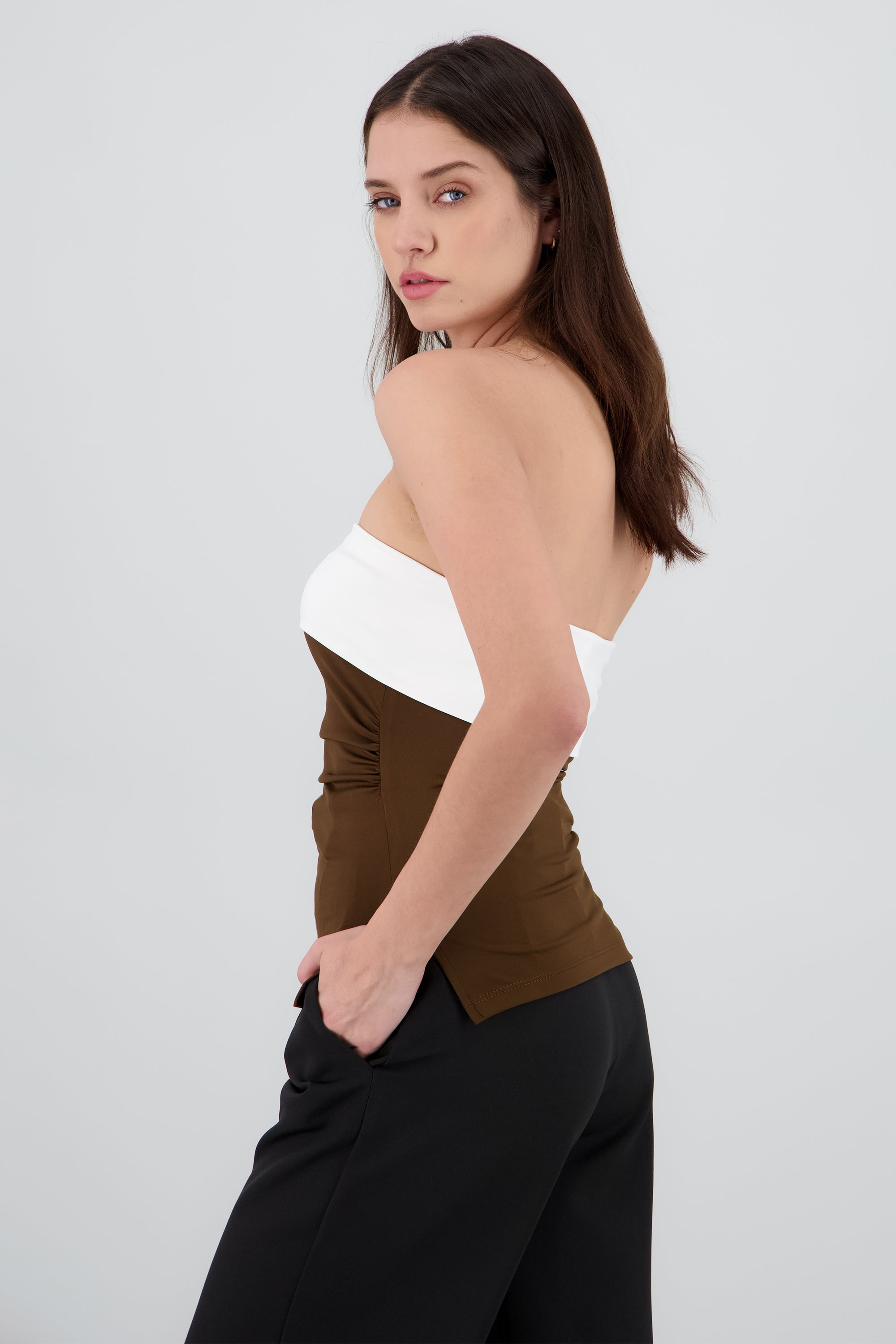 Top tubo de doblez contraste: prenda ajustada, sin mangas, con acabados en contraste.