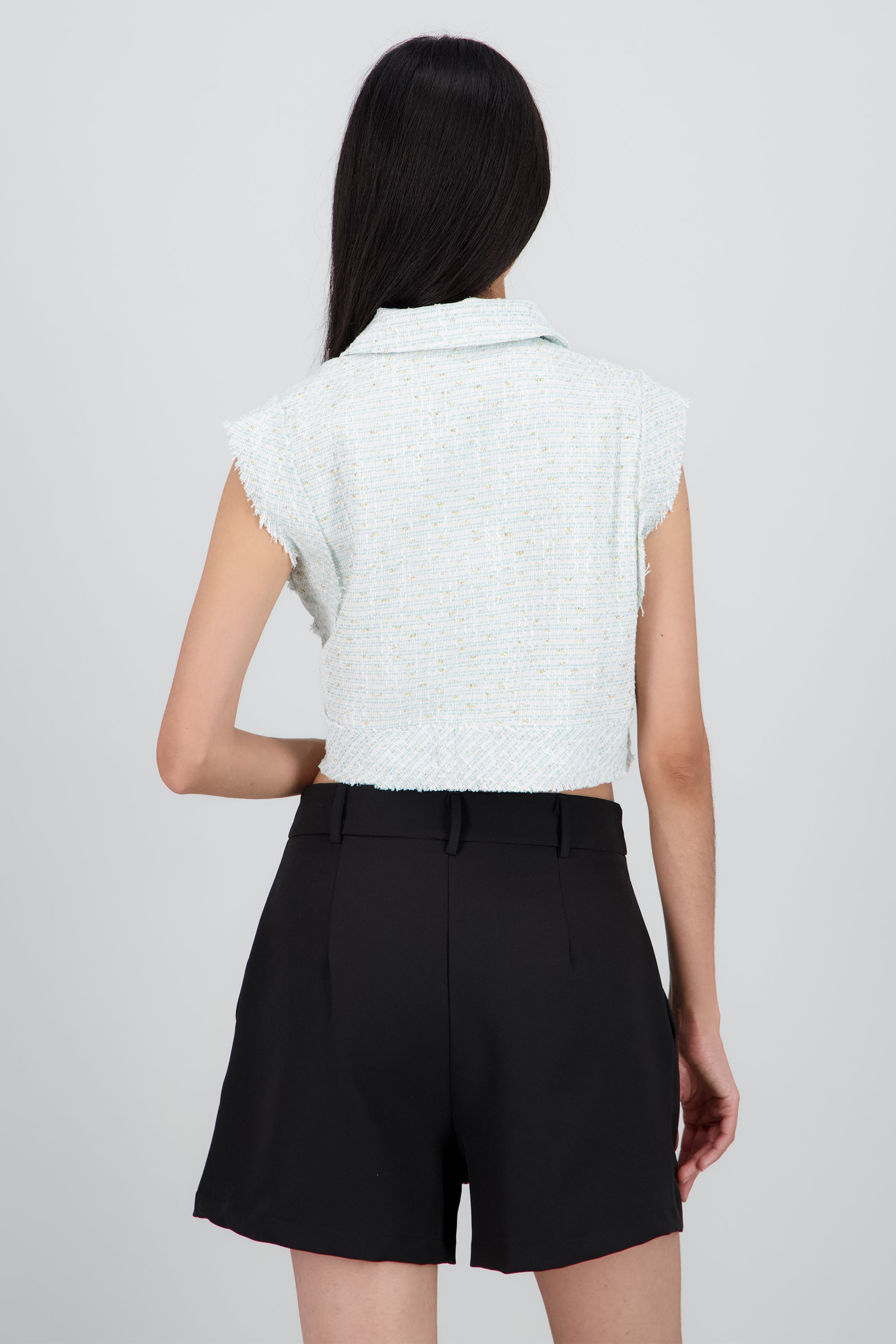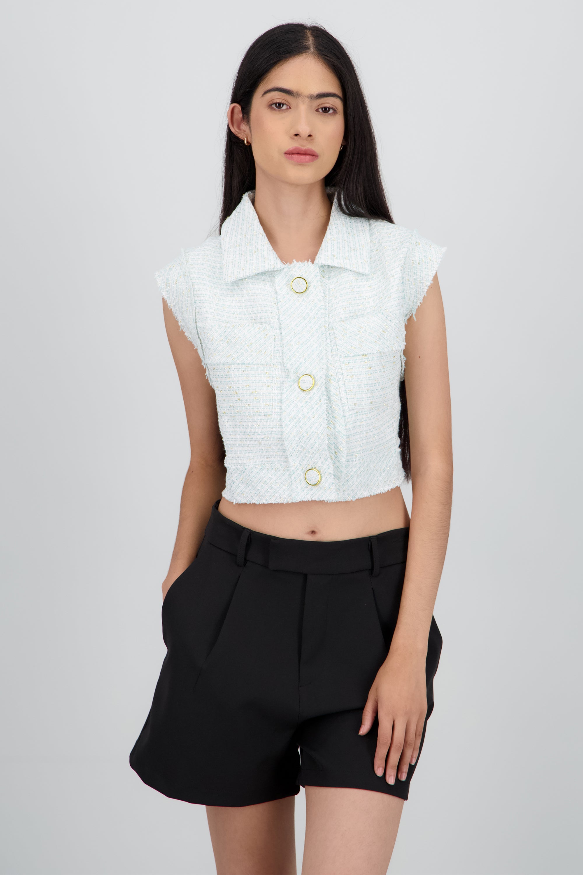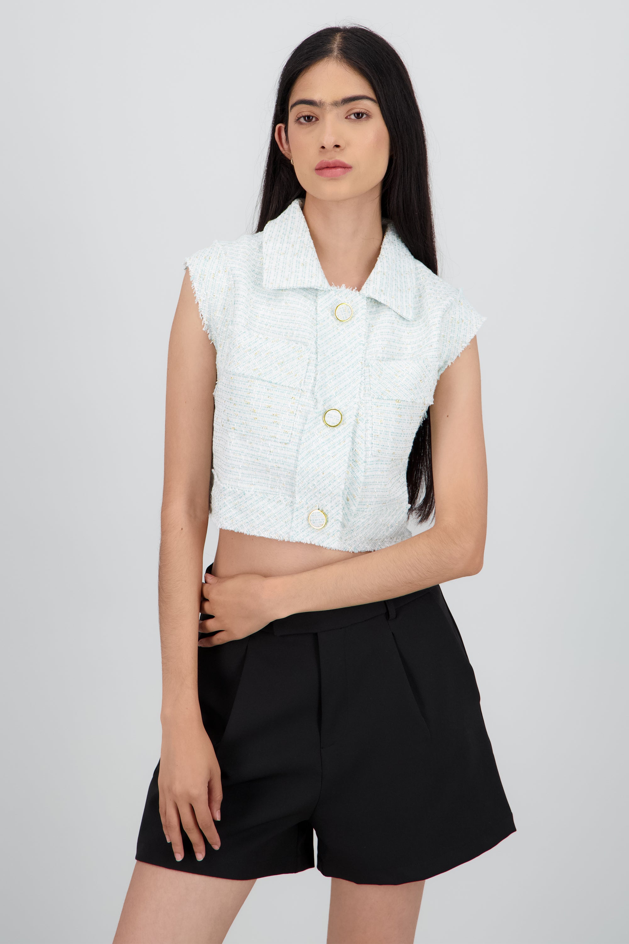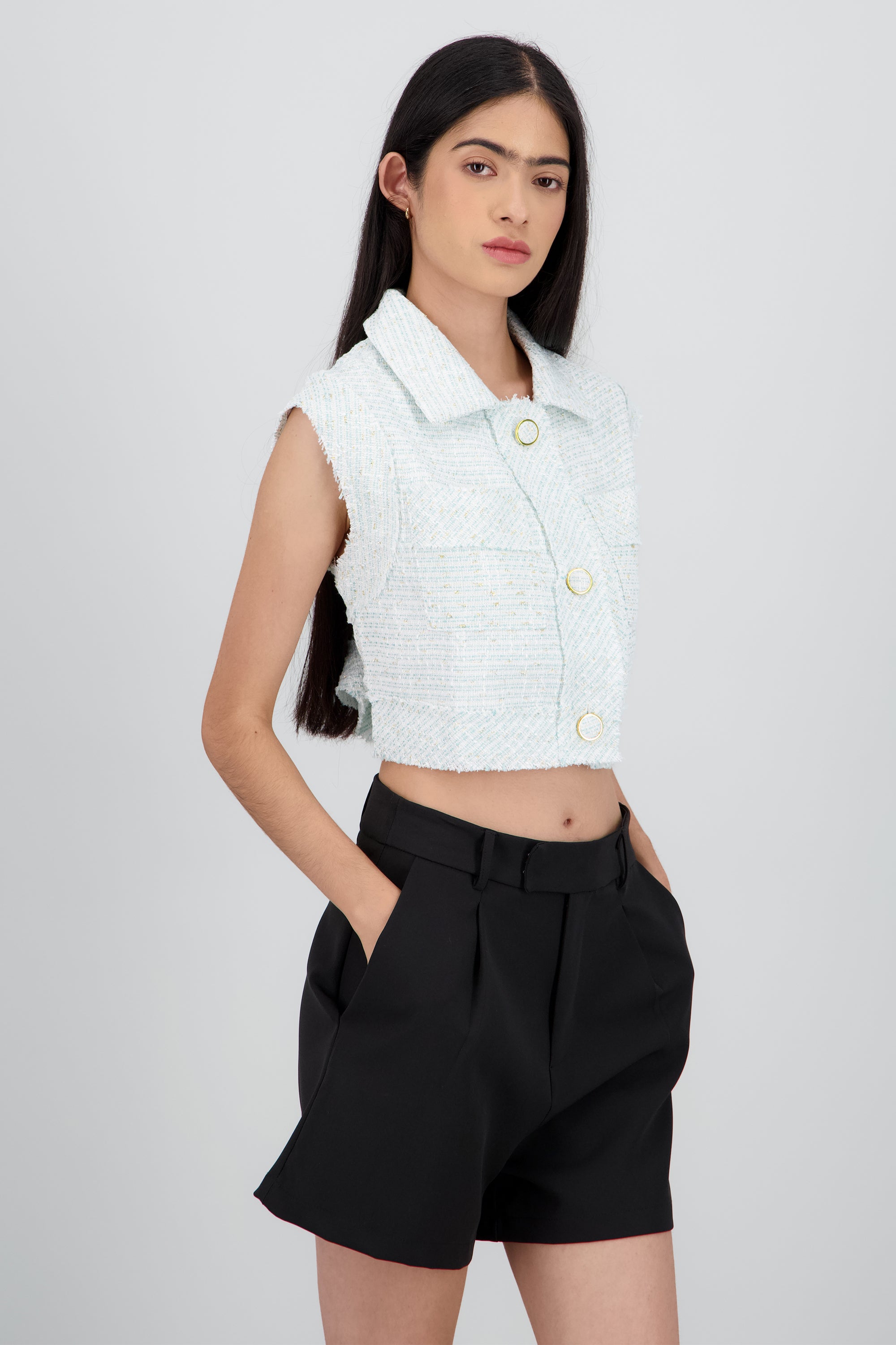 Top de tweed sin mangas con corte recto, botones frontales y detalles de costura.