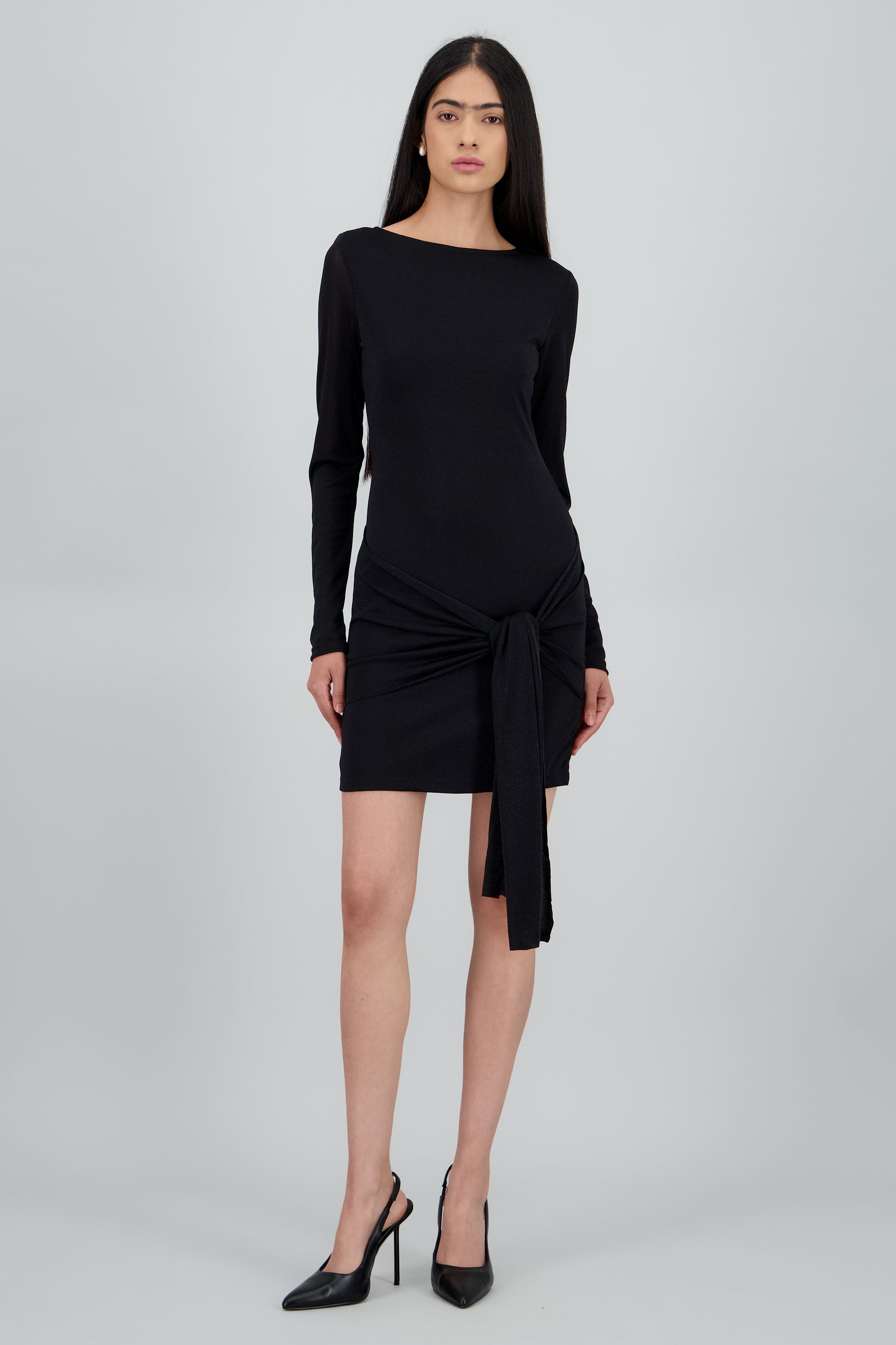 Vestido con detalle de nudo en la cintura y manga larga; corte entallado, escote recto y manga larga.