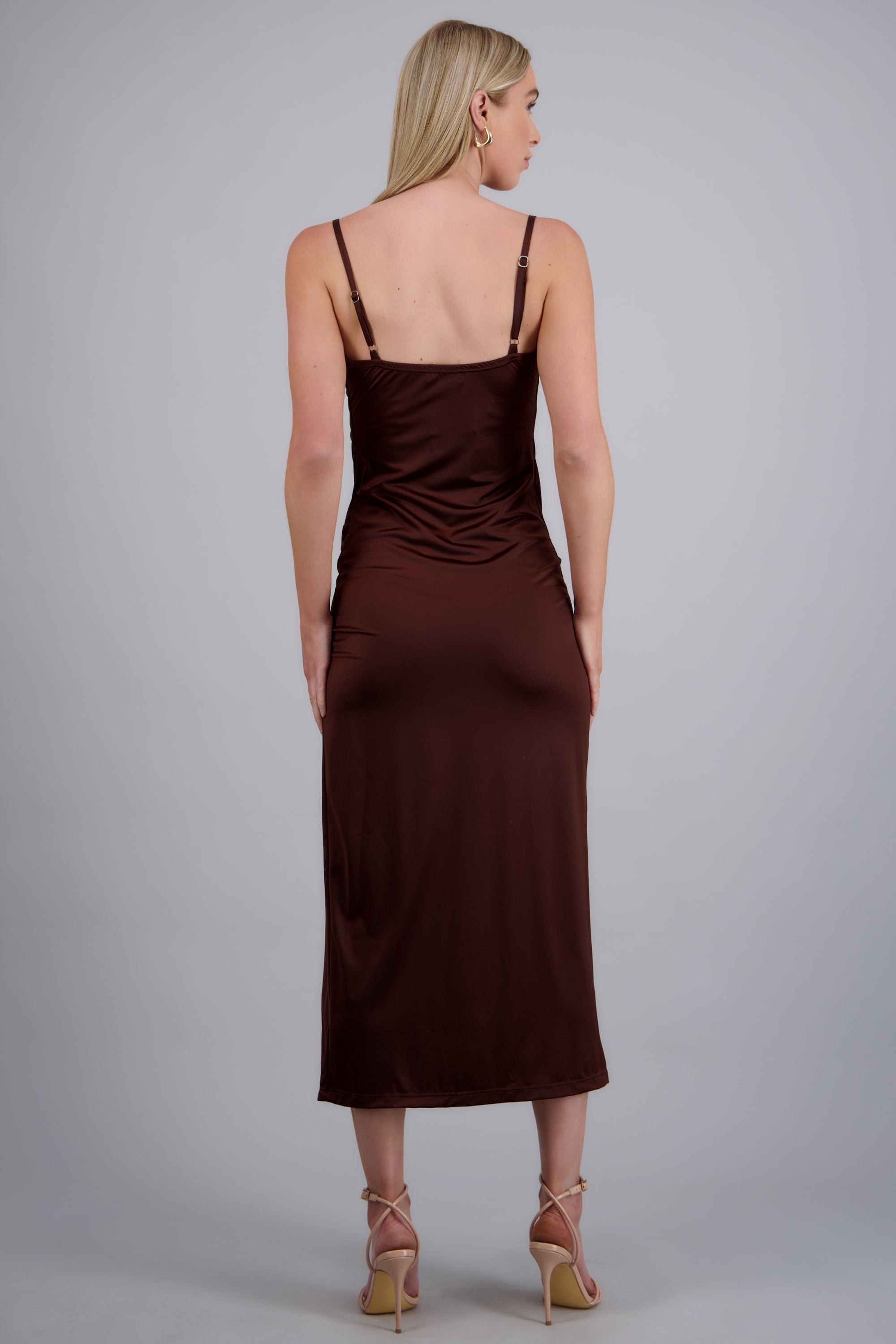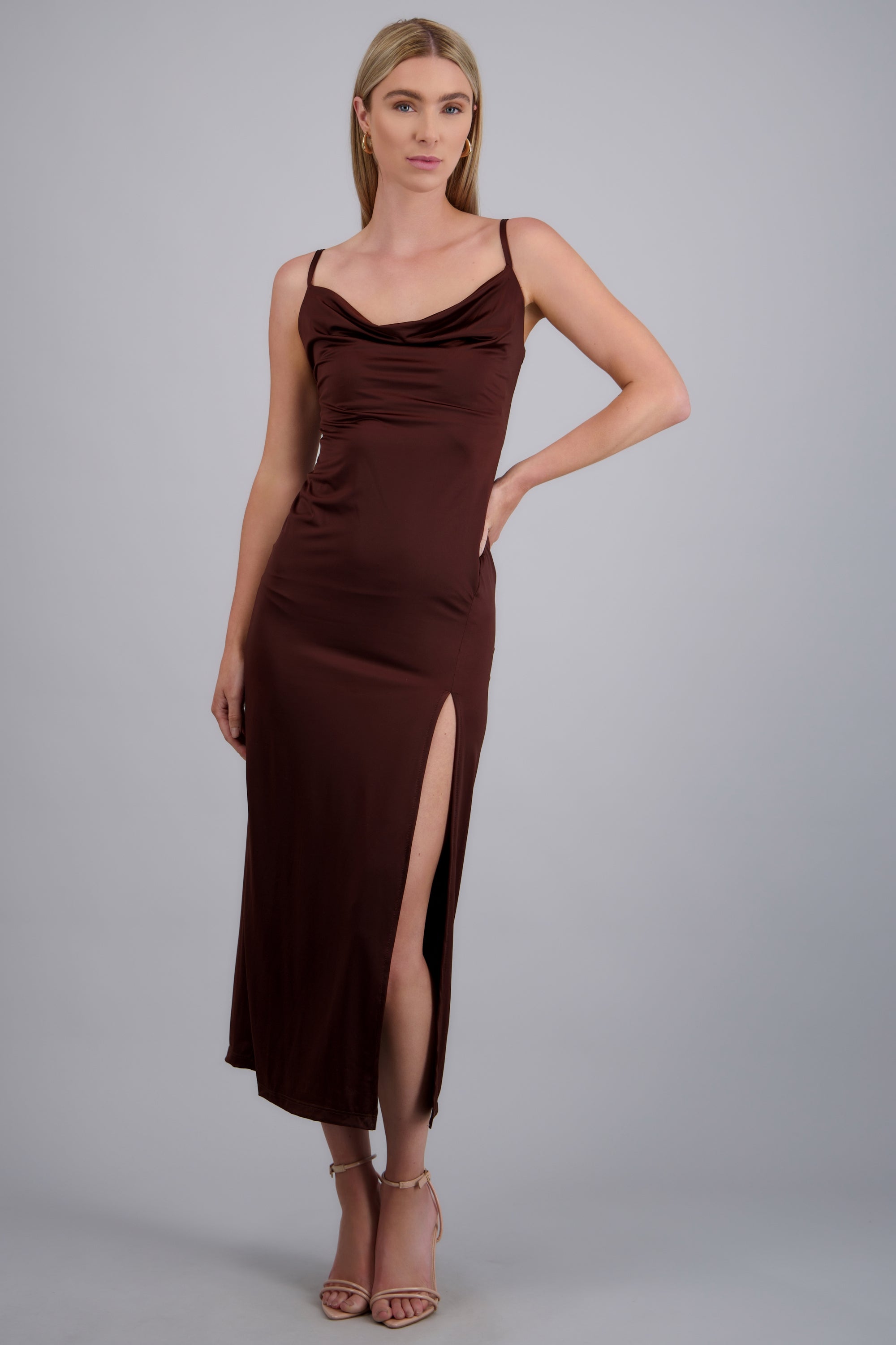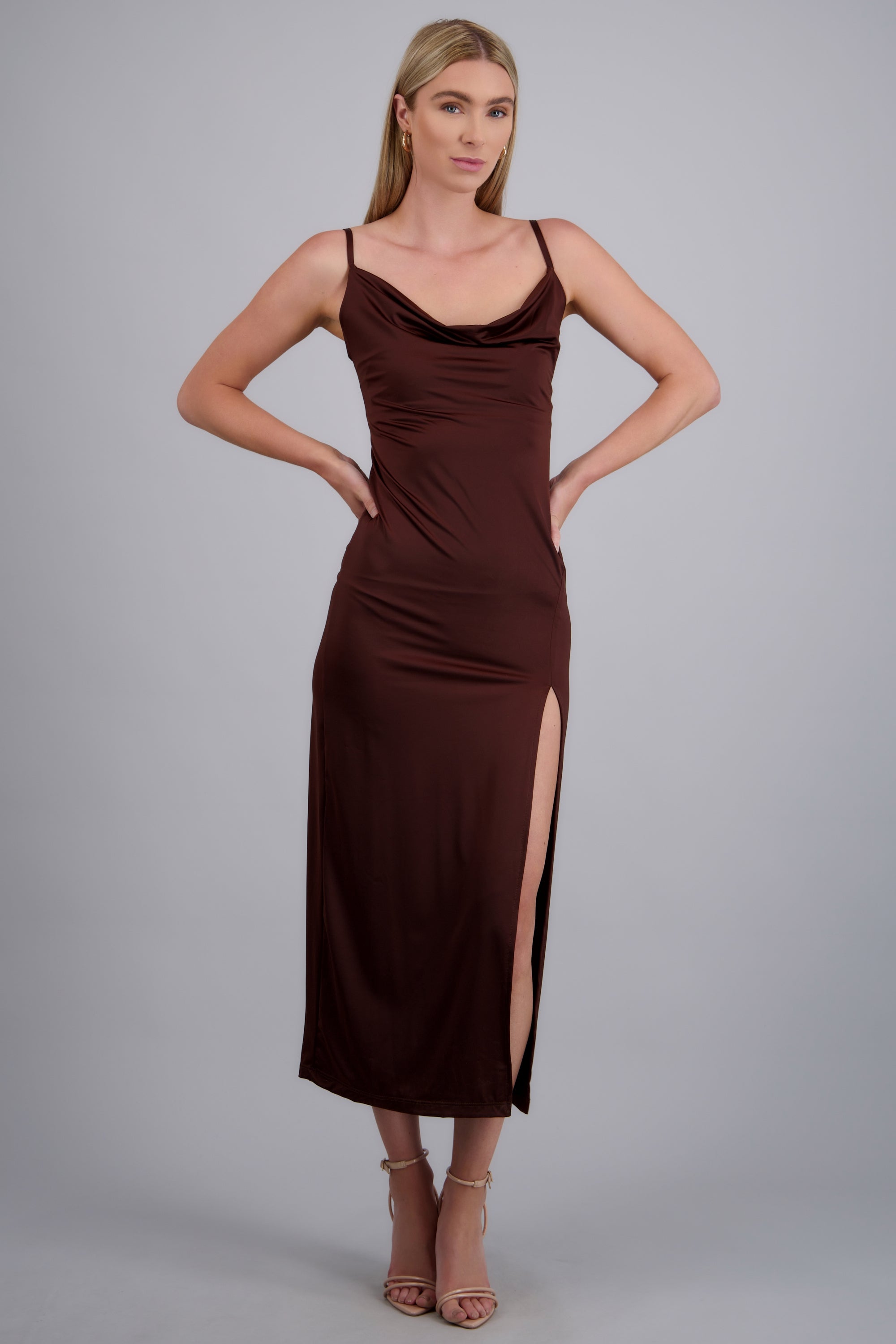 Vestido con escote columpio, abertura lateral y tirantes ajustables.