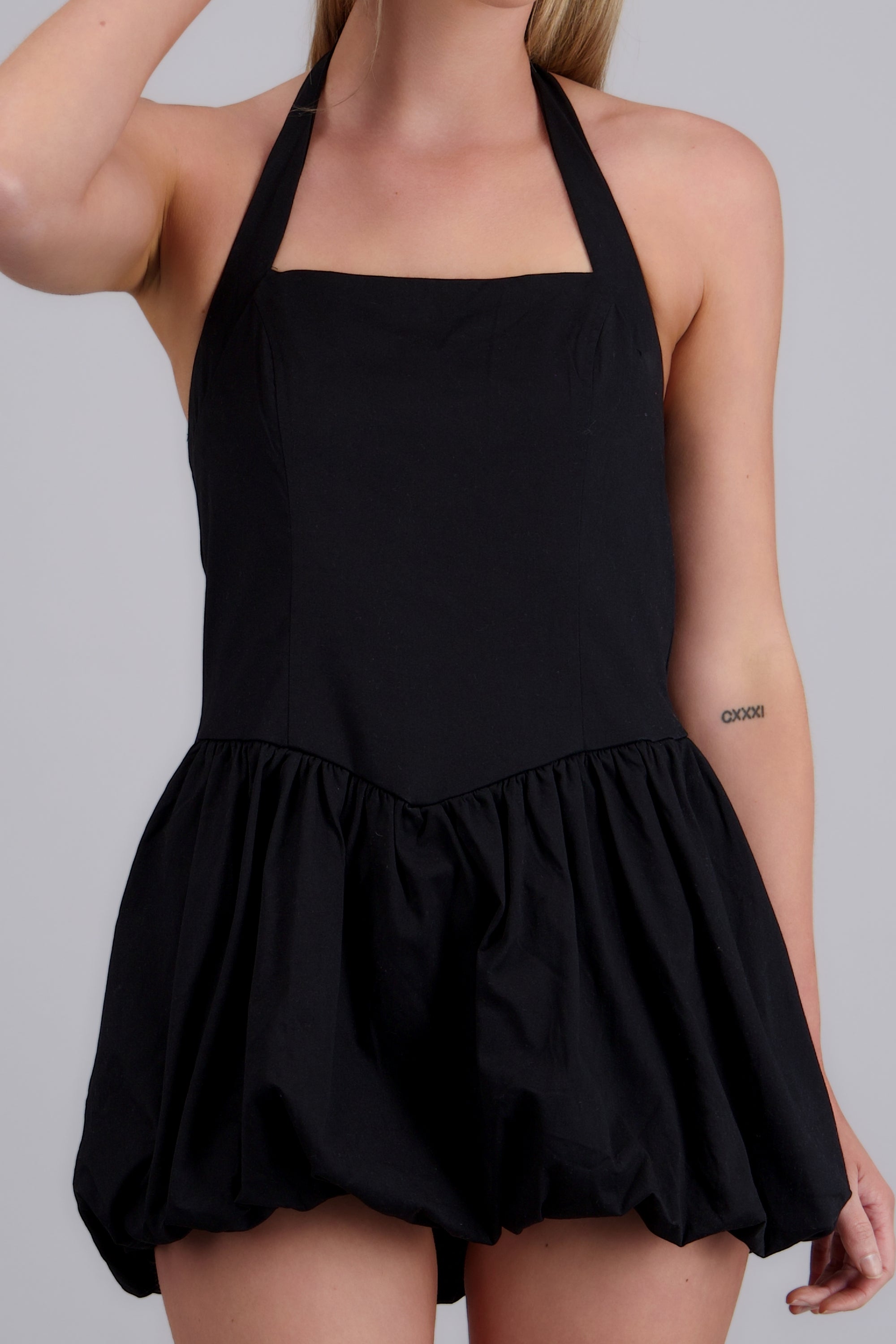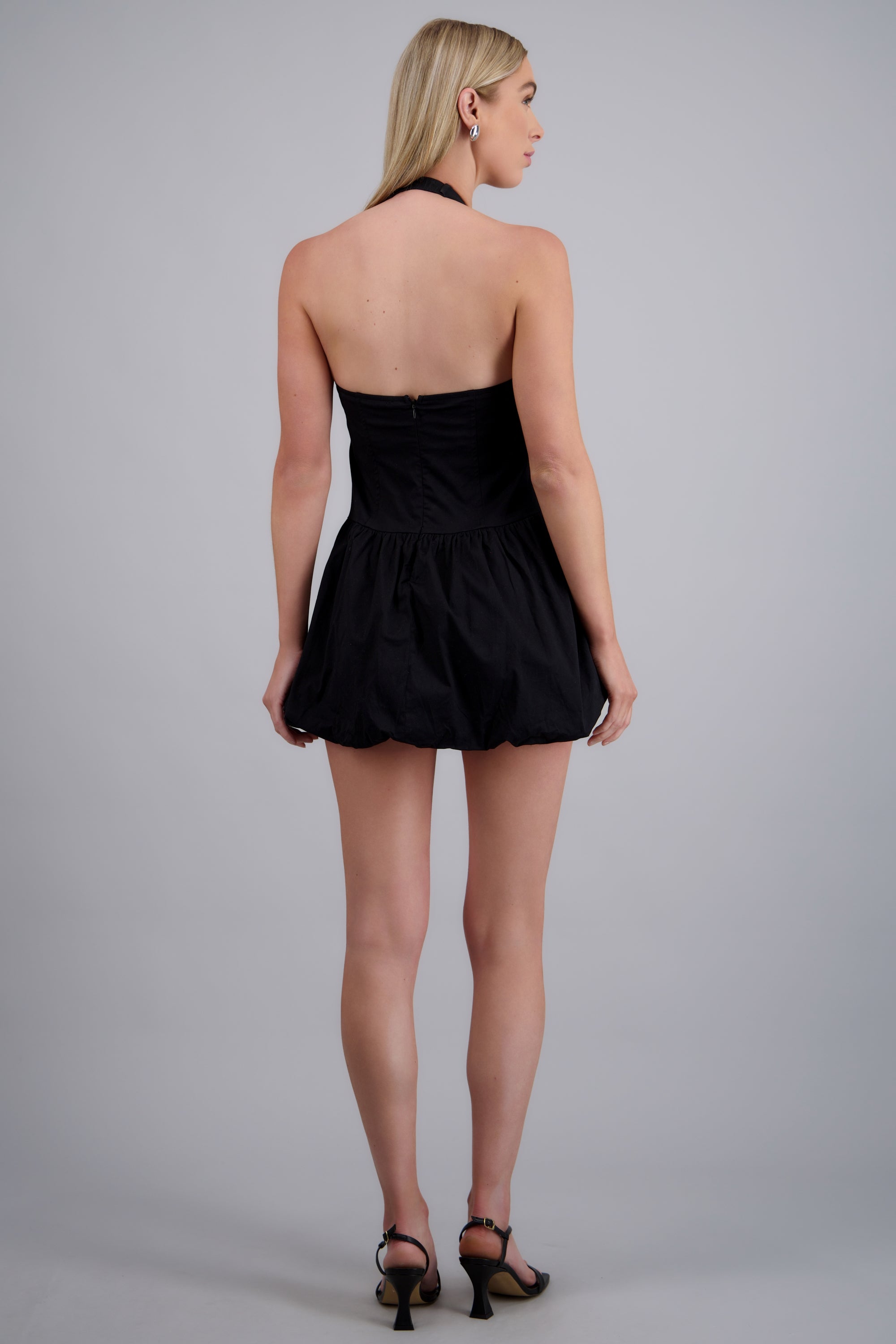 Vestido con diseño halter y corte tipo burbuja. Cierre posterior con cremallera.