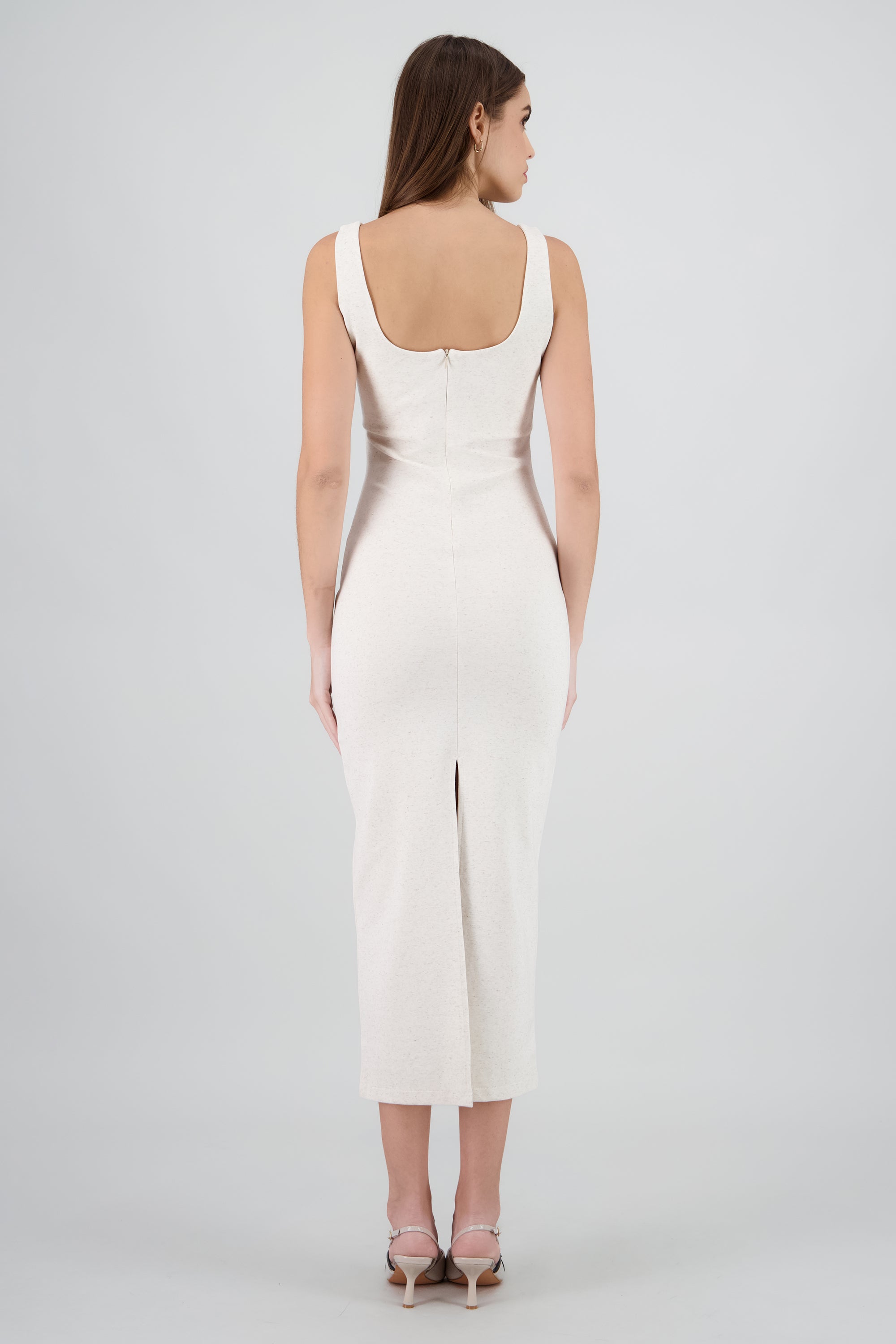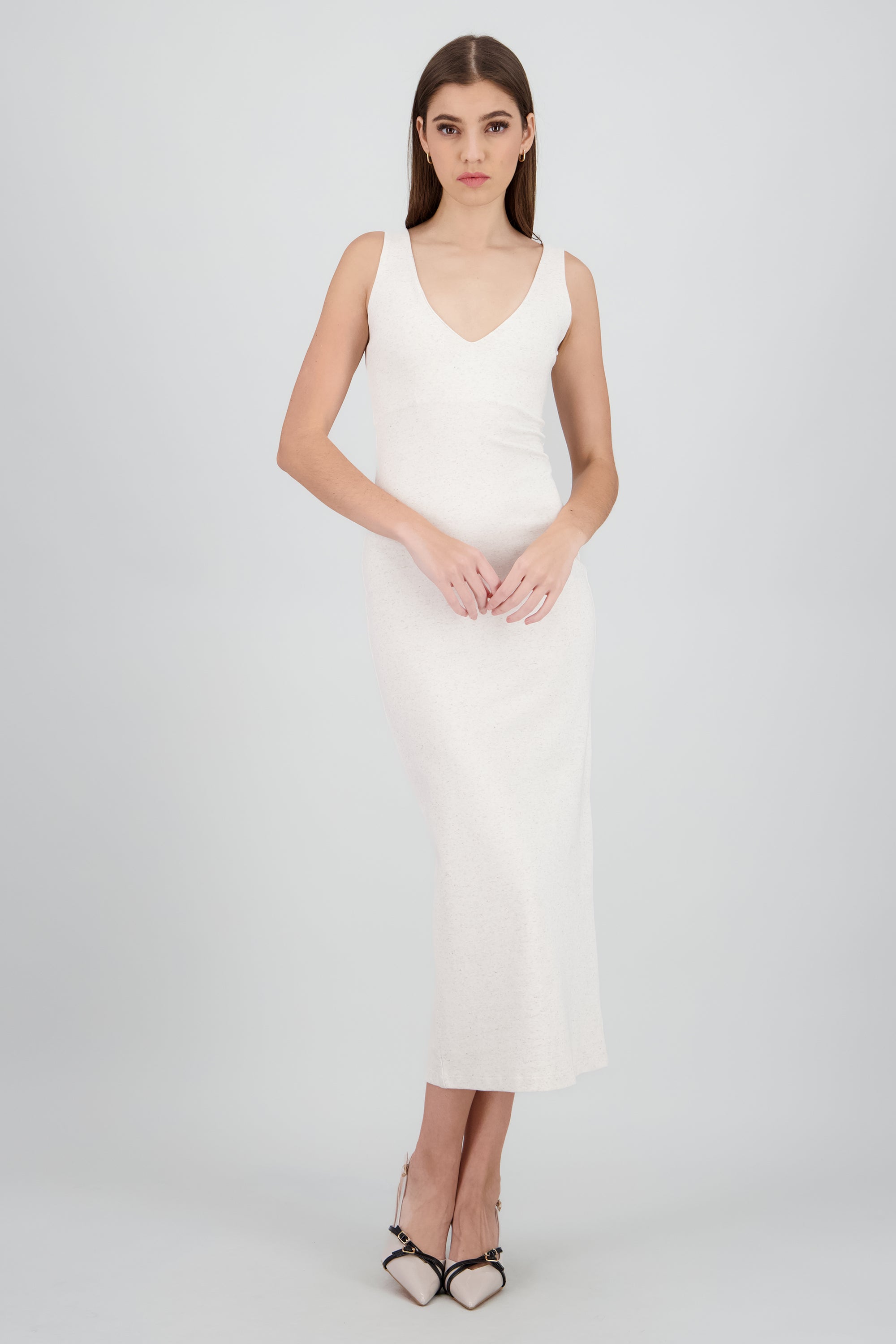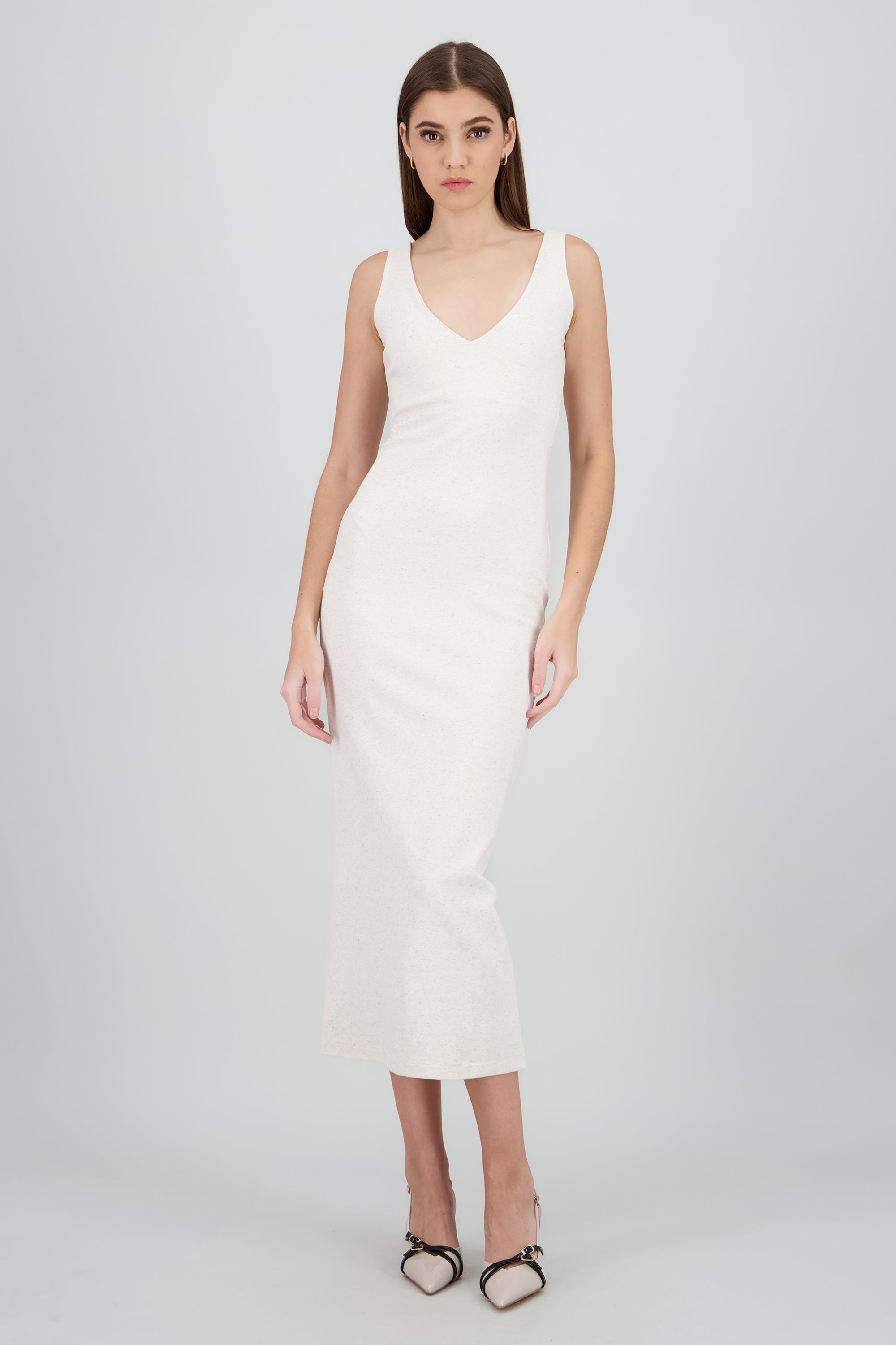 Maxi vestido bodycon, escote en V, corte ajustado, diseño chic y minimalista.