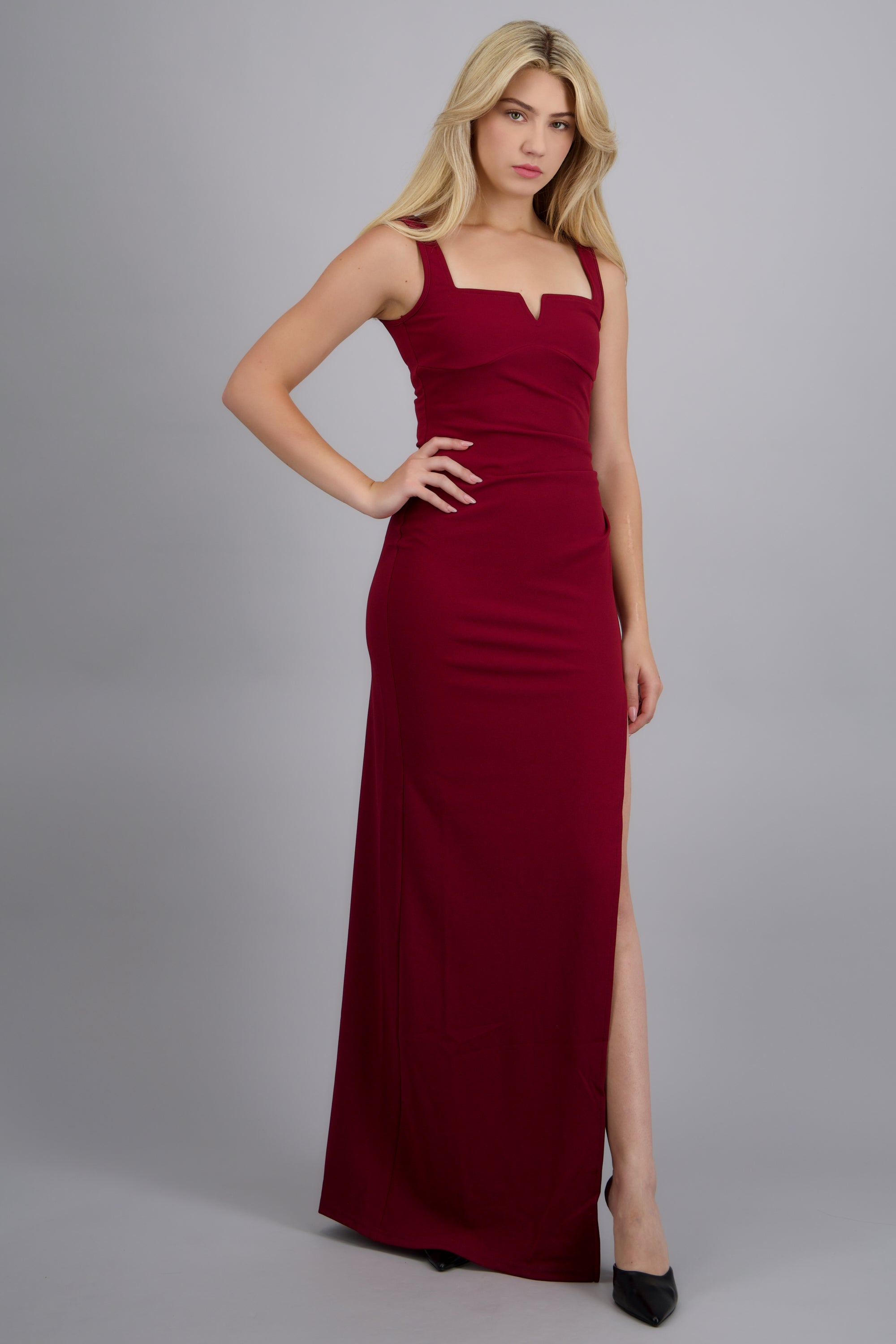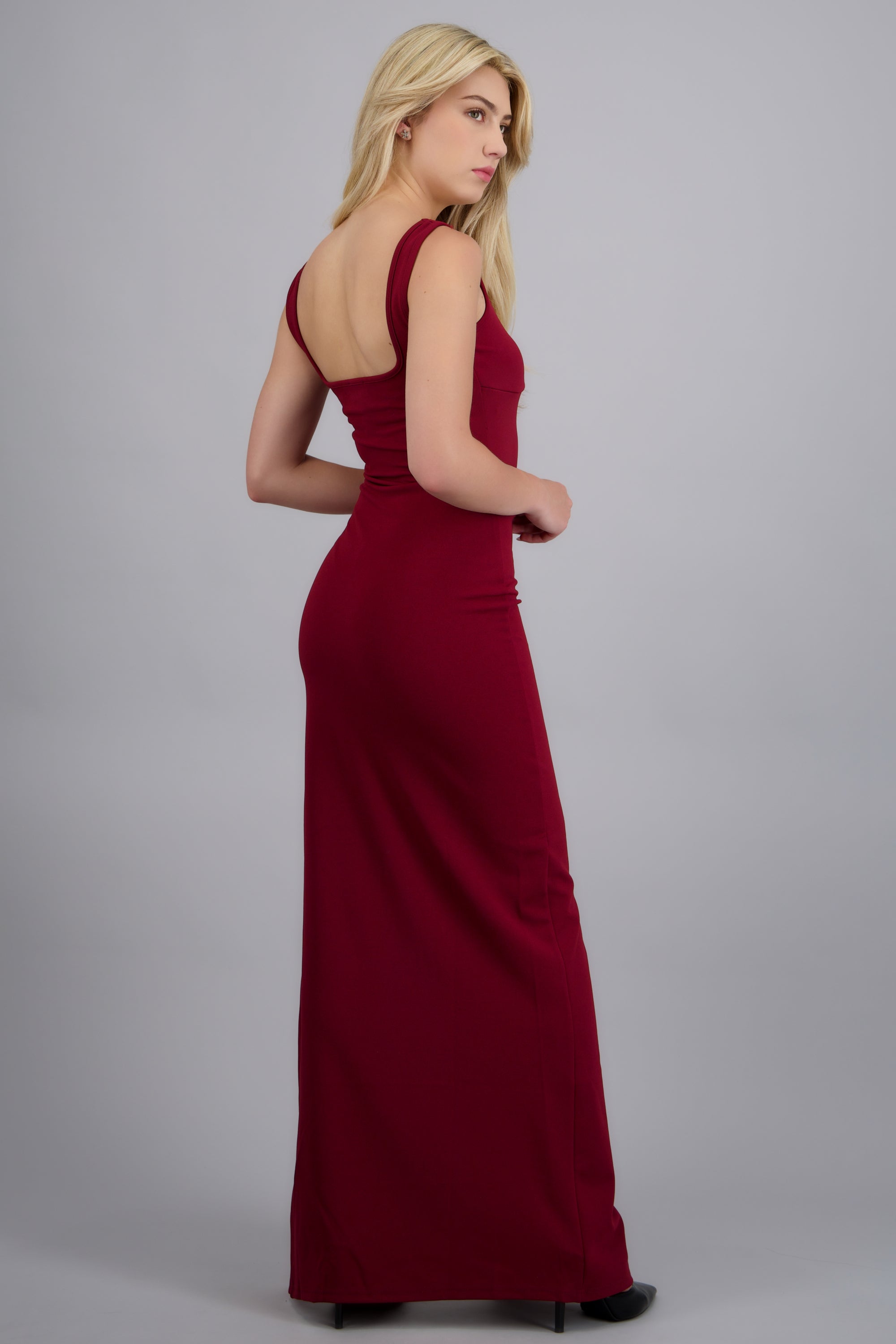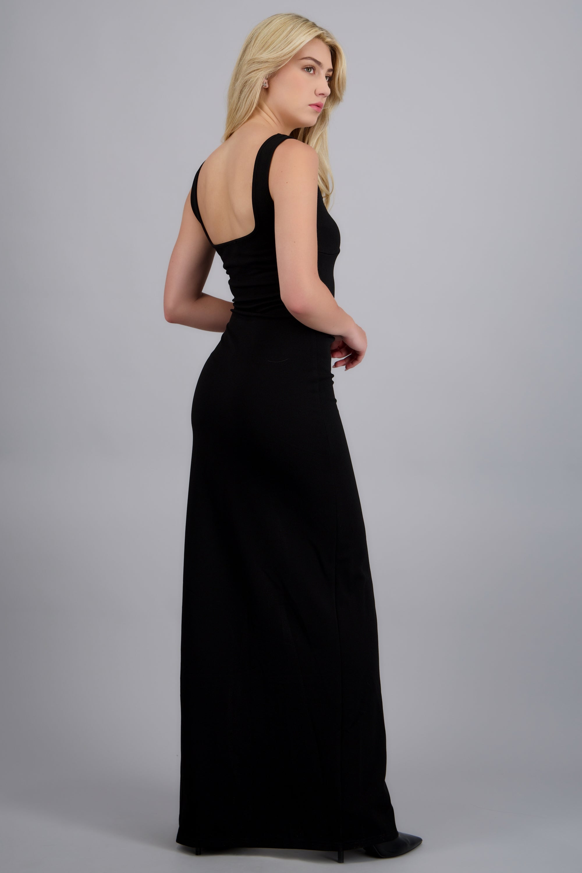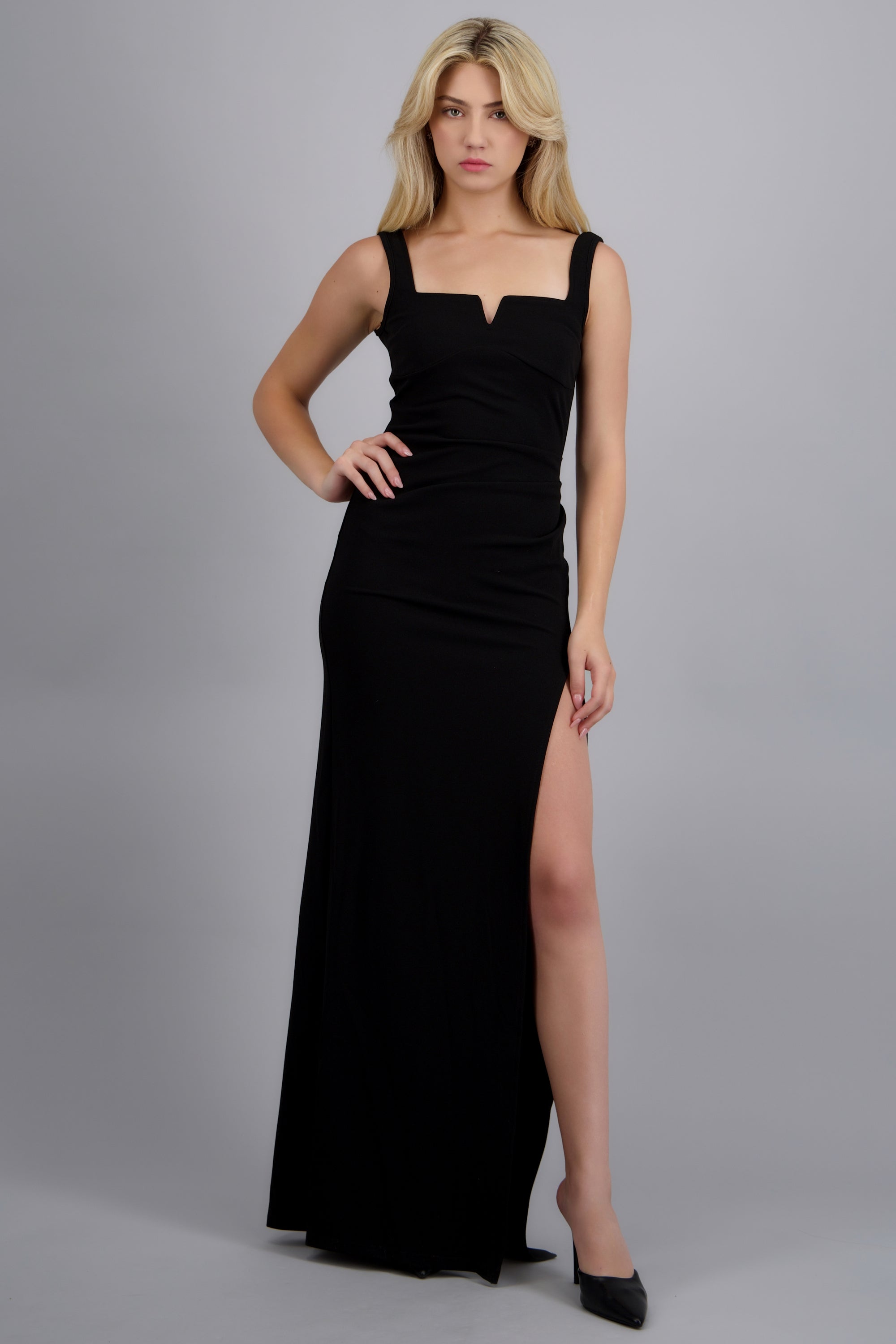 Vestido maxi con abertura lateral, corte ajustado, tirantes anchos y escote cuadrado.