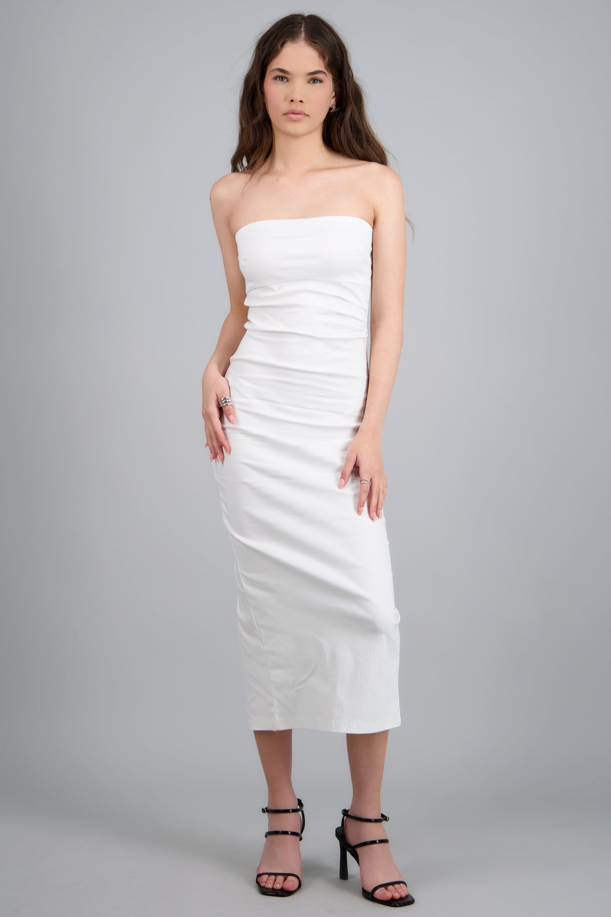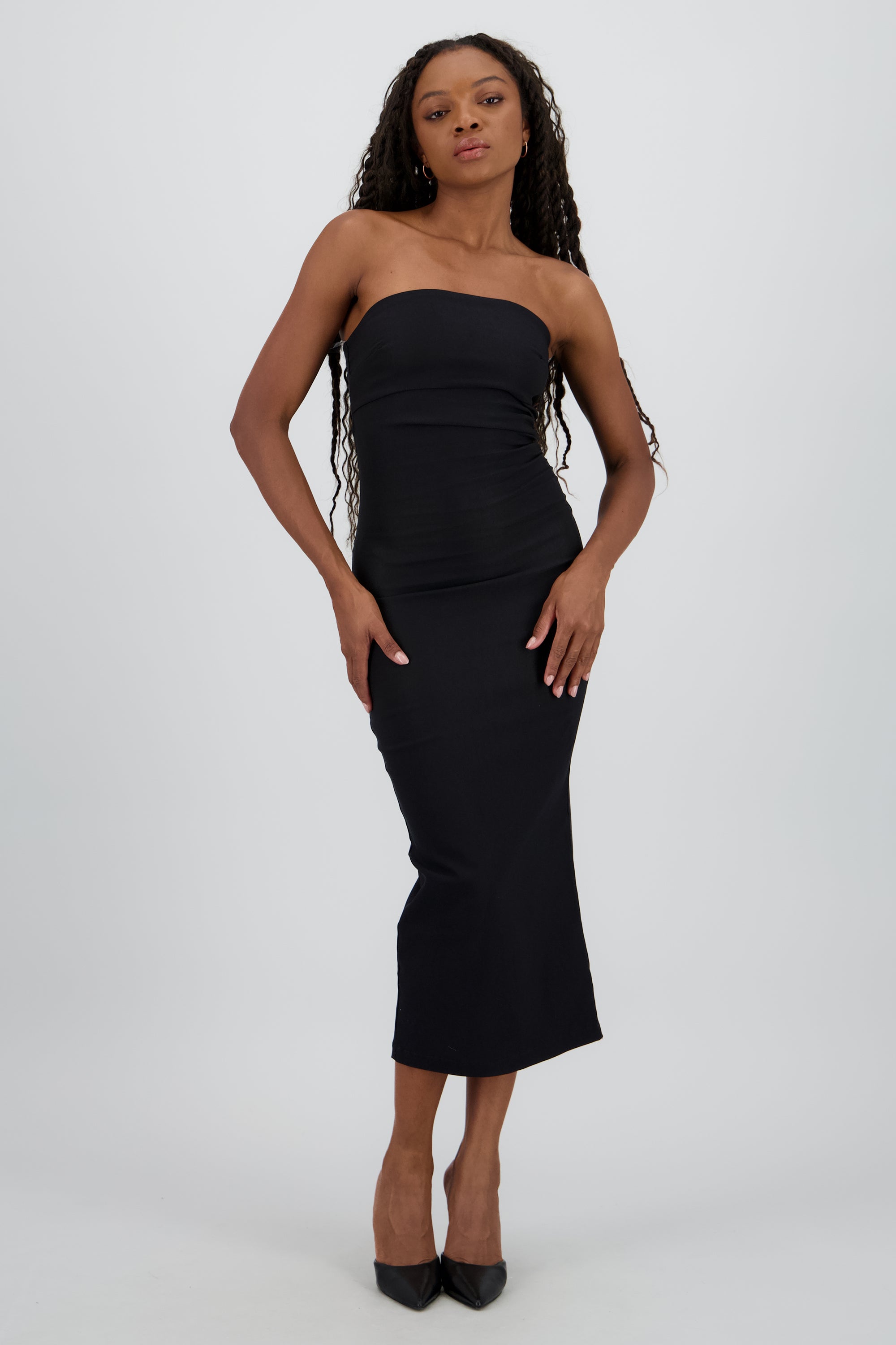 Vestido maxi strapless drapeado hypsters
