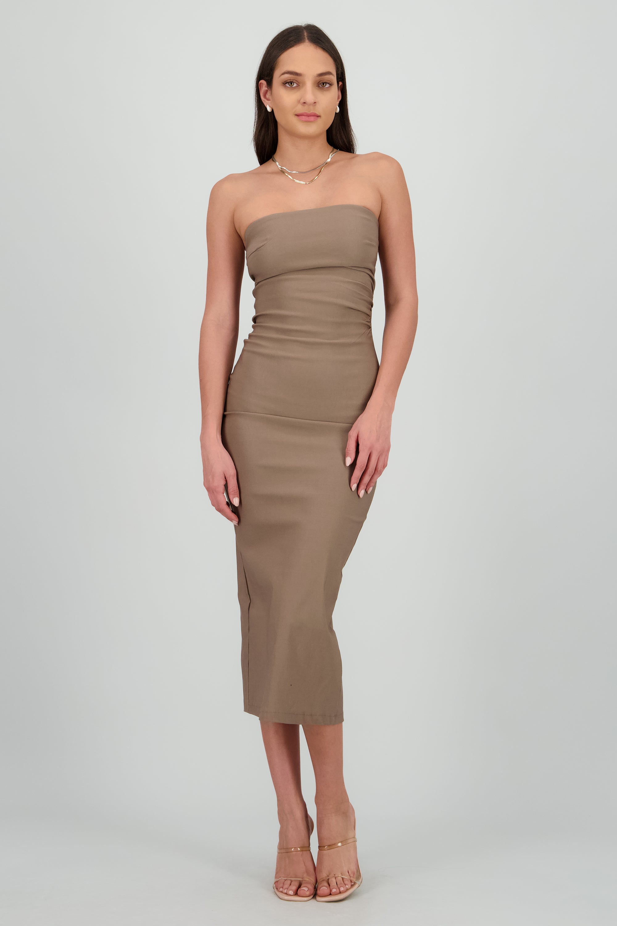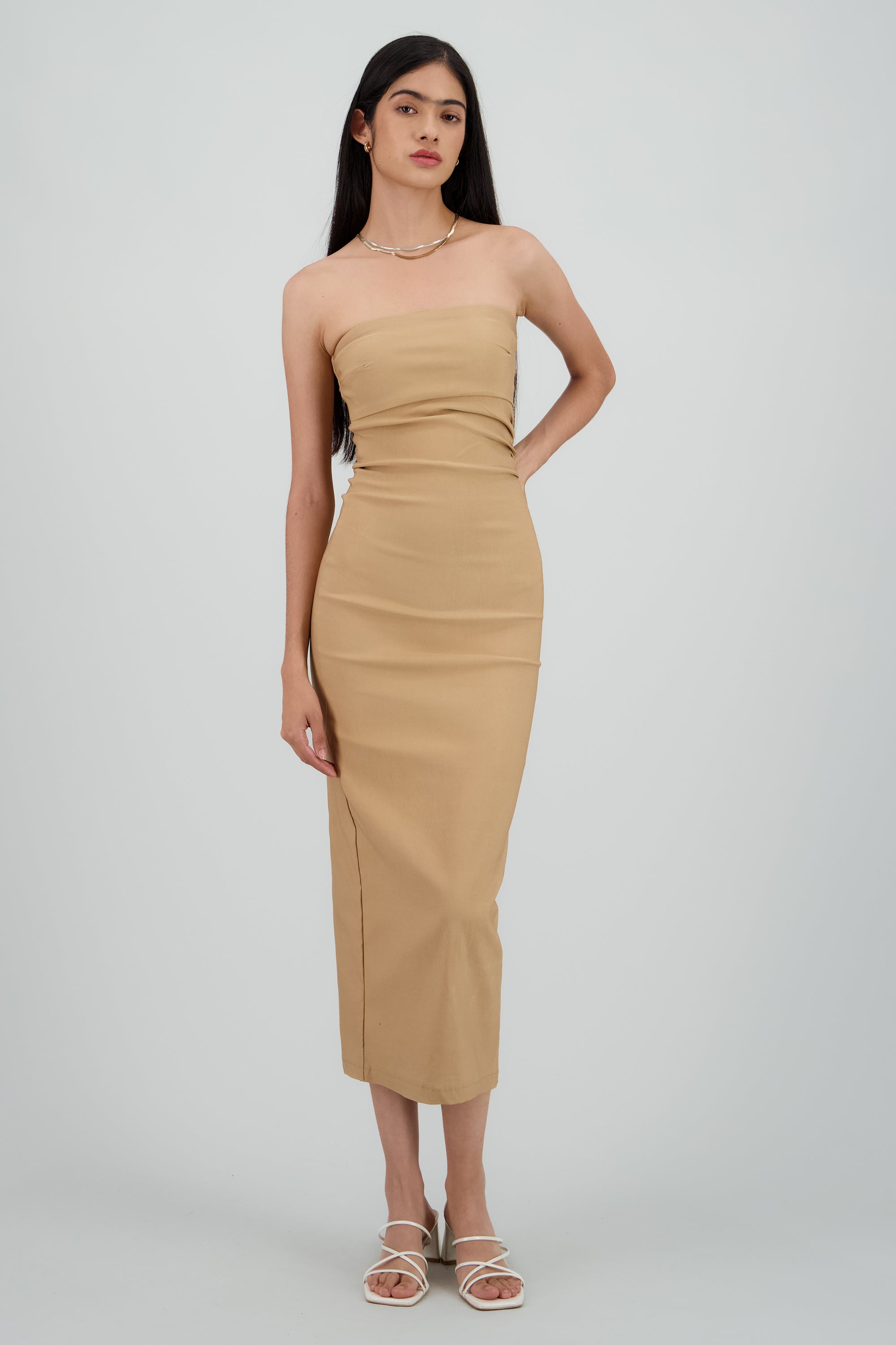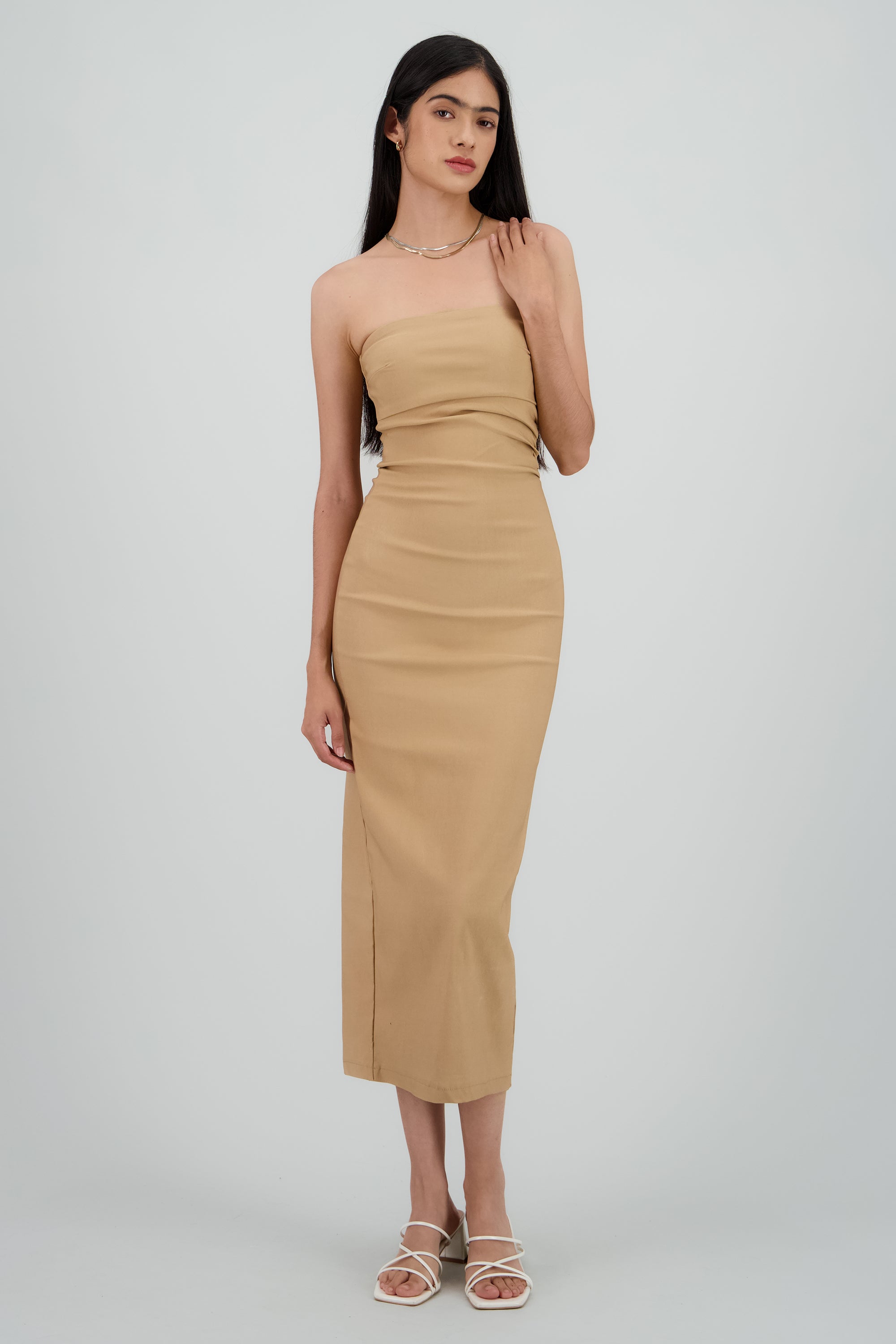 Vestido maxi off shoulder drapeado, diseño chic con caída fluida.