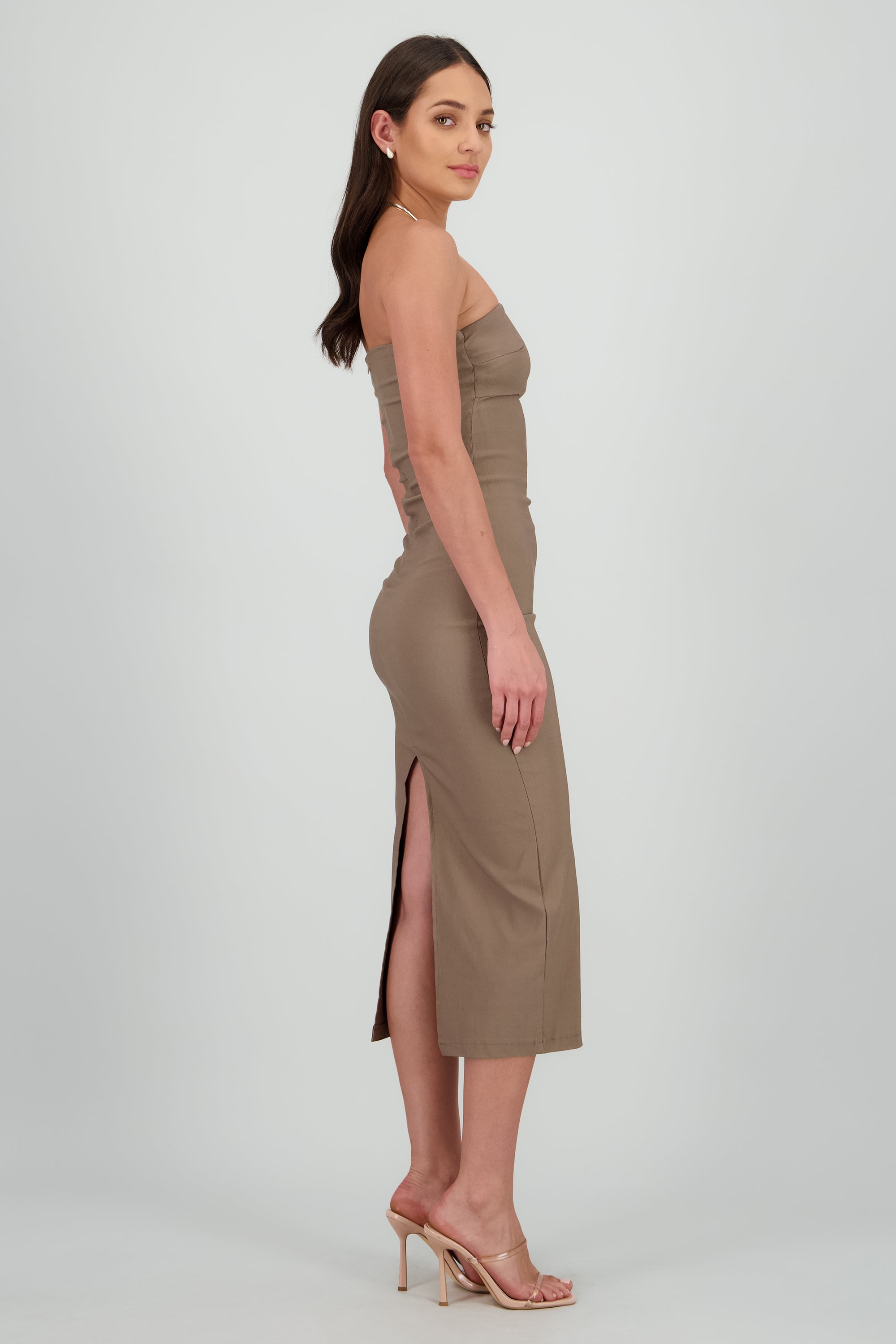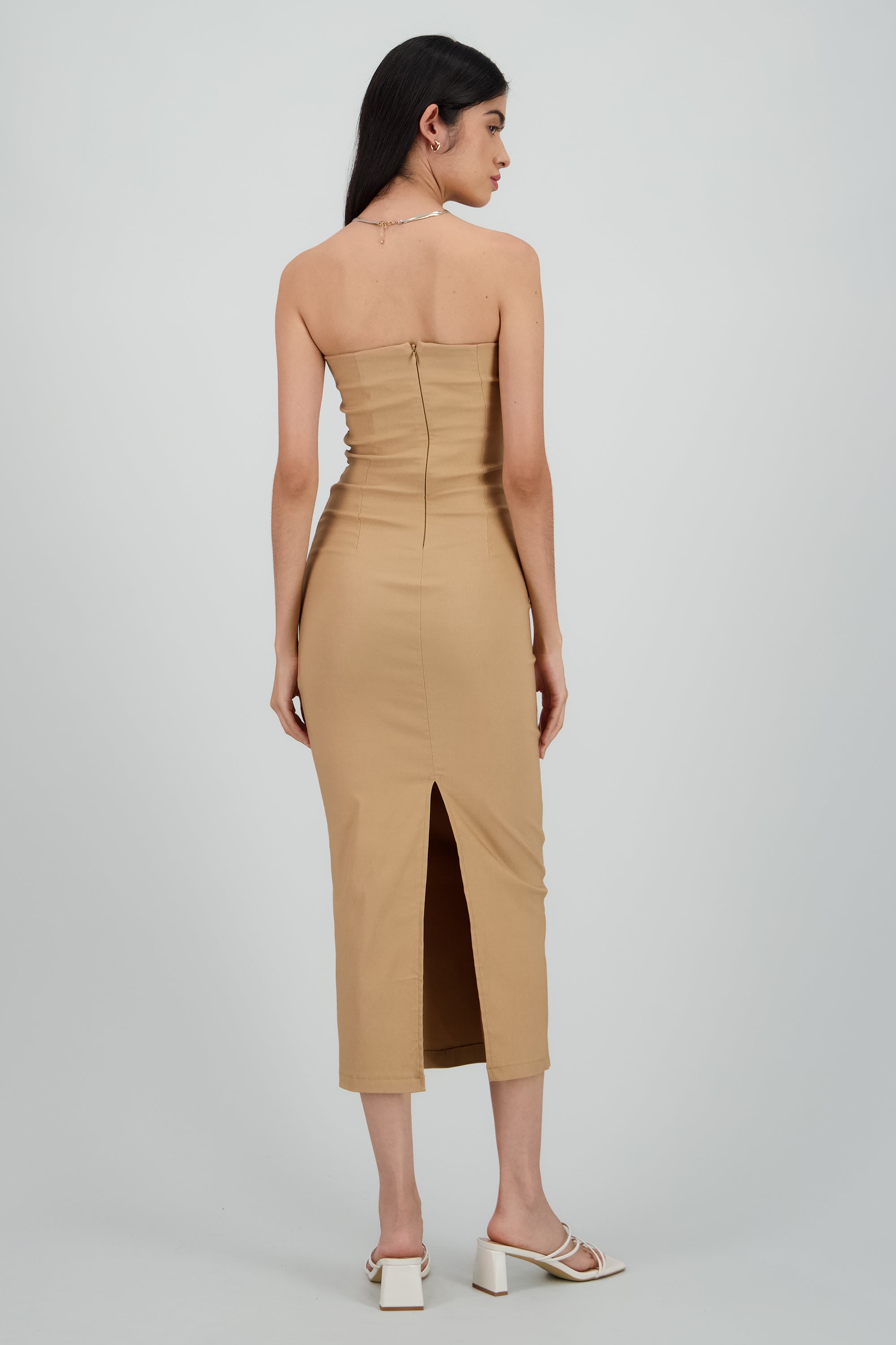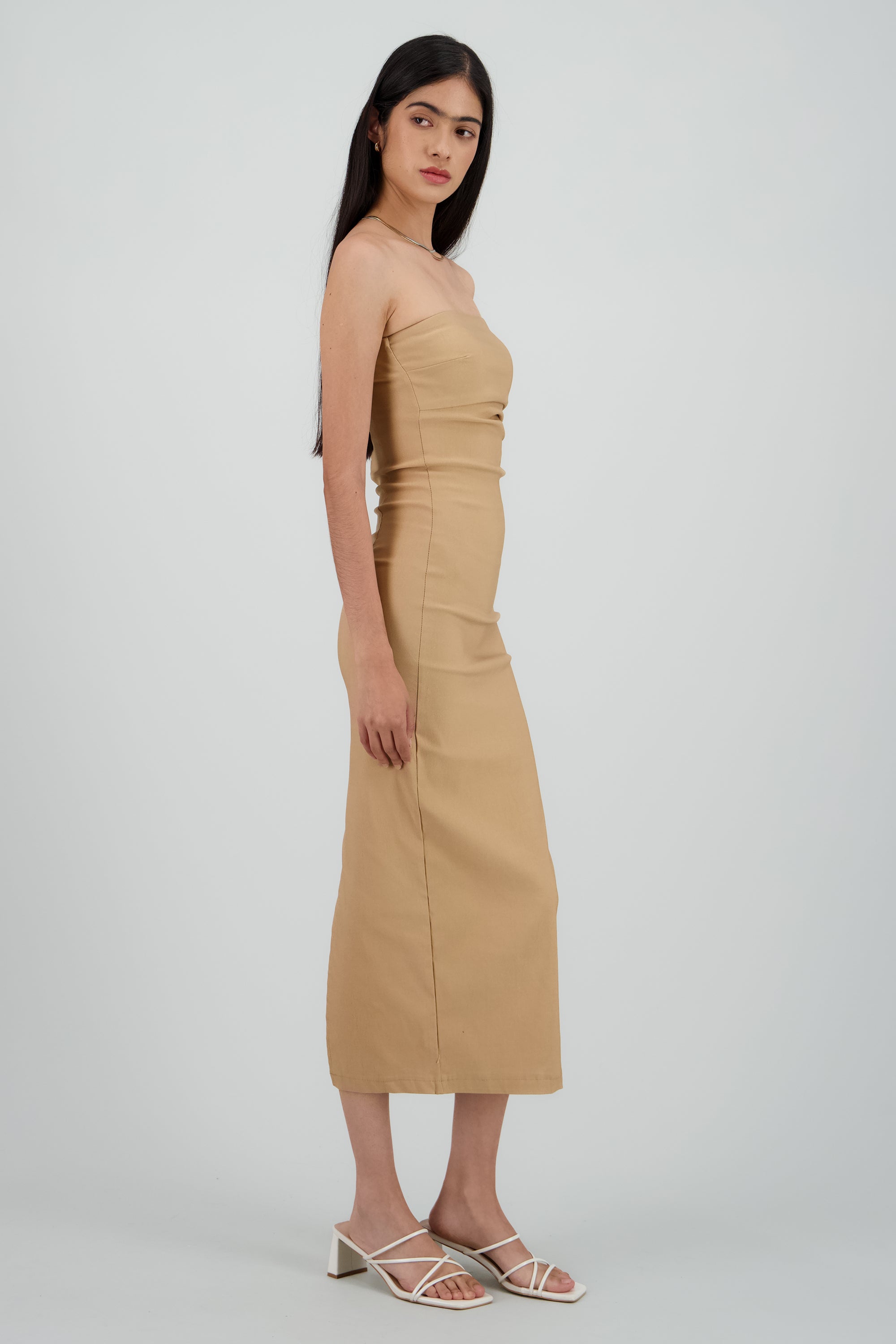 Vestido maxi off shoulder drapeado, diseño chic con caída fluida.